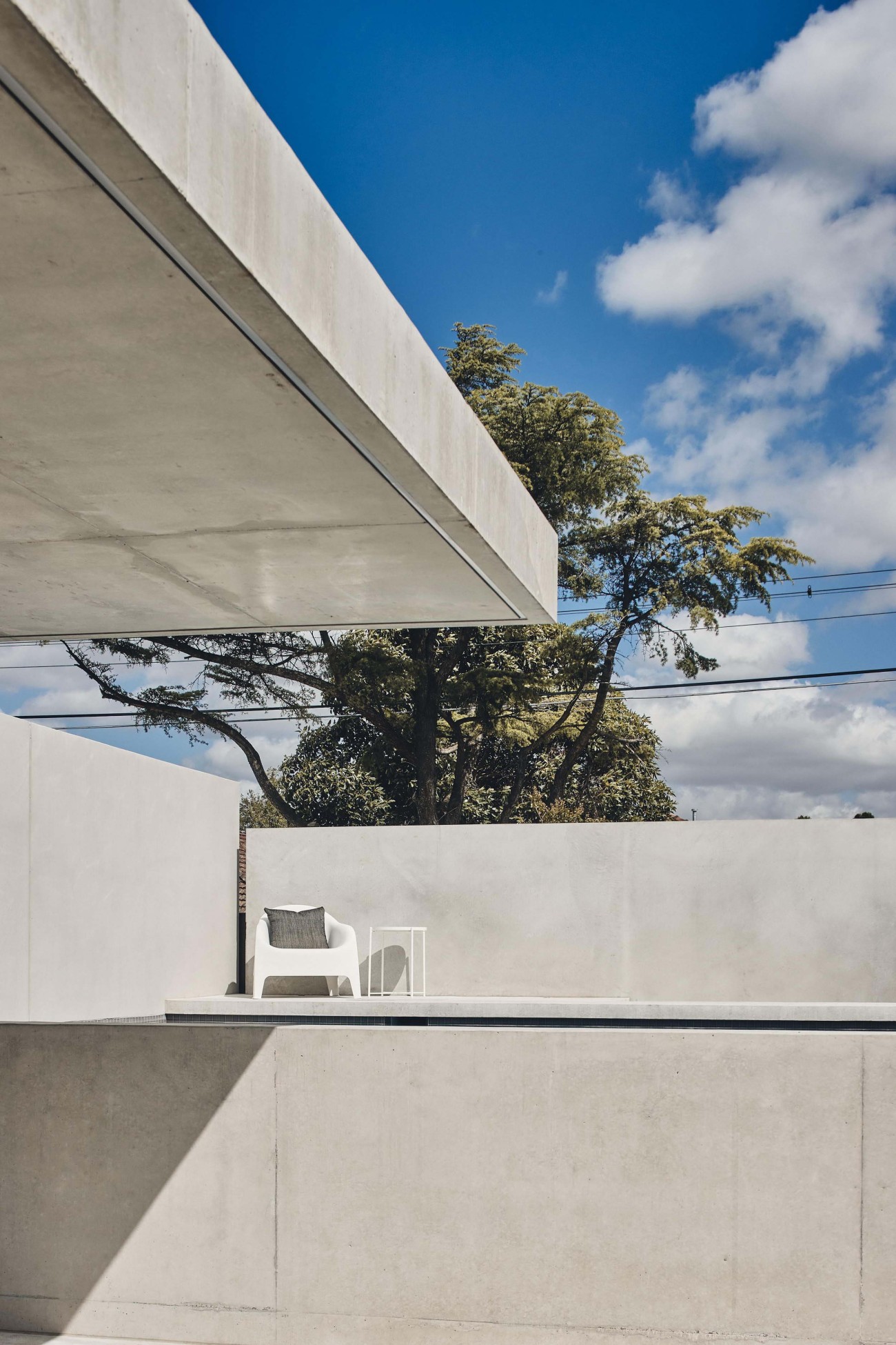 Concrete walls and overhangs are incorporated for shade and shelter. This design vocabulary of burnished, creamy, concrete finishes flows inside to out often appearing almost luminous in its sculptural force.