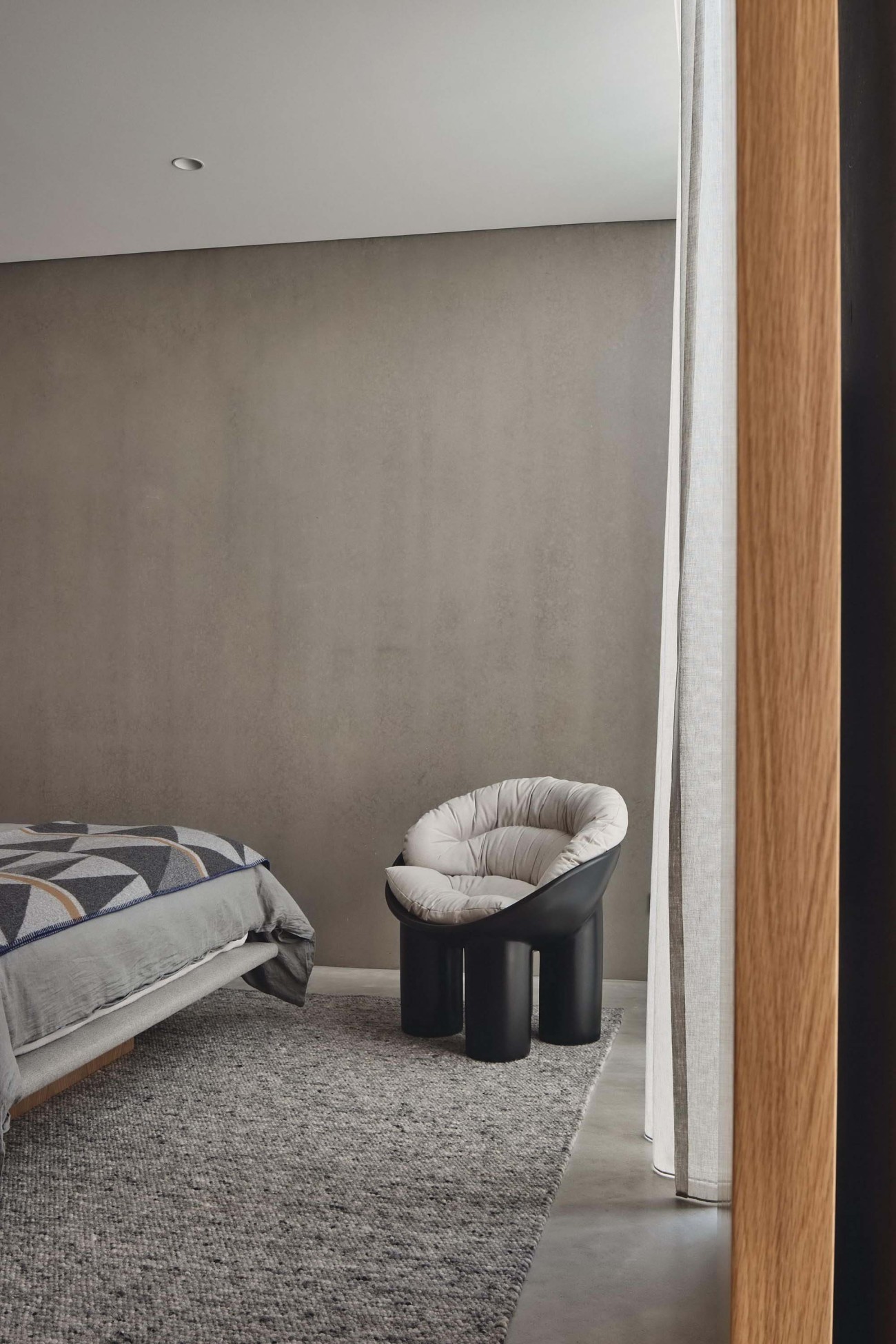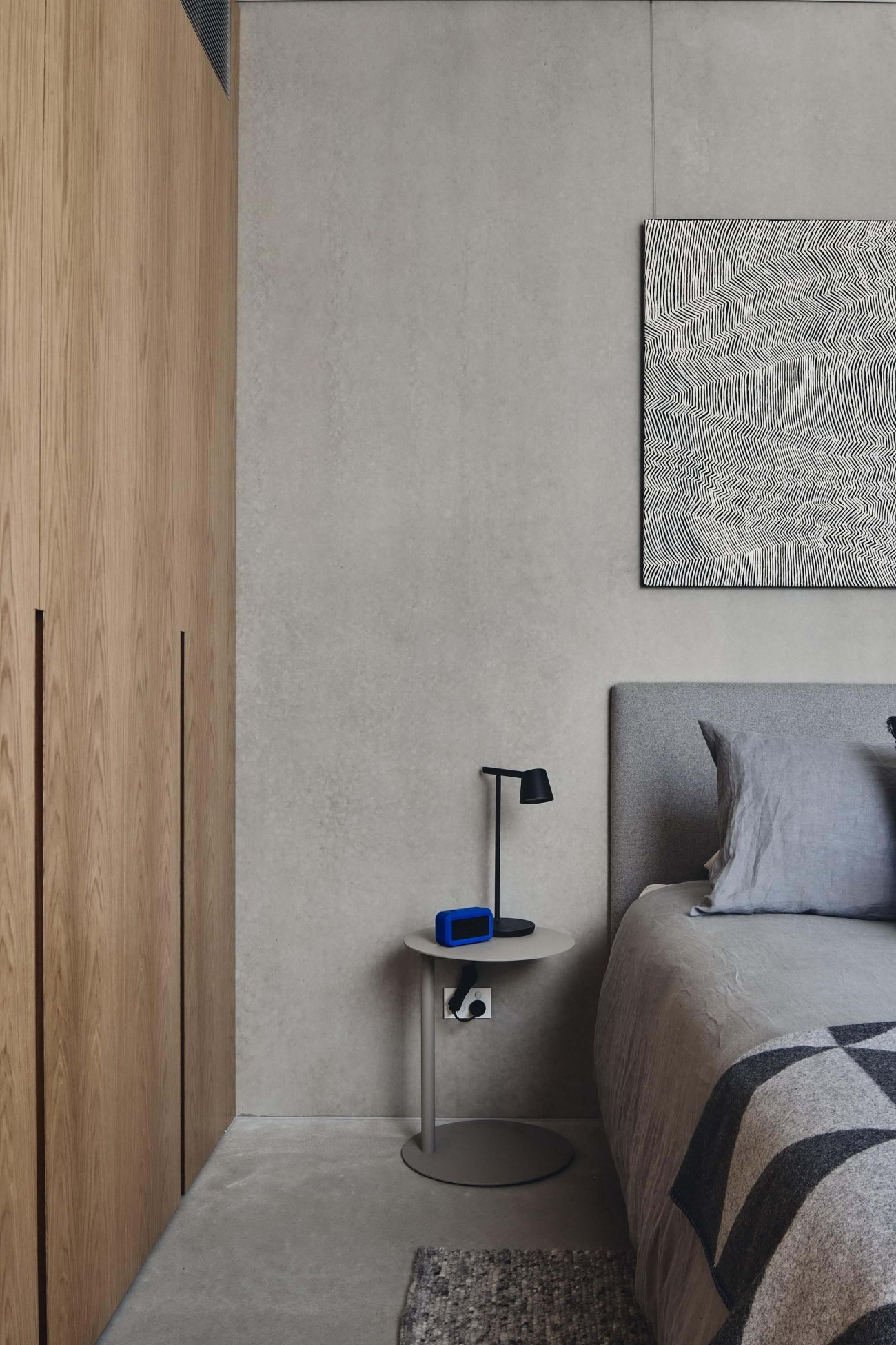 混凝土几何感和定制的玻璃孔径在保证私密性的同时提供了棱镜般的乐趣。朴素建筑立面伫立于街道中,隐含的分层体量带来了更大的空间和神秘感。建筑的街景趋于内敛,然而室内却以温暖的质感诗意地绽放。