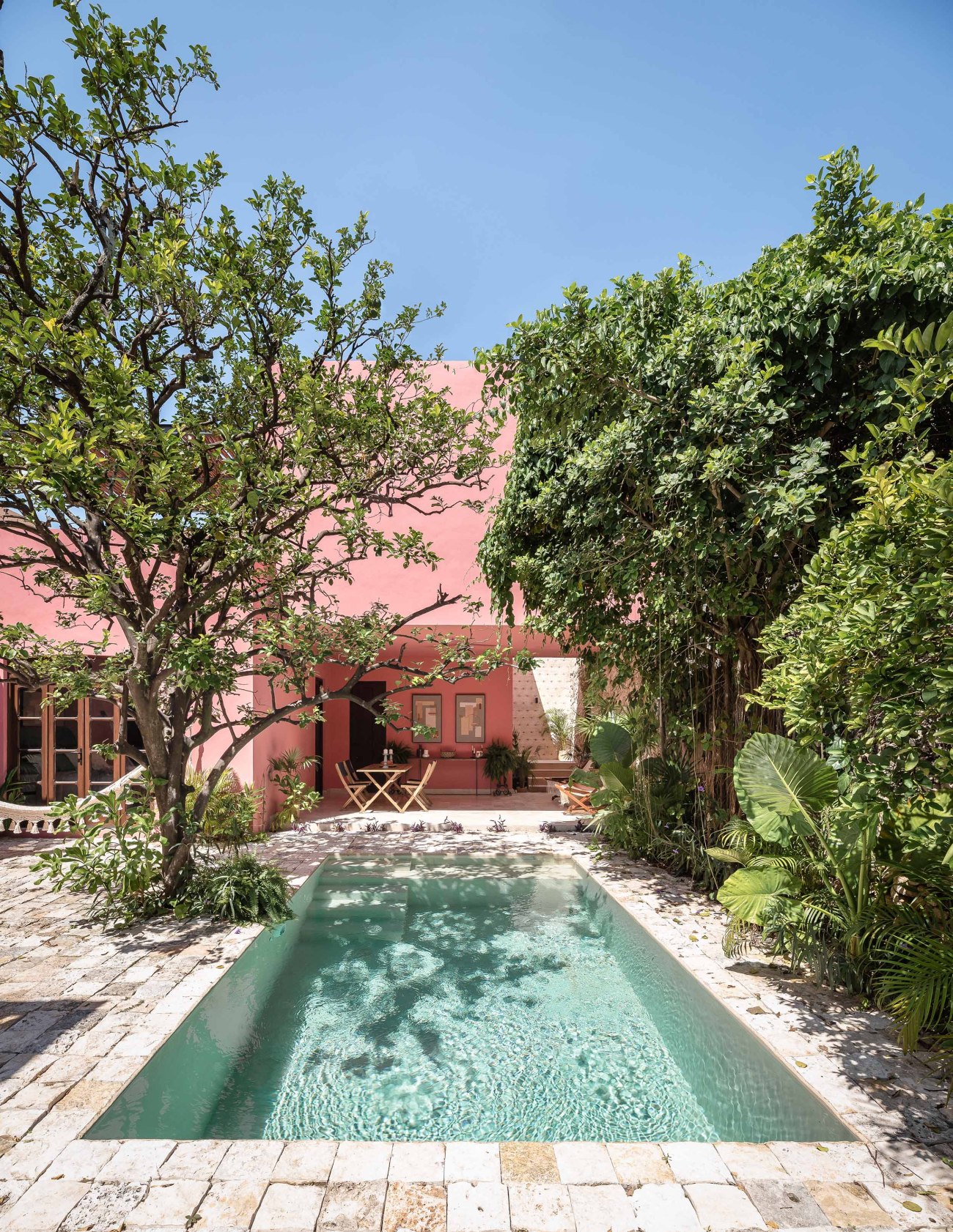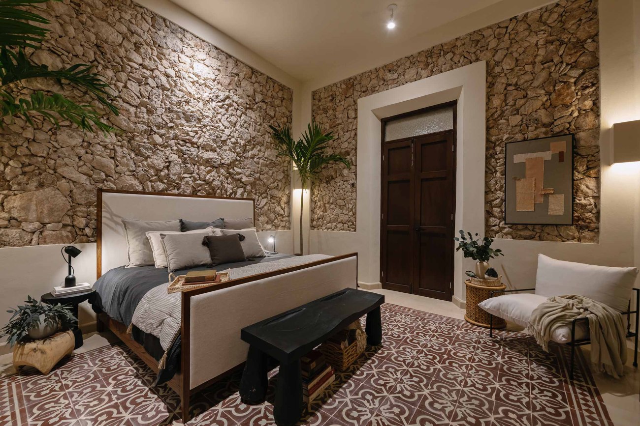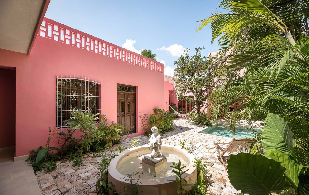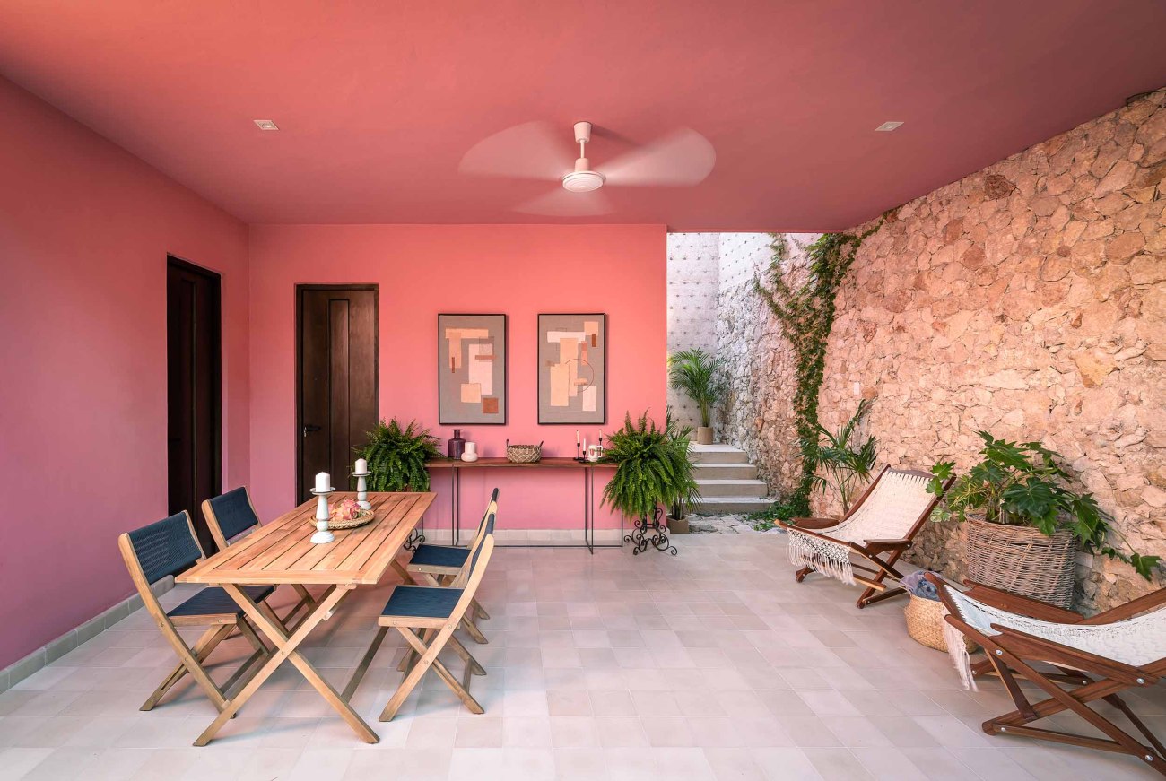 The inner courtyard intentionally breaks with the neutral colors found in the historical part of the house. The courtyard’s intense Mexican pink ties the colors of the carpentry with the tropical vegetation that surrounds the space. The stone floor symbolically links the interior with the exterior as it surrounds the chukum pool, creating the perfect environment to enjoy the warm Yucatecan climate.