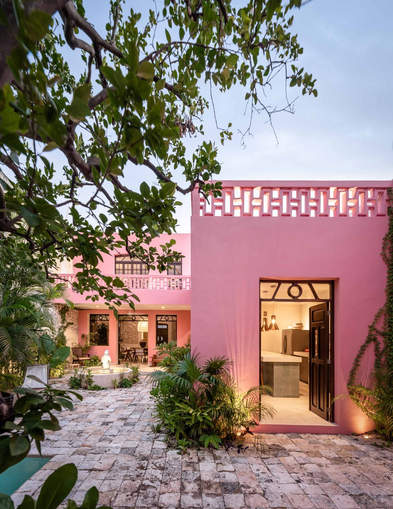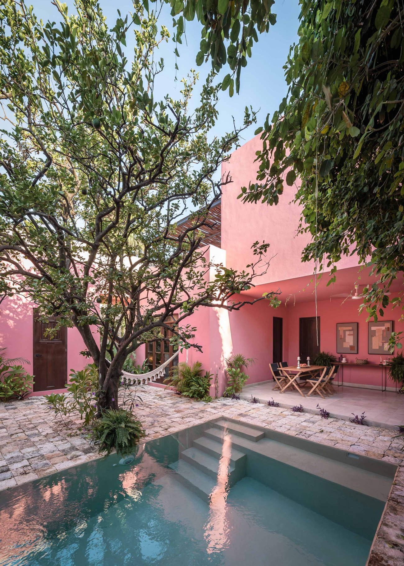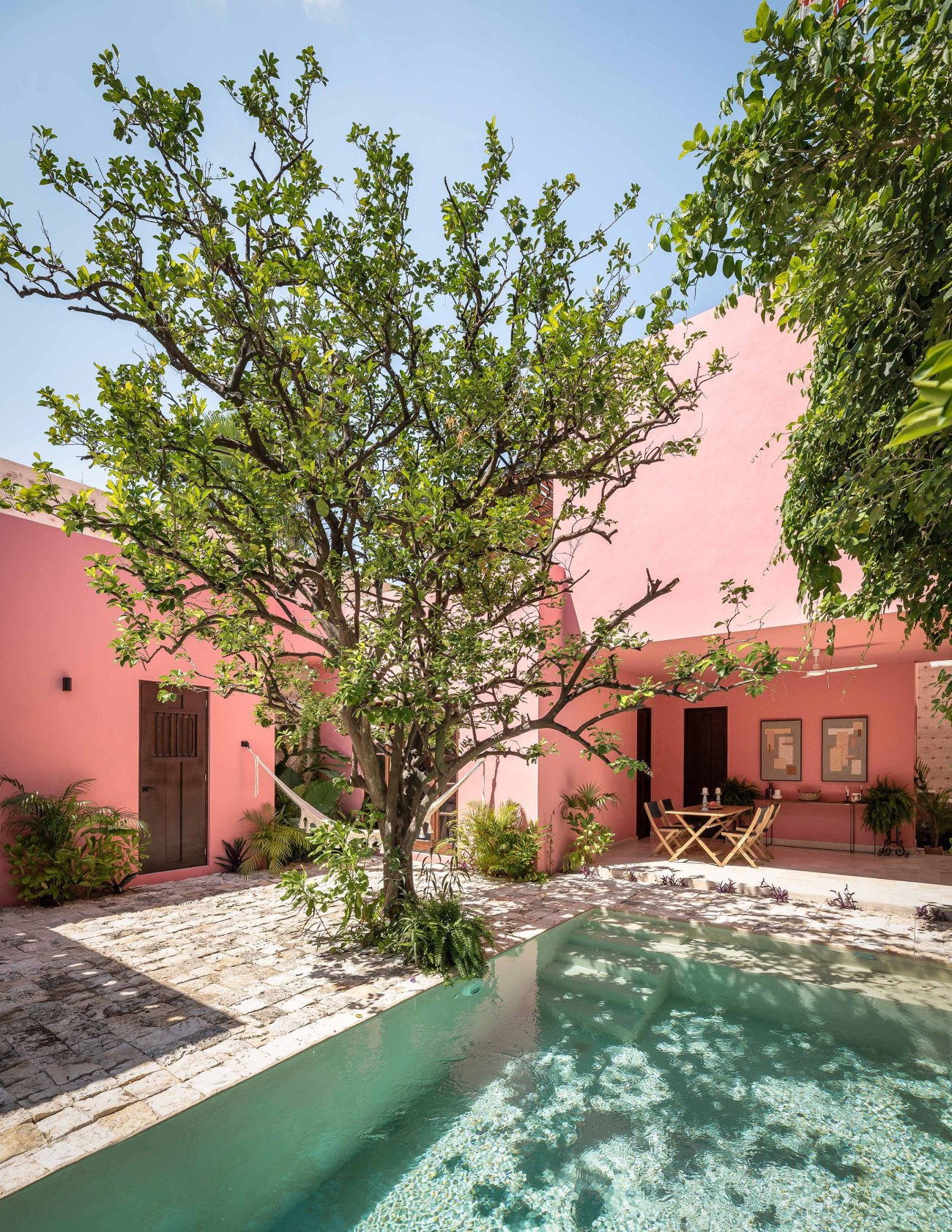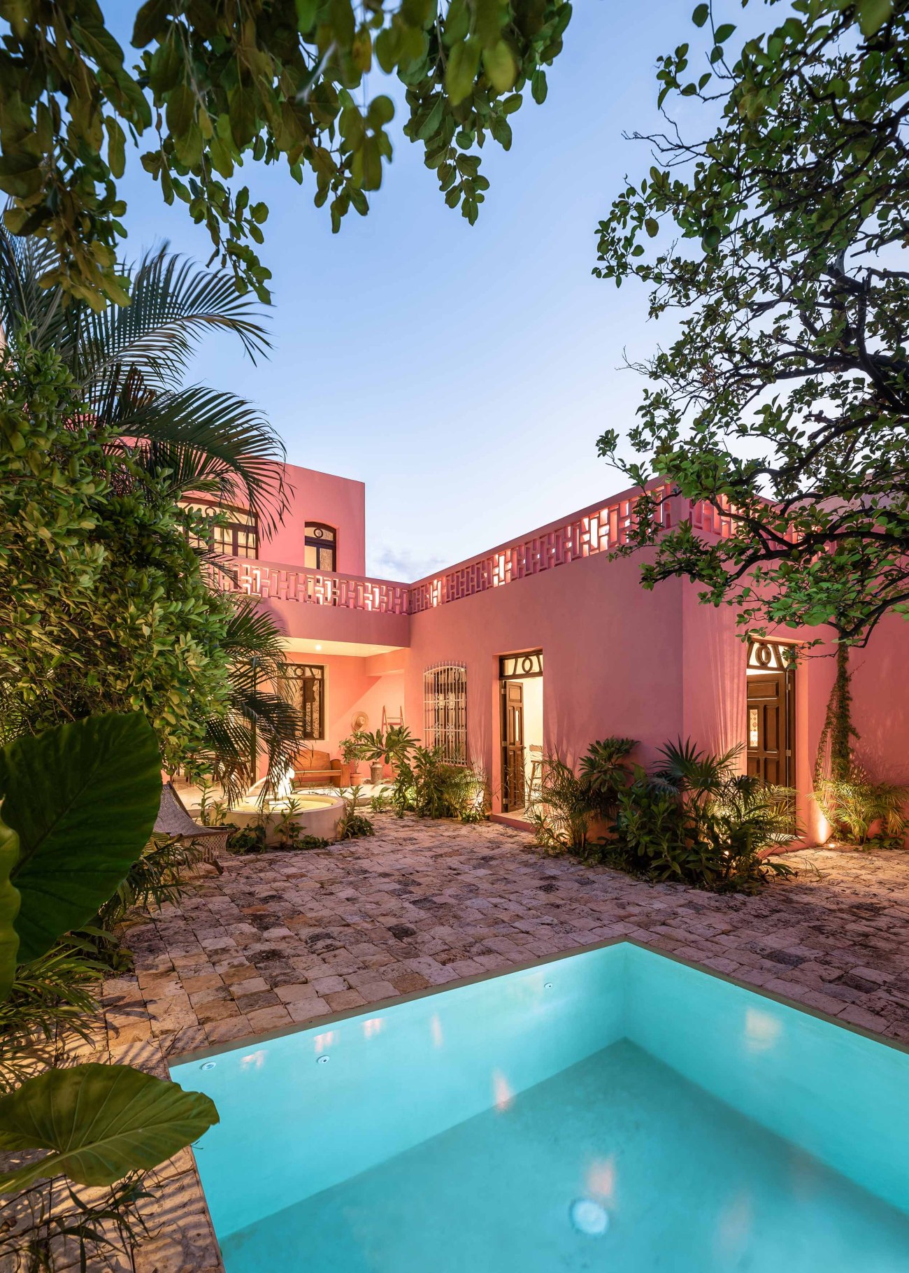 The inner courtyard intentionally breaks with the neutral colors found in the historical part of the house. The courtyard’s intense Mexican pink ties the colors of the carpentry with the tropical vegetation that surrounds the space. The stone floor symbolically links the interior with the exterior as it surrounds the chukum pool, creating the perfect environment to enjoy the warm Yucatecan climate.