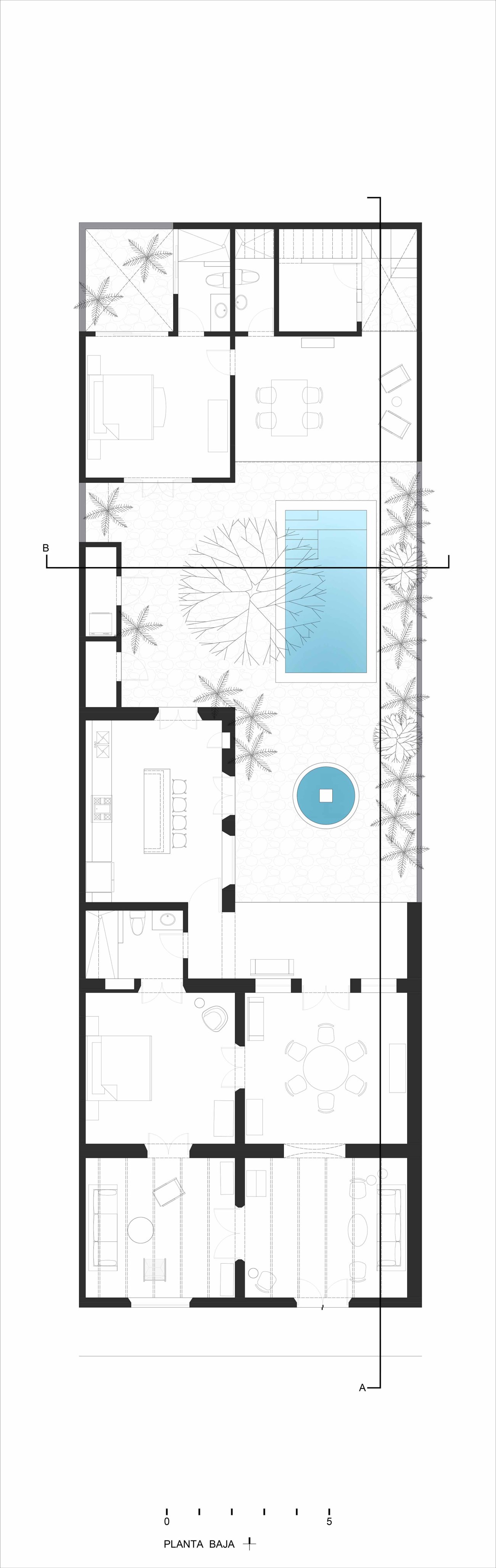 内庭院有意打破了房子遗留部分的中性色彩。庭院中浓烈的墨西哥粉红色将木工的颜色与周围的热带植被联系在一起。石地板将内部与外部联系起来,它围绕着泳池,为享受尤卡坦温暖的气候创造了完美的环境。
