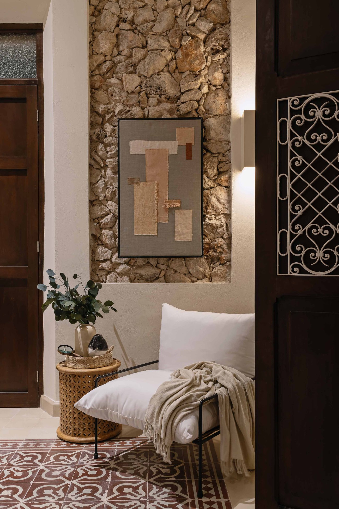 Due to the fact that the wall where the doors and windows are located was tampered with numerous times and with various materials over the years, it was impossible to continue with the same exposed stone treatment that was used on the original wall. Instead, chukum plaster was used to unify the wall, applying the same idea to an added upper wall, perpendicular to it and to the ceiling. A small covered terrace, ideal for sitting down to relax, connects us to the kitchen, which is a mid-century annex of the property. Practically the entirety of the original structure was preserved; one of the only exceptions to this is the latticework found on the upper part of the terrace. This was added as a reinterpretation of the balcony railing that was found on the second level bedroom, harmonizing perfectly with the Art Deco style found on the transoms above the original doors.