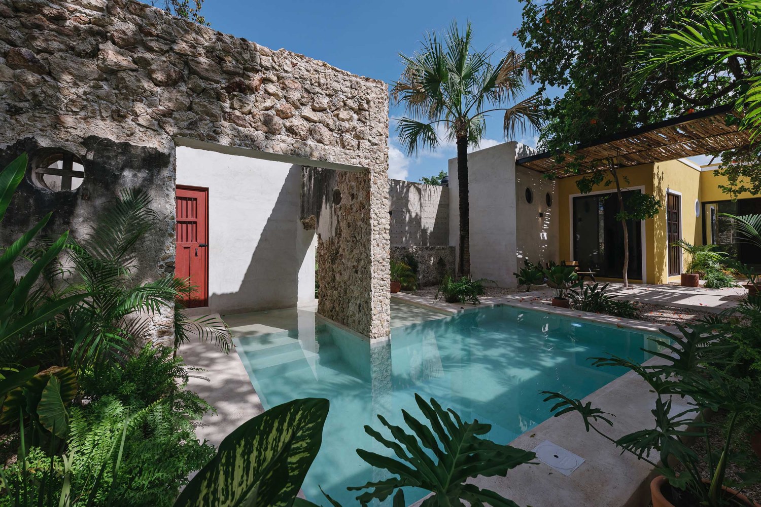 A focal point, the pool was built around an old colonial structure, which holds the machinery room. The color palette includes blue, yellow and red, colors that are very common in the architecture of haciendas found across Yucatan.