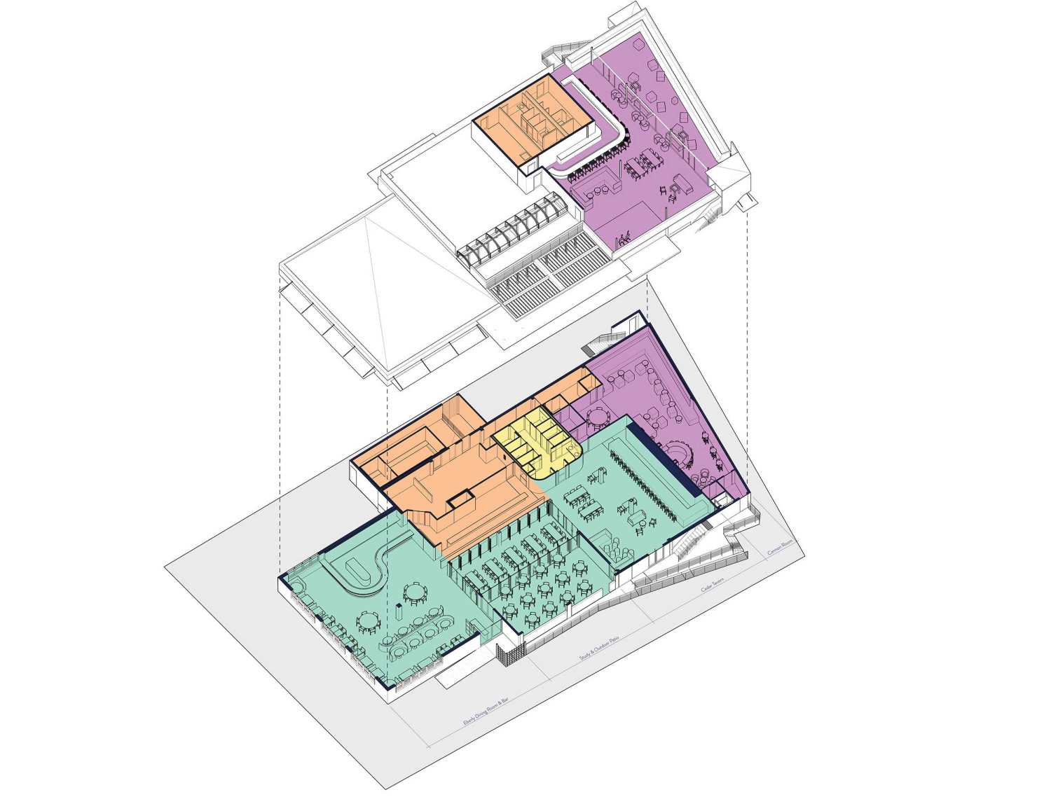 动线决定了次要的组织原则。书房和厨房走廊作为连接咖啡馆和雪松酒馆的中心脊柱。要创造一个空间流线,带来令人难忘的体验,就必须重新设计这个10,000平方英尺的建筑的组织结构。视觉上的层次感和空间上的连通性,以及风格迥异但又互补的内部装饰,都是对顾客探索餐厅的邀请。