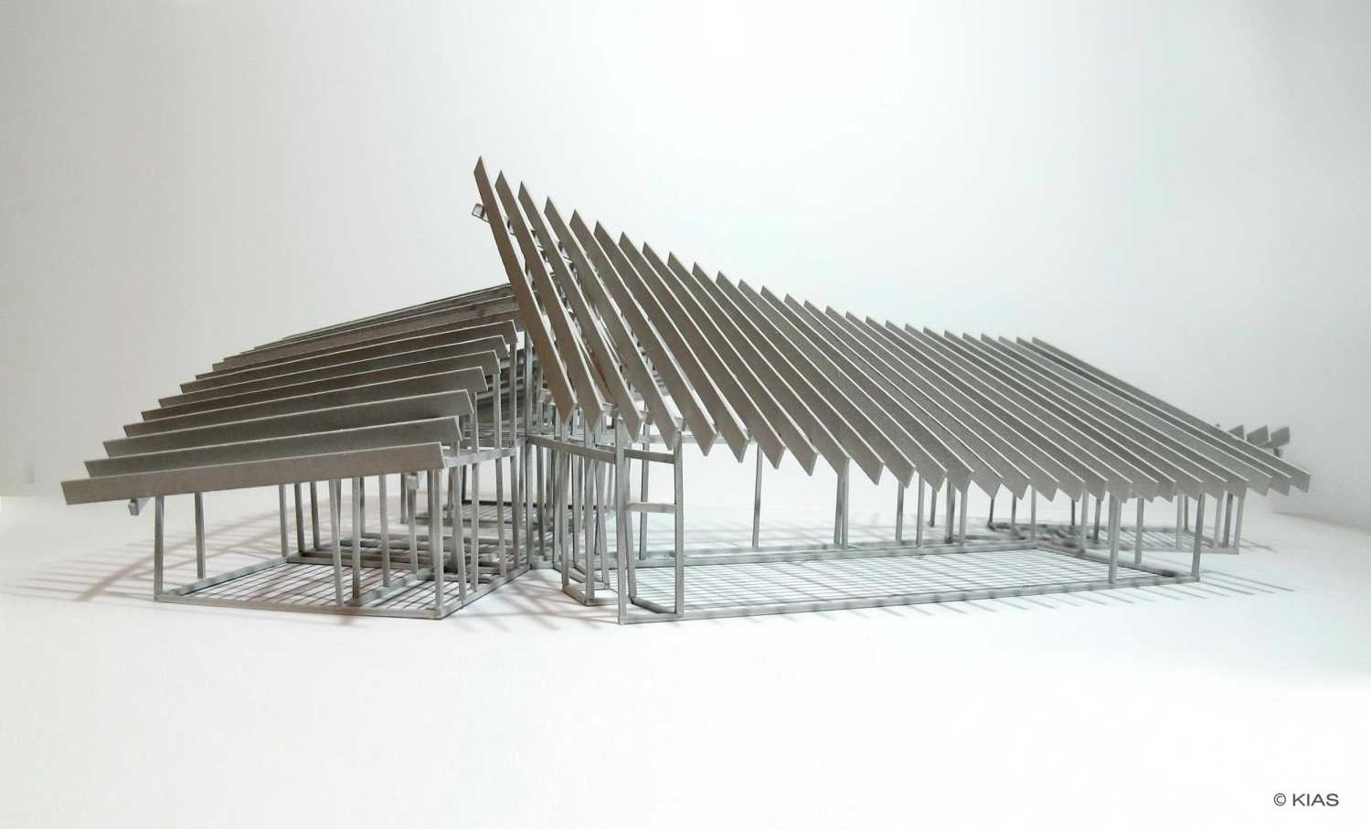In order to form variable cross section suitable for each function, roofs were designed as curved surface like a gently twisted leaves. Combination of a concave and a convex roof configures from a high ceiling's expansive space to an introverted compact space. Every roof was designed as a Ruled Surface in which straight LVL joists were arranged continuously to form an organic geometry. Series of wooden joists are exposed on the ceiling highlighting its dynamic spatial characters of each living space.