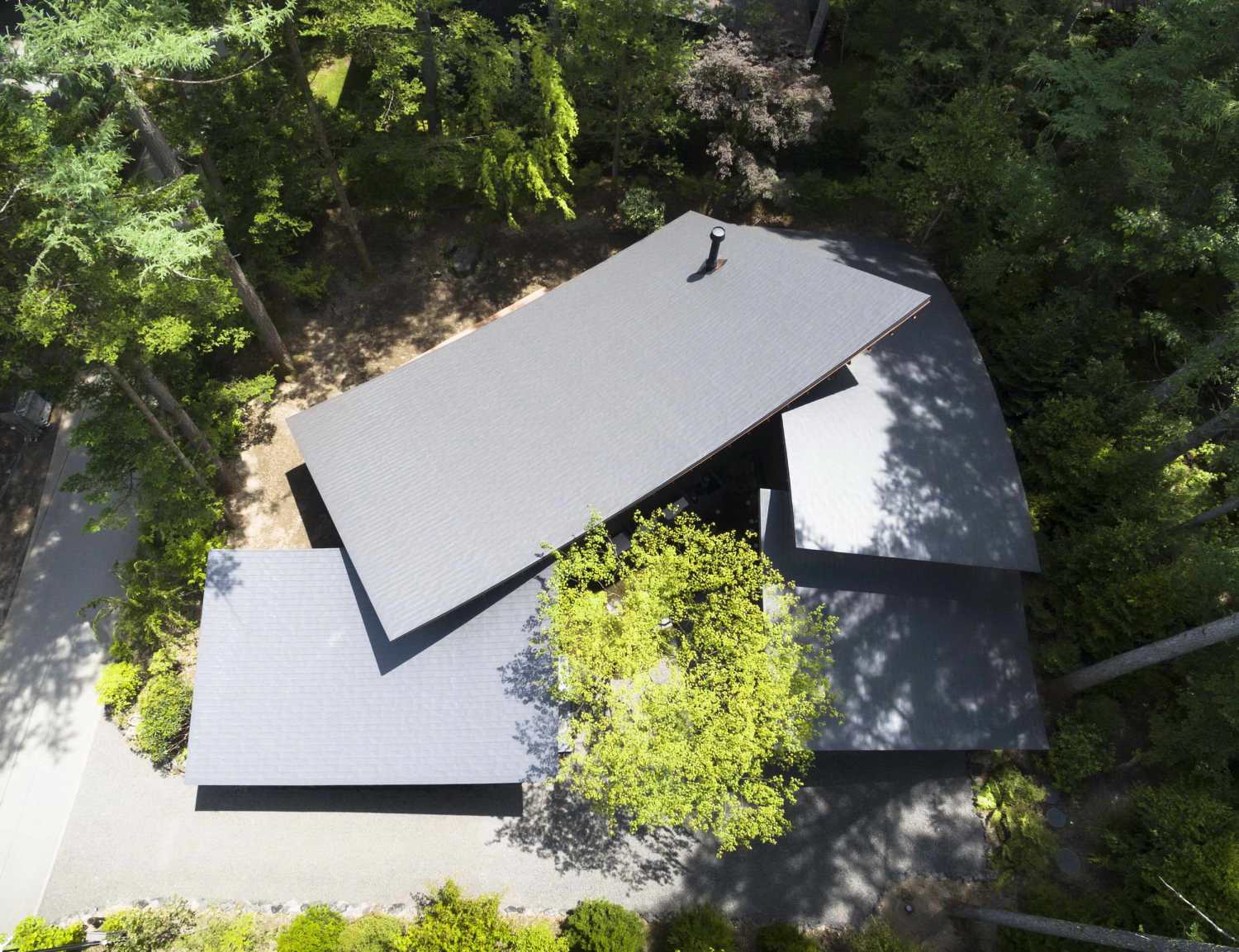 In order to acquire specific natural scenery and light environment, each living function faces its own desired orientation. Living and dining space faces south-east for a brighter living environment while master bedroom and bathroom faces west offering private scenery of the forest. These living functions are assembled into 3 interconnected volumes that are placed on site among the pre-existing trees.