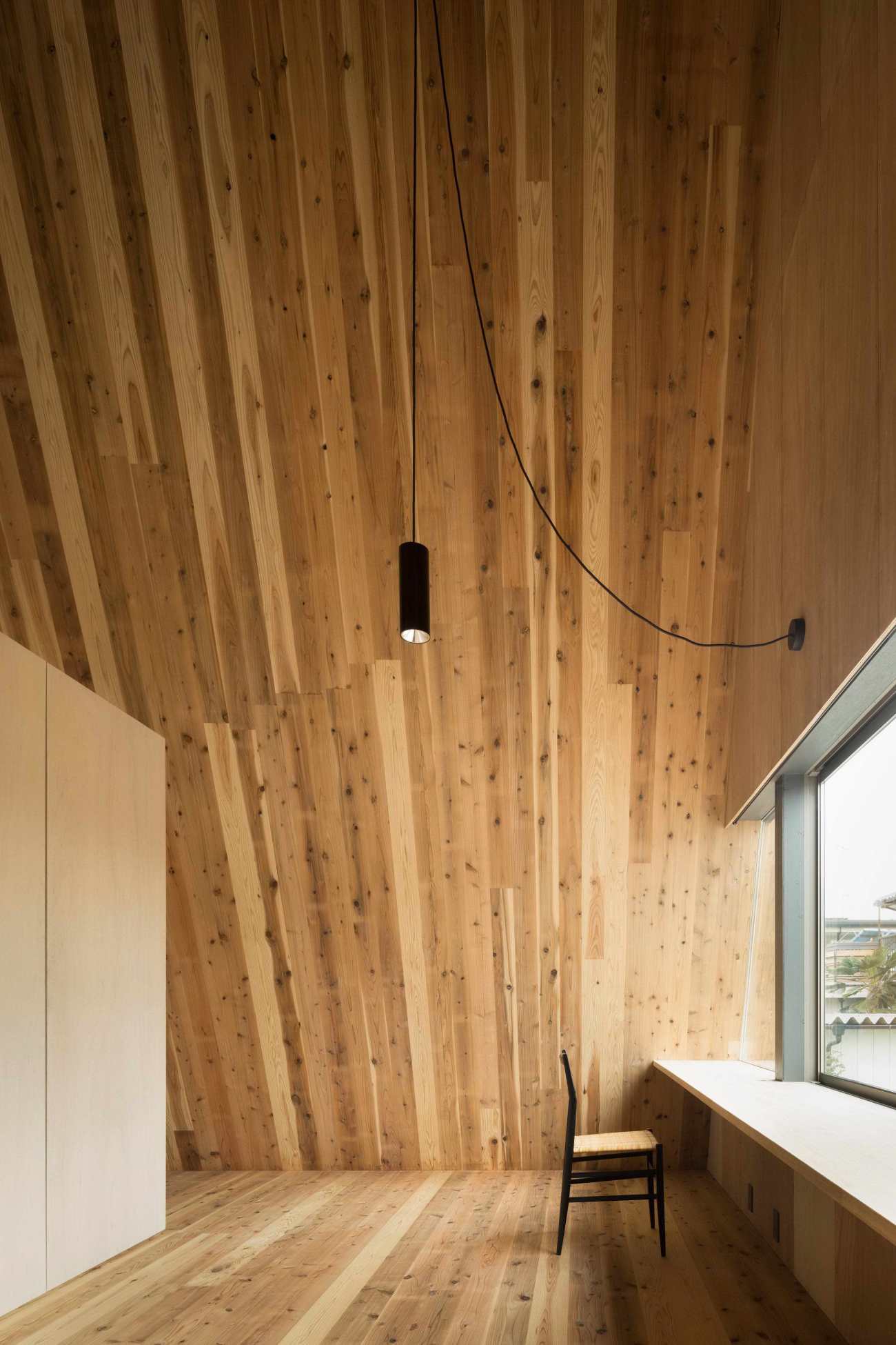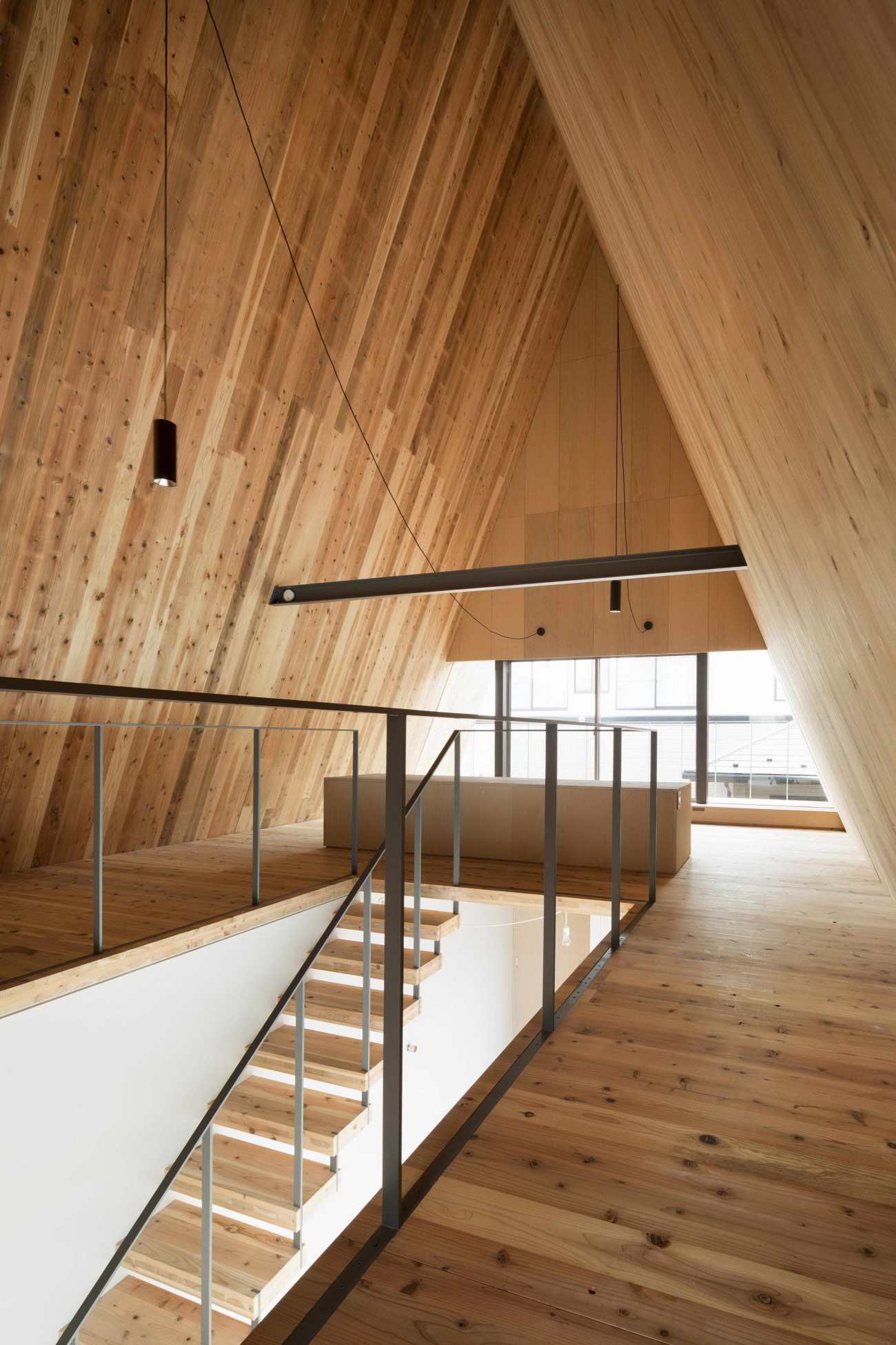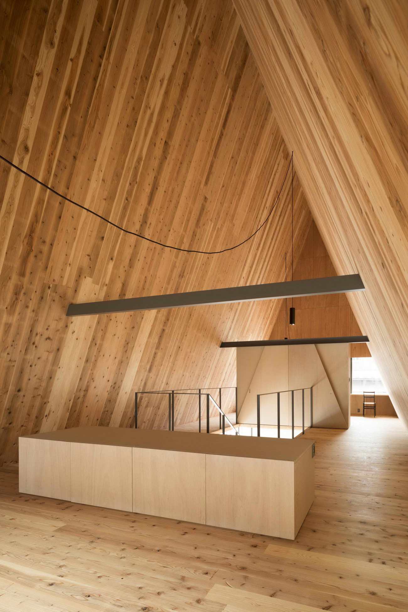 The triangular prism is formed by a truss of CLT panels. The 90 mm panel thickness, though a response to exterior wind pressure, is not only structurally functional but also gives beauty. The rich texture of wood makes it unnecessary to install further interior finishes. The structure also eliminates the need for insulation due to the considerable thickness of the panels.