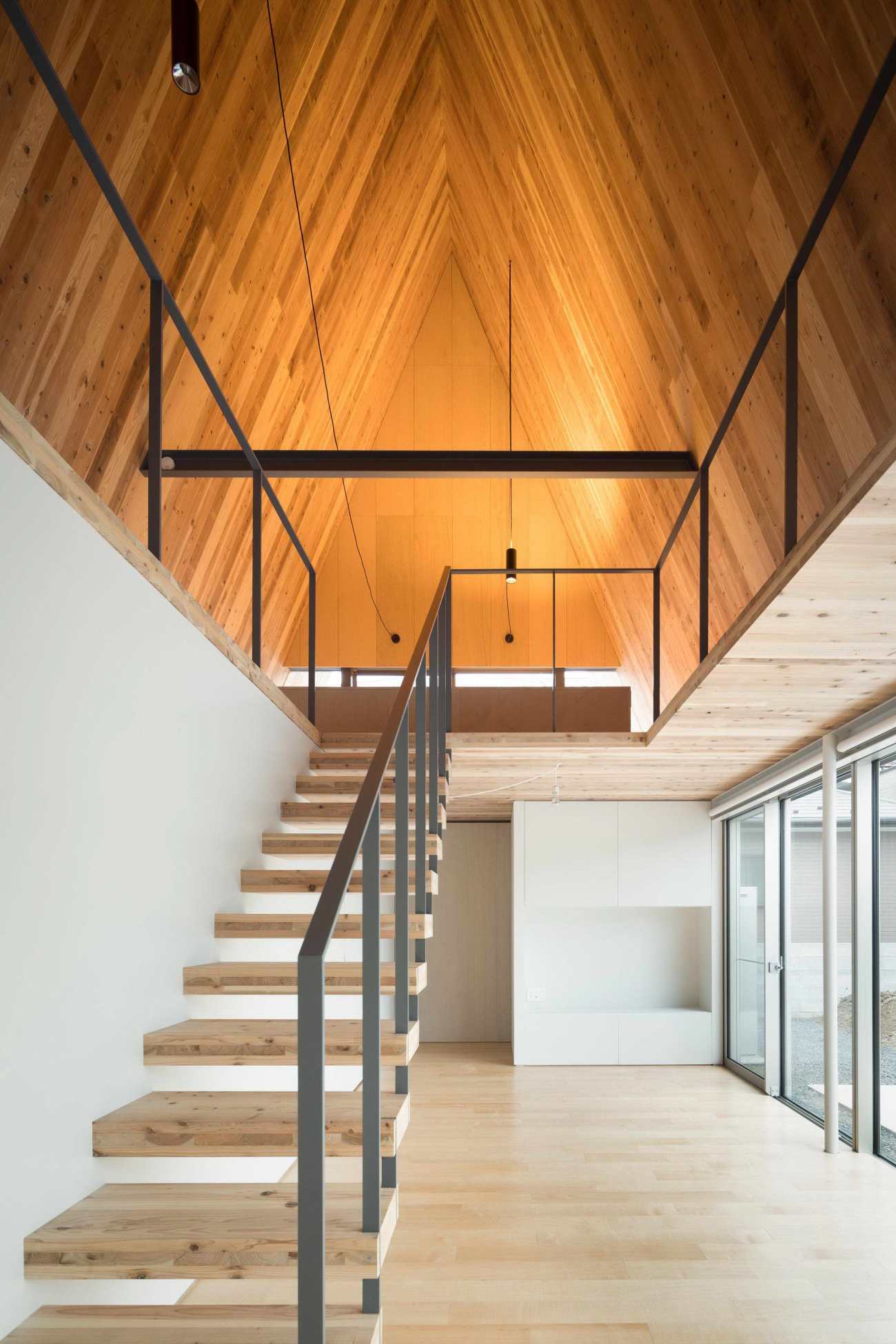The site is in a residential area in the suburbs, and the house is for a couple and their child. The composition is that of an introspective triangular attic space sitting on an open first floor of wooden and steel construction.