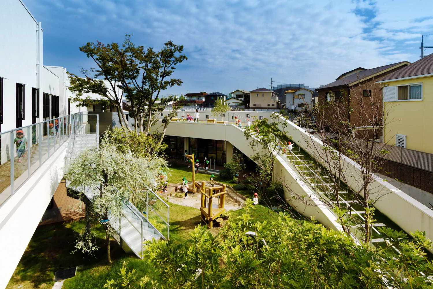 在这个项目中,我们设定了两个主题。一个是解决儿童在日常活动中缺乏锻炼的问题,因为规划的区域非常狭窄和狭窄。另一个是将当地产业的元素--编织纳入其中,以便让孩子们学习和了解该地区。具体来说,为了在狭窄的场地内增加体育活动量,我们认为最好是创造一个有颠簸的环境,让孩子们可以跑来跑去,所以我们把教学楼放在院子周围,并创造了一个从一楼到屋顶的坡度。通过这样做,孩子们的身体活动能力得到了极大的提高,因为他们可以在不知不觉中跑来跑去,爬上屋顶,或者一路跑下楼梯,回到院子里。