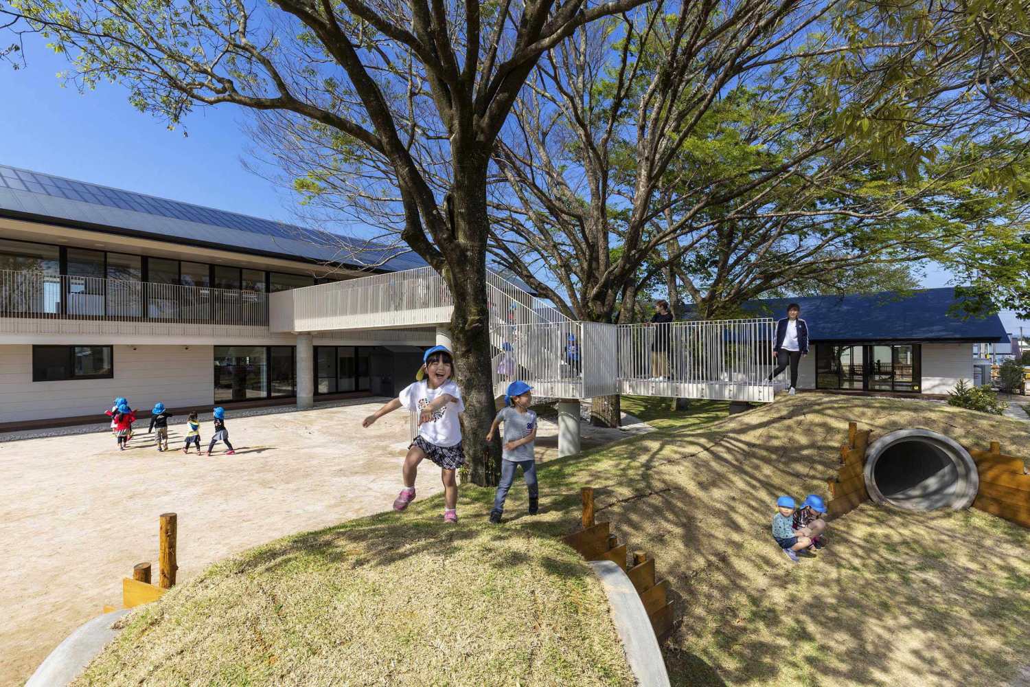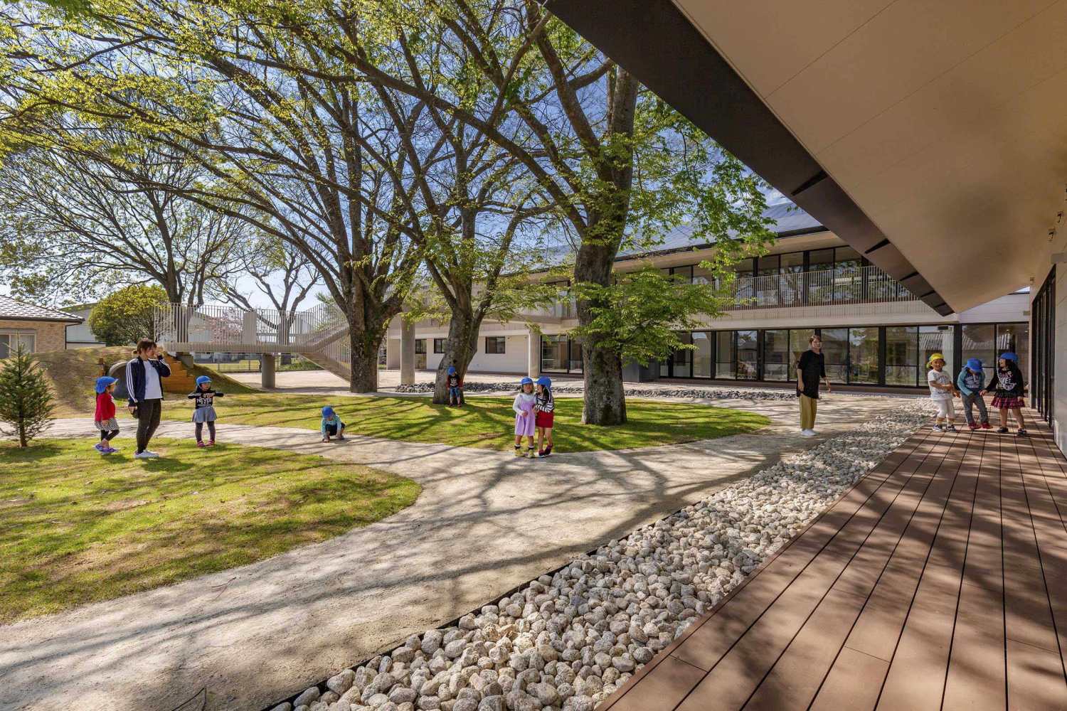 Four big old trees were retained, with people looking upto them for watching over the upcoming generation. These trees are visible from all the nursery rooms. By designing the building, with them at the center, a visual connection in between the rooms, the trees and the children was established. The emergency staircase from the second floor was extended all the way underneath the tree branches, making it possible for children to closely feel them and hence create a playful environ under. Lots of Cedars and Hinoki Cypress trees from Miyazaki were planted for connecting kindergarten site with the local community and the nature.