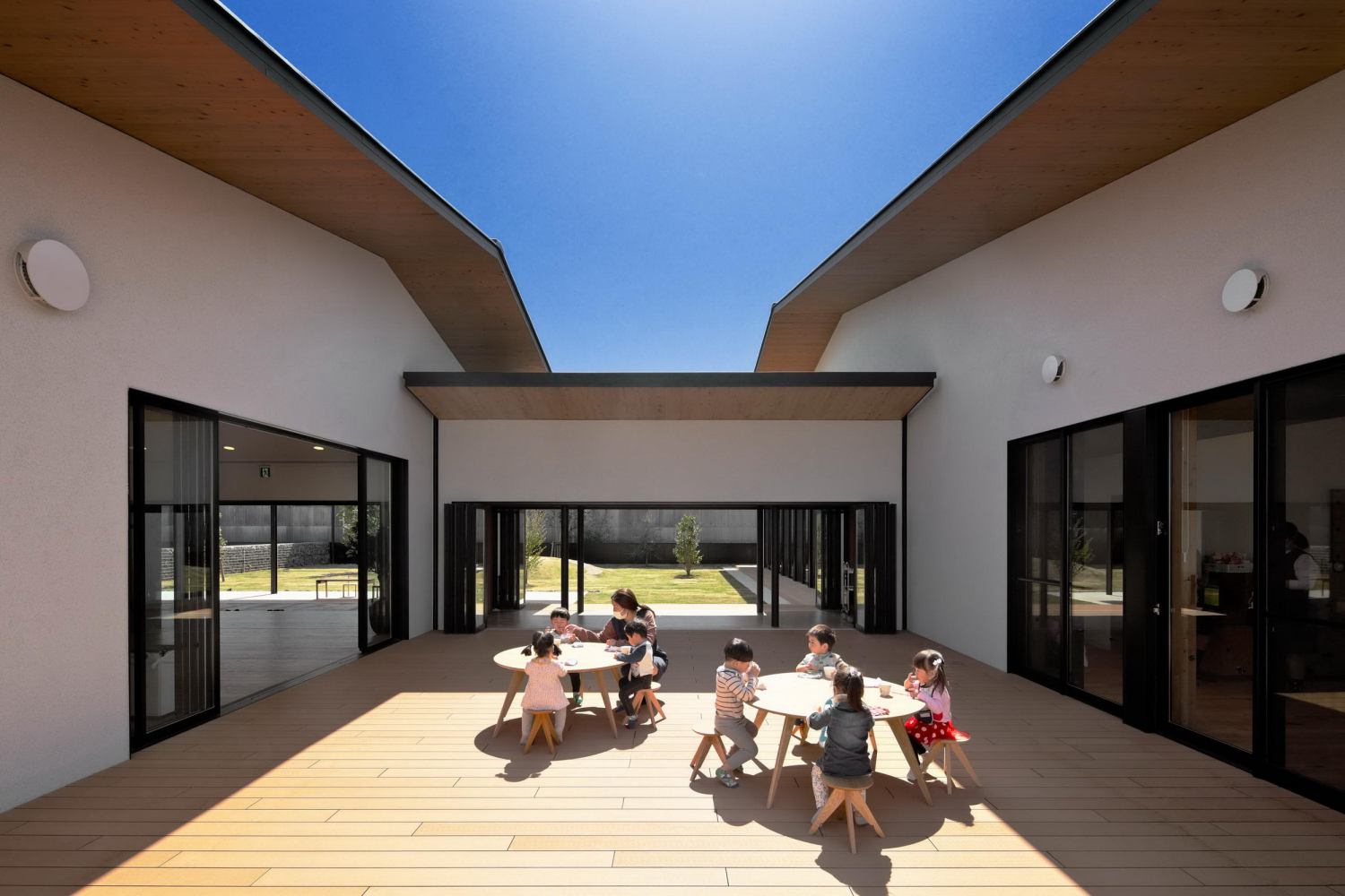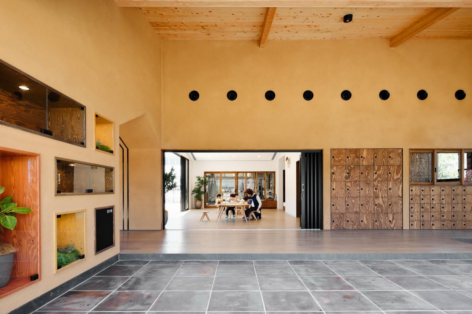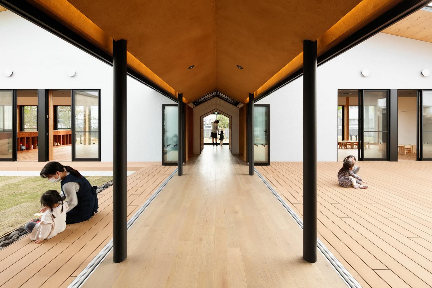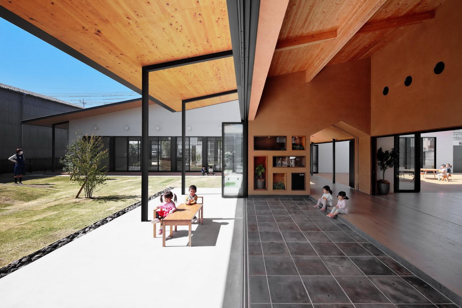 为了能够让使用这里的孩子和大人尽情感受自然,更方便生活,采用了日本传统家宅的各种要素。长长伸出的房檐,大大的窗,根据季节变化的风和光穿过。作为园舍其中一个自然要素的土墙具有调节室内湿度整顿室内环境的效果。孩子们通过和自然近距离接触并在这样的环境中生活,身体机能得到培育。采用具有日本传统房屋特征的连廊和推拉门,各个房间连为一体,视野开阔,老师更容易确认孩子们的状态,老师感到安心,孩子们也能尽情地游戏。