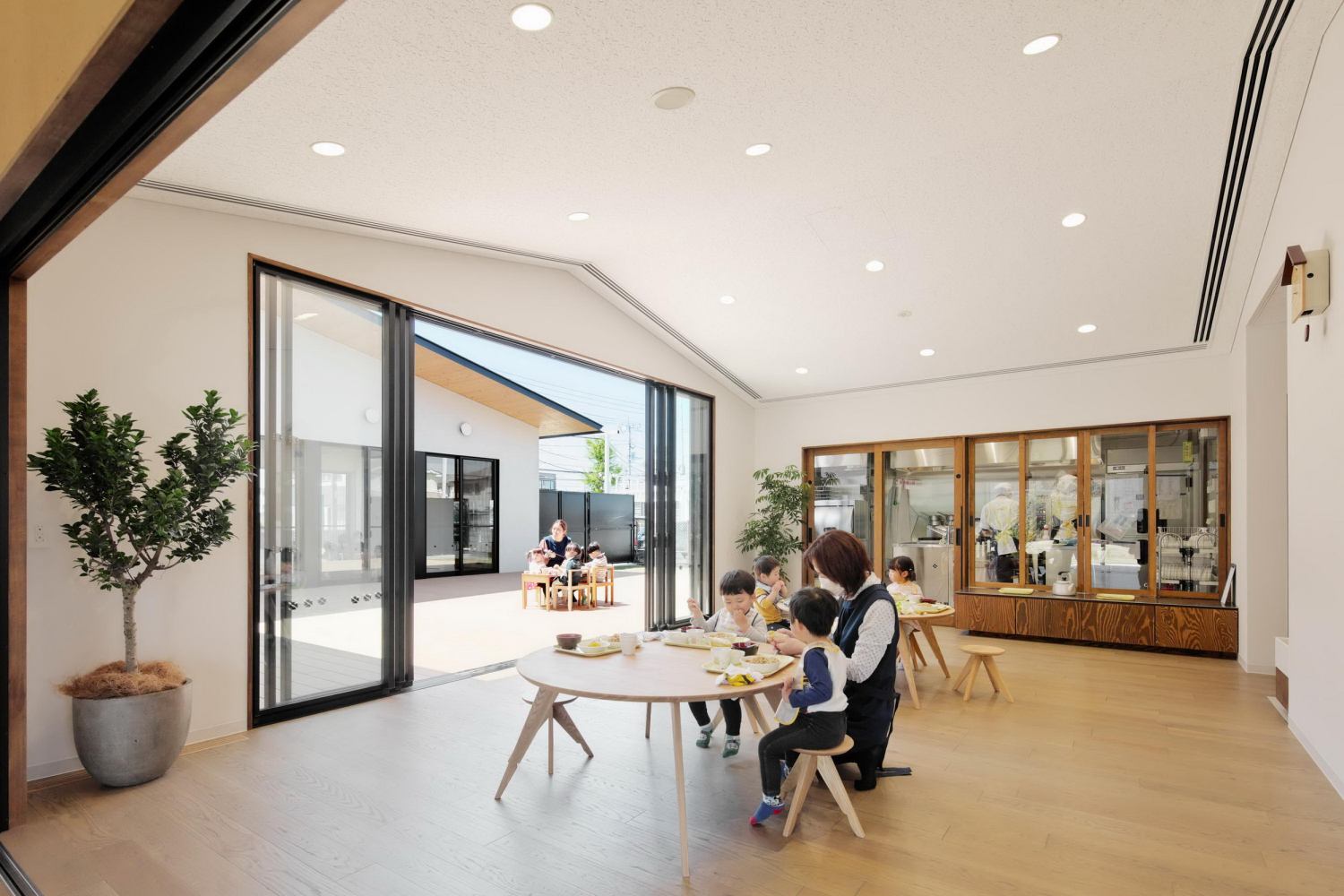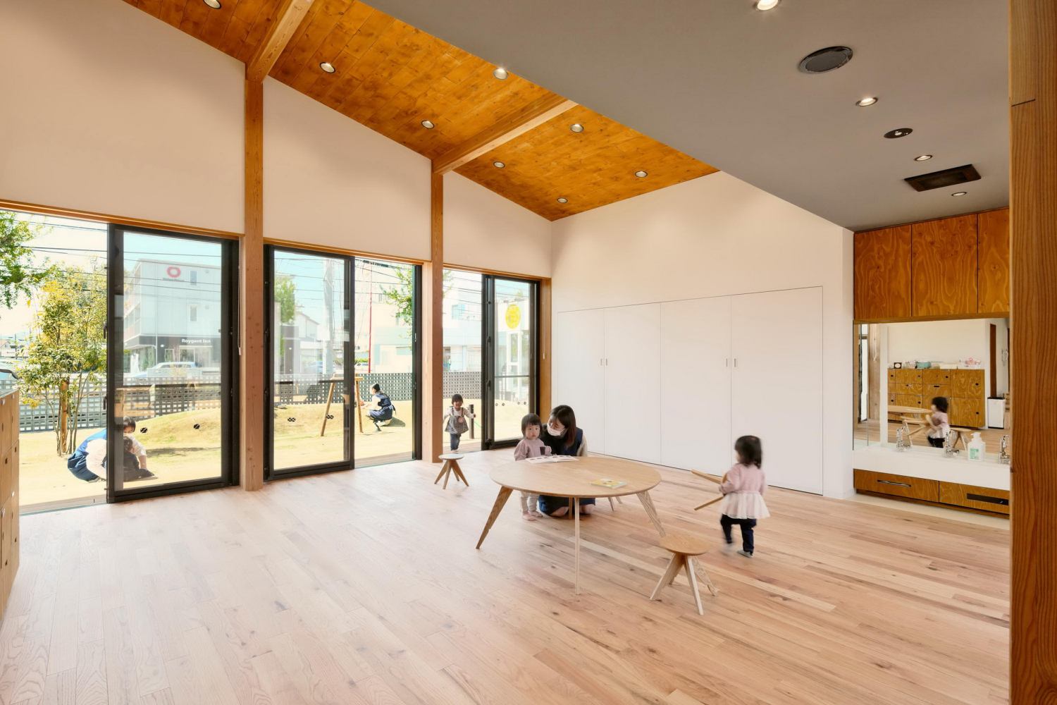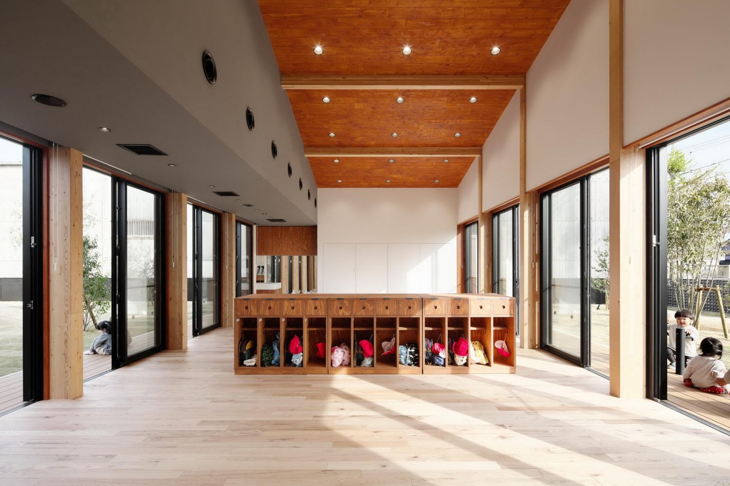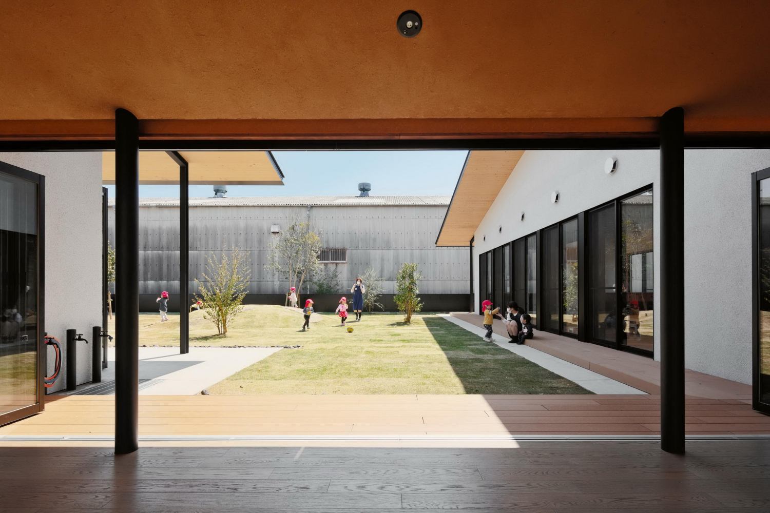 为了能够让使用这里的孩子和大人尽情感受自然,更方便生活,采用了日本传统家宅的各种要素。长长伸出的房檐,大大的窗,根据季节变化的风和光穿过。作为园舍其中一个自然要素的土墙具有调节室内湿度整顿室内环境的效果。孩子们通过和自然近距离接触并在这样的环境中生活,身体机能得到培育。采用具有日本传统房屋特征的连廊和推拉门,各个房间连为一体,视野开阔,老师更容易确认孩子们的状态,老师感到安心,孩子们也能尽情地游戏。