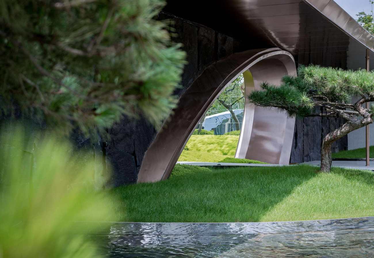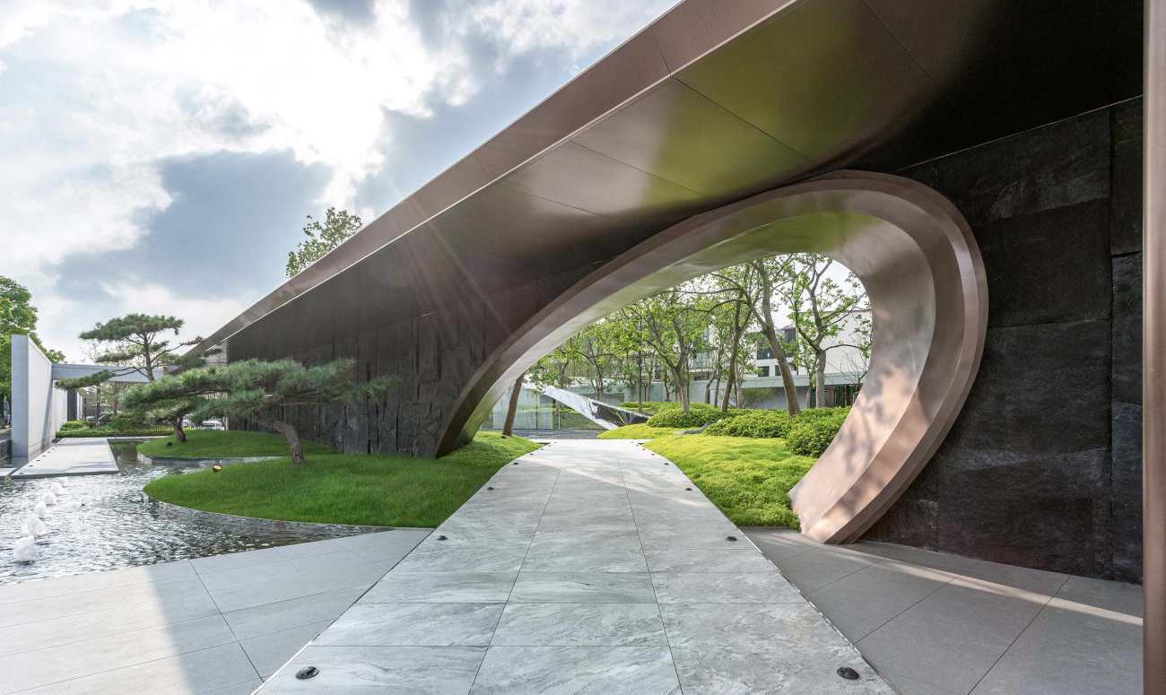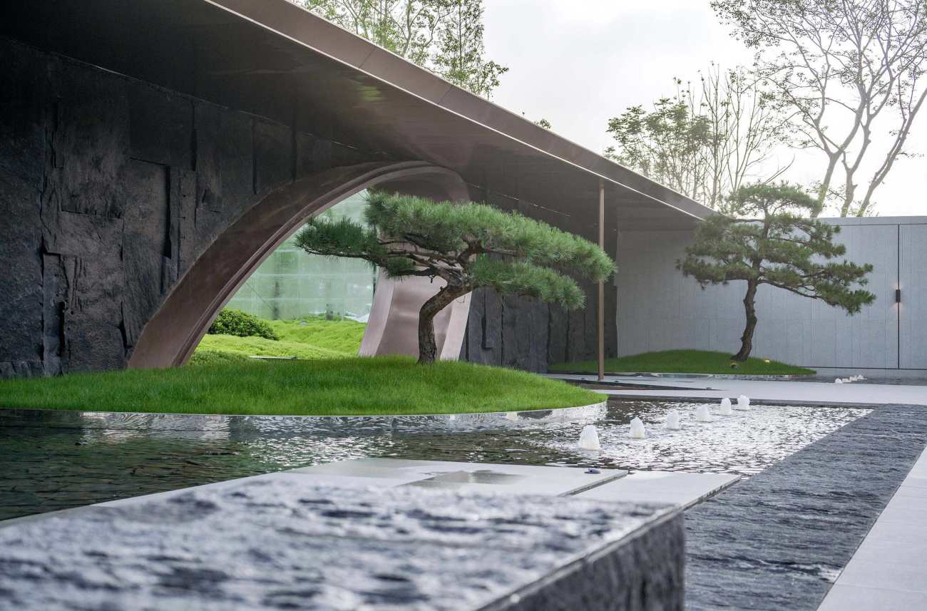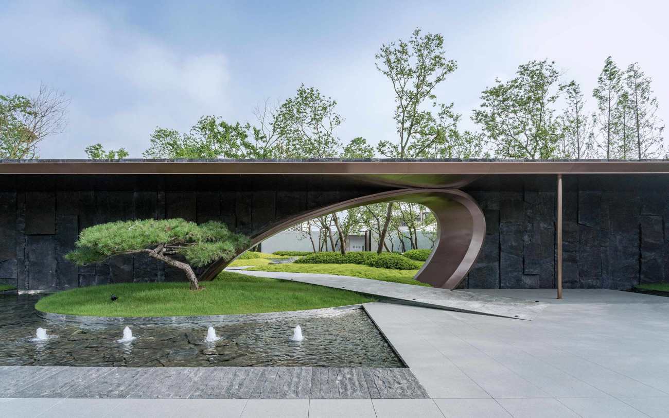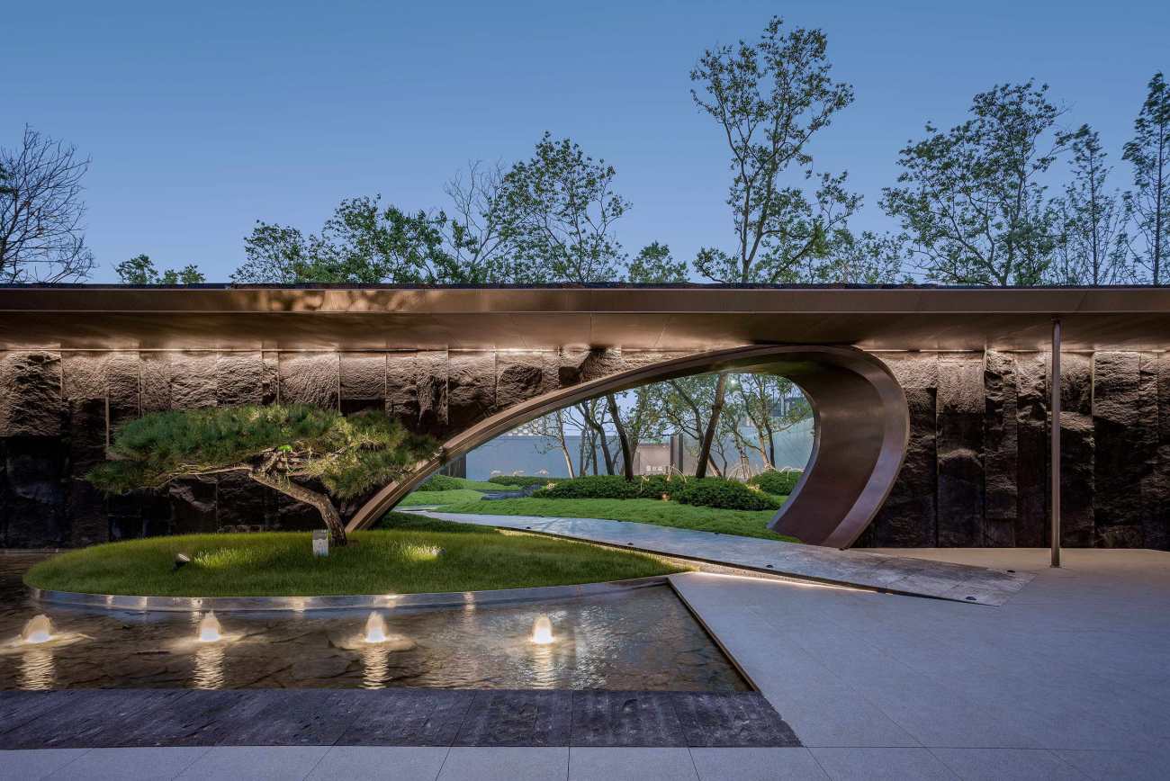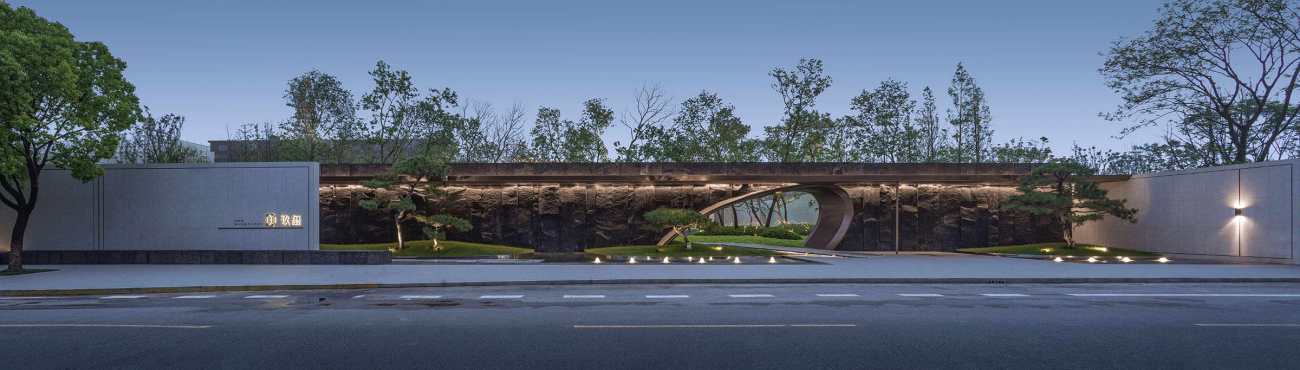 整个长界面从设计上具体分成了两个层次,主入口位置选择了厚重粗粝的自然块石作为背景彰显厚重和品质,加上轻巧精致的不锈钢檐口,形成局部风格形式上的强烈反差,在入口就给以强烈的戏剧化的冲击。同时人行的进入空间,我们独辟蹊径地采取了不规则椭圆月洞门的造型,让整个进入过程从第一步踏进来就感觉与众不同,仿佛开始一场秘境的探寻之旅。延展界面我们用和门头同样尺度的高墙进行尺度界面上的延申,同时也满足了停车区域的内向型围合,立面以干净的元素为主题,局部穿插格栅,既保证了界面的完整性,同时也弱化了长界面的单调感,使整个城市界面虚实兼备,强弱层次分明。在停车区域设计时也做了单独的富有仪式感的出入通道,先是有一个小门头作为空间的界定,门头立面局部用格栅作为障景,背后的造型松若隐若现,禅意之境立现。经过一个场景转换,通过一条水边步道回到月洞门,最后回到月洞门进入展示区,始终在进入最初保持这个寻密的感觉。