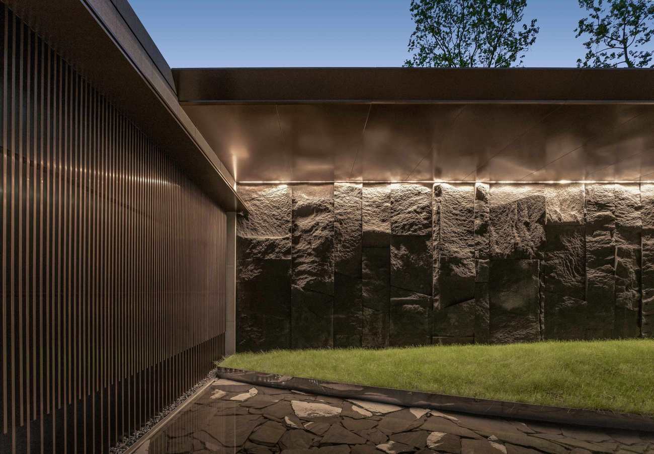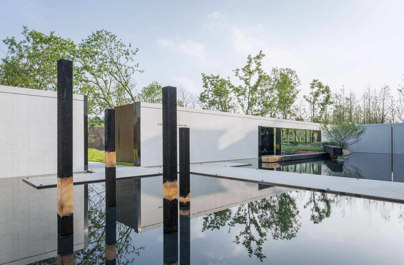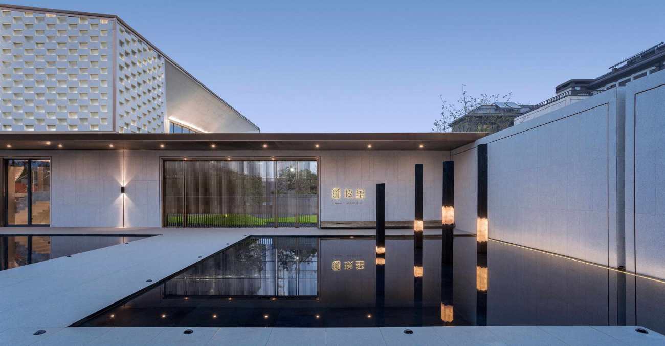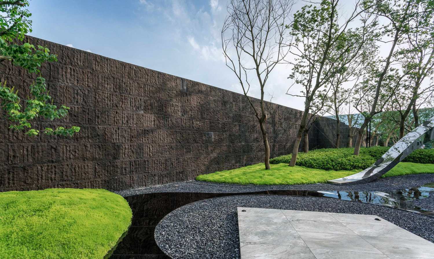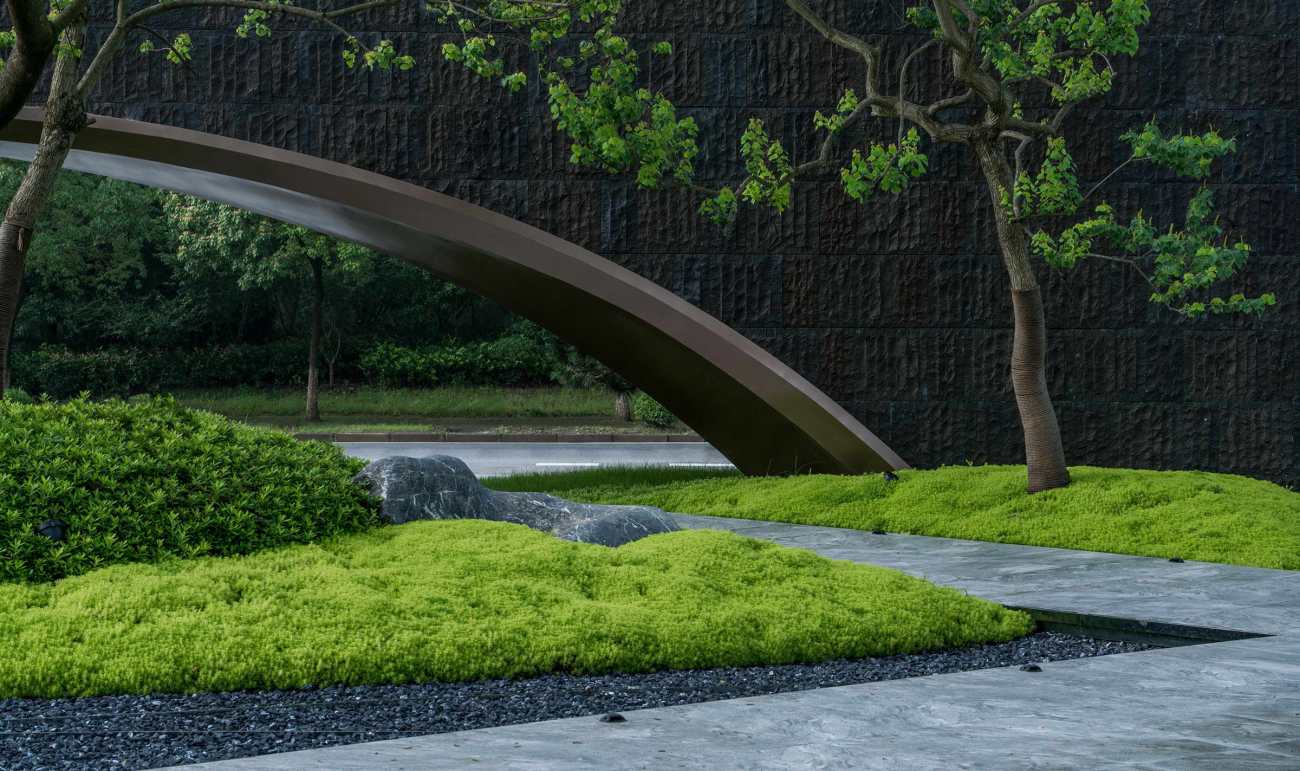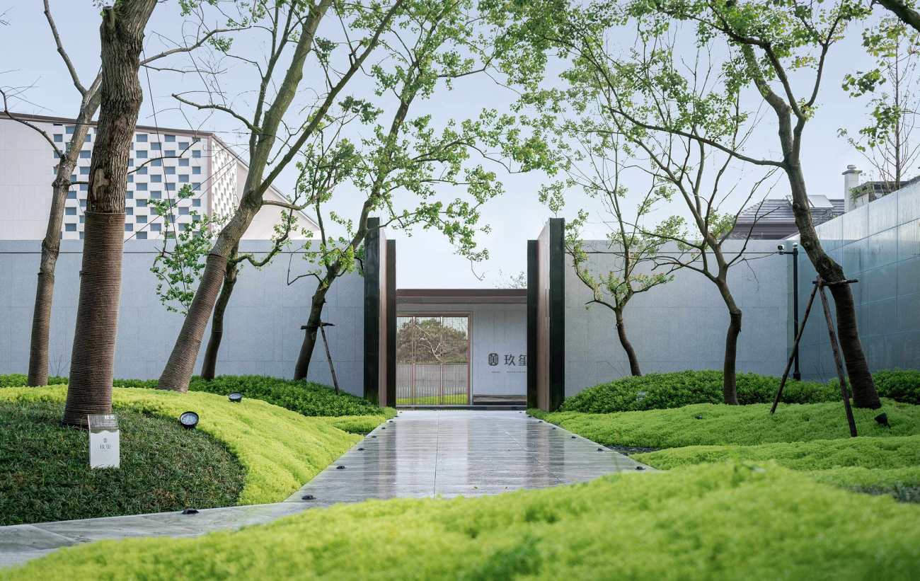 整个长界面从设计上具体分成了两个层次,主入口位置选择了厚重粗粝的自然块石作为背景彰显厚重和品质,加上轻巧精致的不锈钢檐口,形成局部风格形式上的强烈反差,在入口就给以强烈的戏剧化的冲击。同时人行的进入空间,我们独辟蹊径地采取了不规则椭圆月洞门的造型,让整个进入过程从第一步踏进来就感觉与众不同,仿佛开始一场秘境的探寻之旅。延展界面我们用和门头同样尺度的高墙进行尺度界面上的延申,同时也满足了停车区域的内向型围合,立面以干净的元素为主题,局部穿插格栅,既保证了界面的完整性,同时也弱化了长界面的单调感,使整个城市界面虚实兼备,强弱层次分明。在停车区域设计时也做了单独的富有仪式感的出入通道,先是有一个小门头作为空间的界定,门头立面局部用格栅作为障景,背后的造型松若隐若现,禅意之境立现。经过一个场景转换,通过一条水边步道回到月洞门,最后回到月洞门进入展示区,始终在进入最初保持这个寻密的感觉。