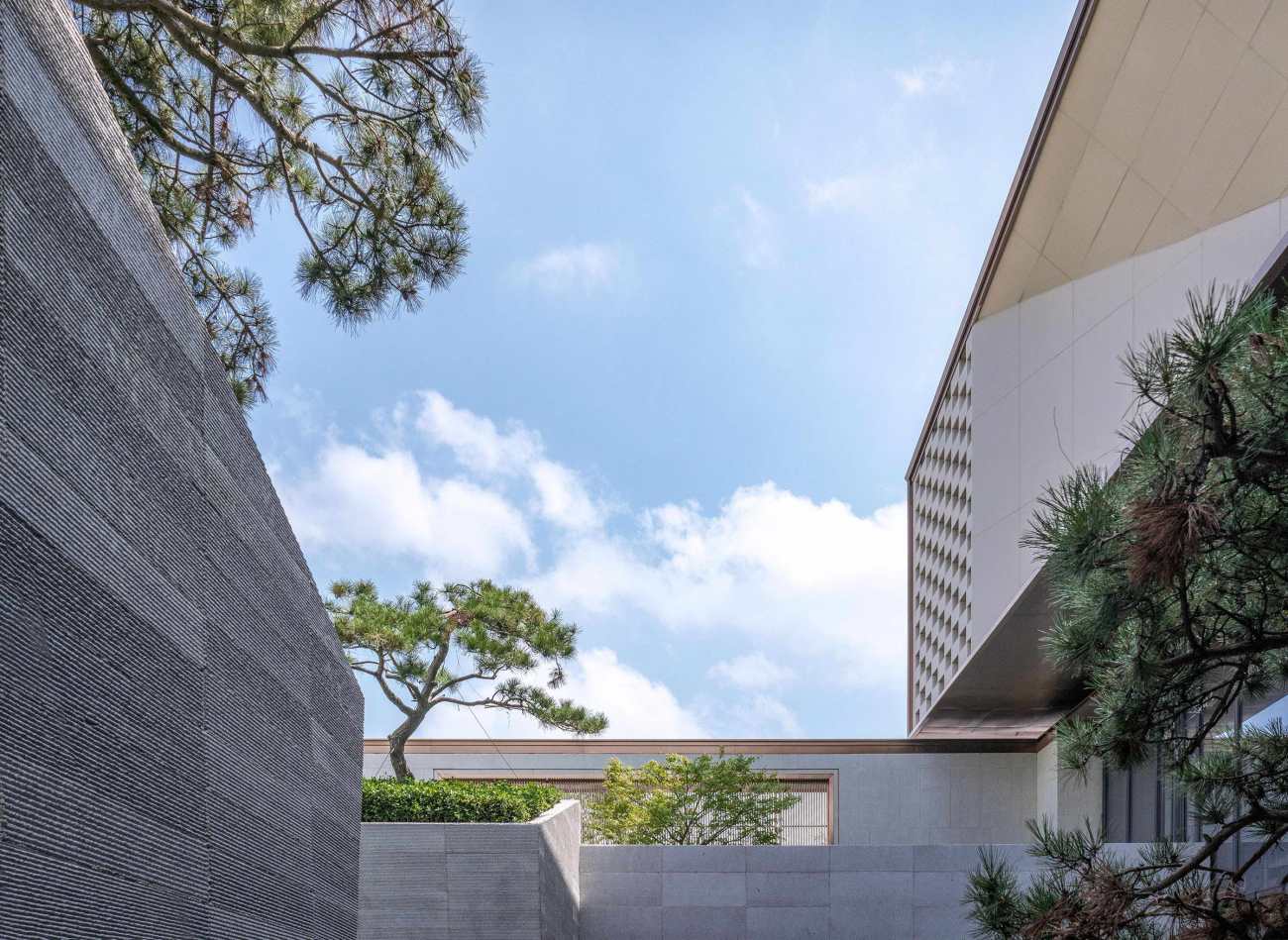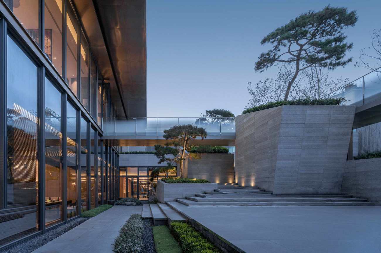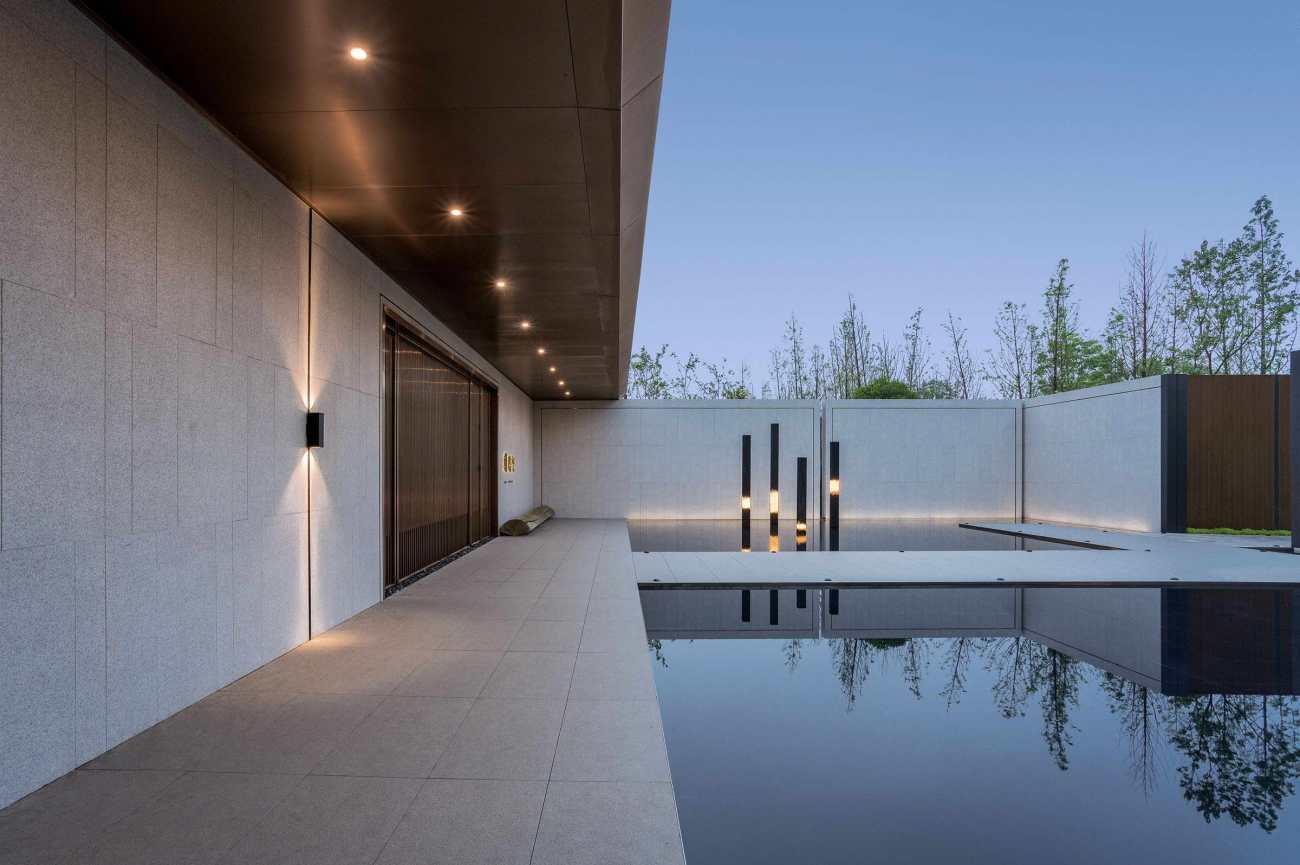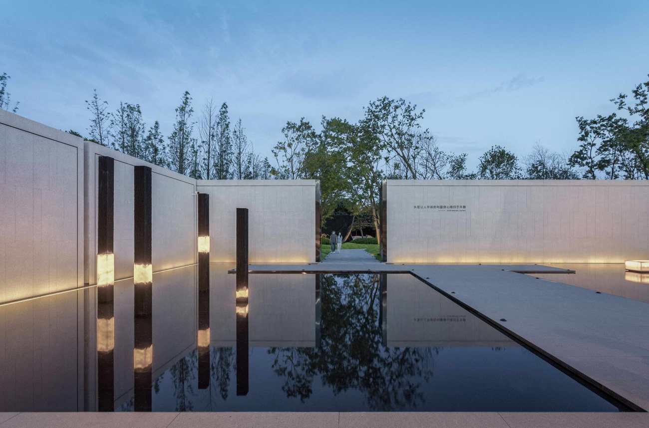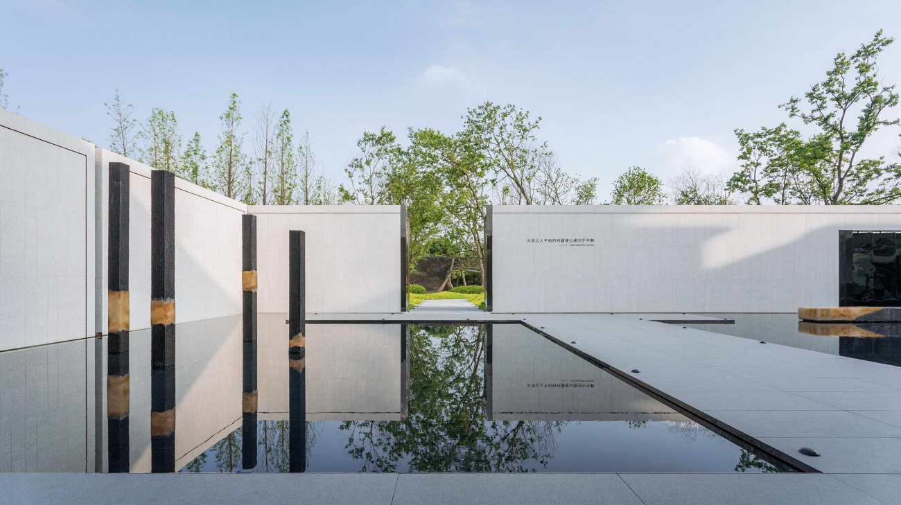 整个长界面从设计上具体分成了两个层次,主入口位置选择了厚重粗粝的自然块石作为背景彰显厚重和品质,加上轻巧精致的不锈钢檐口,形成局部风格形式上的强烈反差,在入口就给以强烈的戏剧化的冲击。同时人行的进入空间,我们独辟蹊径地采取了不规则椭圆月洞门的造型,让整个进入过程从第一步踏进来就感觉与众不同,仿佛开始一场秘境的探寻之旅。延展界面我们用和门头同样尺度的高墙进行尺度界面上的延申,同时也满足了停车区域的内向型围合,立面以干净的元素为主题,局部穿插格栅,既保证了界面的完整性,同时也弱化了长界面的单调感,使整个城市界面虚实兼备,强弱层次分明。在停车区域设计时也做了单独的富有仪式感的出入通道,先是有一个小门头作为空间的界定,门头立面局部用格栅作为障景,背后的造型松若隐若现,禅意之境立现。经过一个场景转换,通过一条水边步道回到月洞门,最后回到月洞门进入展示区,始终在进入最初保持这个寻密的感觉。