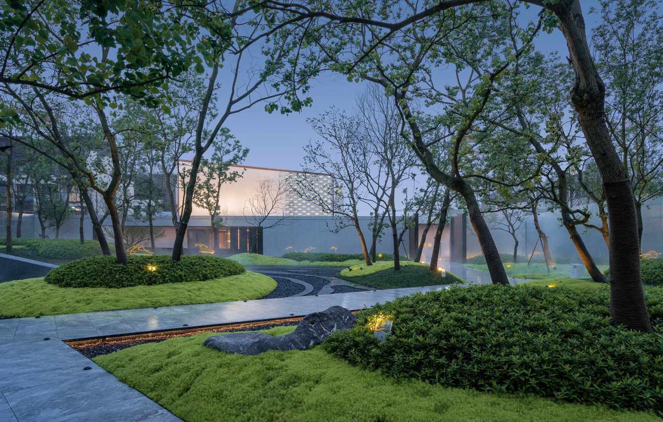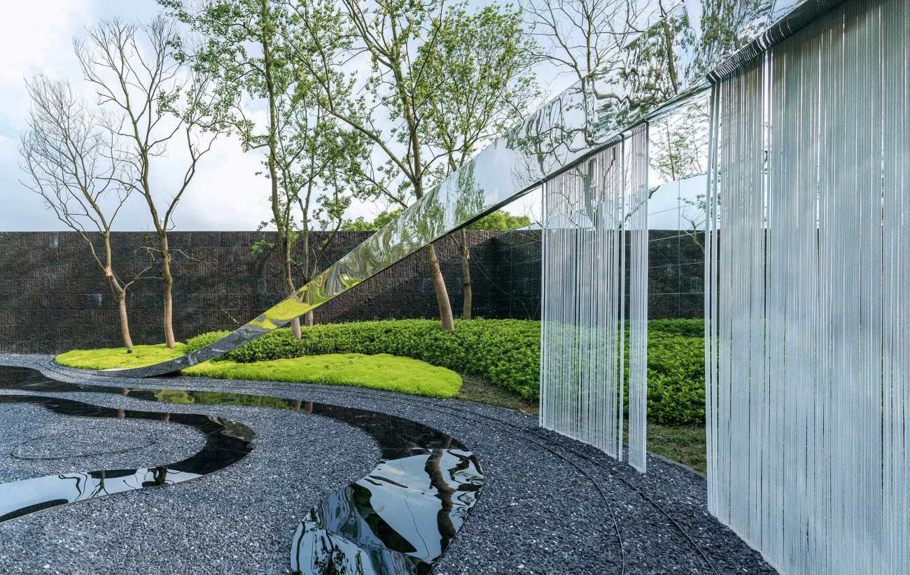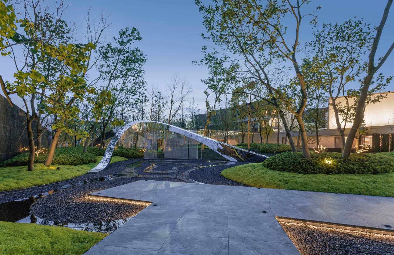 一进空间以“林”为主题,设计之初就一直在水杉和乌桕之中徘徊,一个效果明确,落地效果容易把控,一个气质飘逸,但是落地难度不小,选苗和搭配都是非常难以控制。最后还是选择了更适合风华调性的乌桕林作为造林的核心树种。选苗的时候,摈弃了常规的挺拔、饱满的审美体系,以自然、飘逸、有个性的树形为基准,挑选了形态各异的乌桕,然后结合起伏饱满的地形,种上佛甲草、矮麦冬等细腻的地被,去掉中层,尽量模仿自然,营造出现在所呈现出的魔幻般的森林场景。在月洞门正对的空间设置了大尺度的雕塑,整体雕塑造型跟随地形起伏的节奏顺势而为,融入整个大场景中,利用起金属的质感,在森林中脱颖而出,形成视觉上的焦点,体现项目的艺术价值感。场地中定制的黑钛镜面不锈钢以水溪的形态穿梭在大面的砾石中,削弱了大面积砾石所带来的枯燥感同时也为一进森林增添了一份灵动。在整个一进院的两侧都设置了用玻璃镜面建立的围合,通过镜面反射消隐了场地的边界,将林的空间感做了无限延伸,形成了无界之林的效果。整个通行过程树影婆娑,波光灵动,谓之“拾光”。