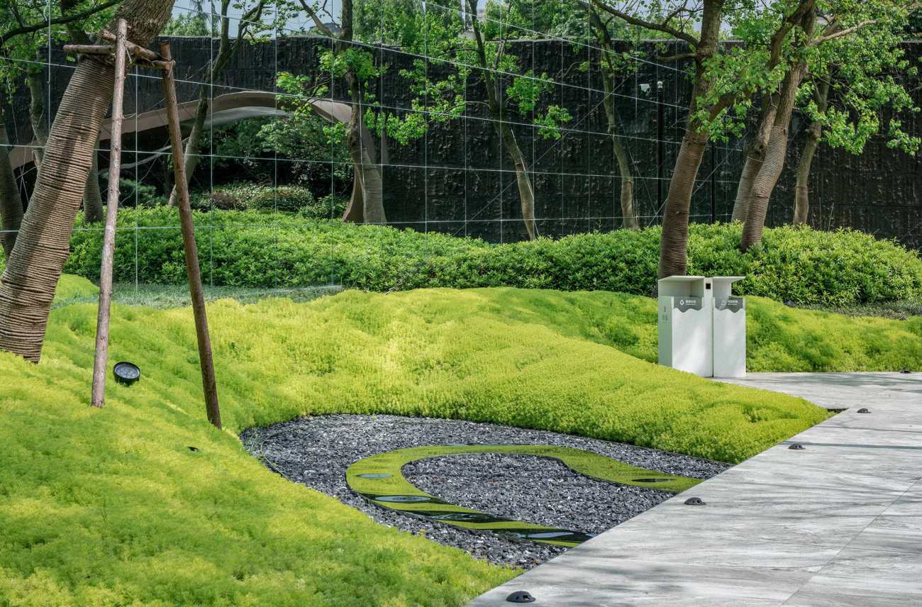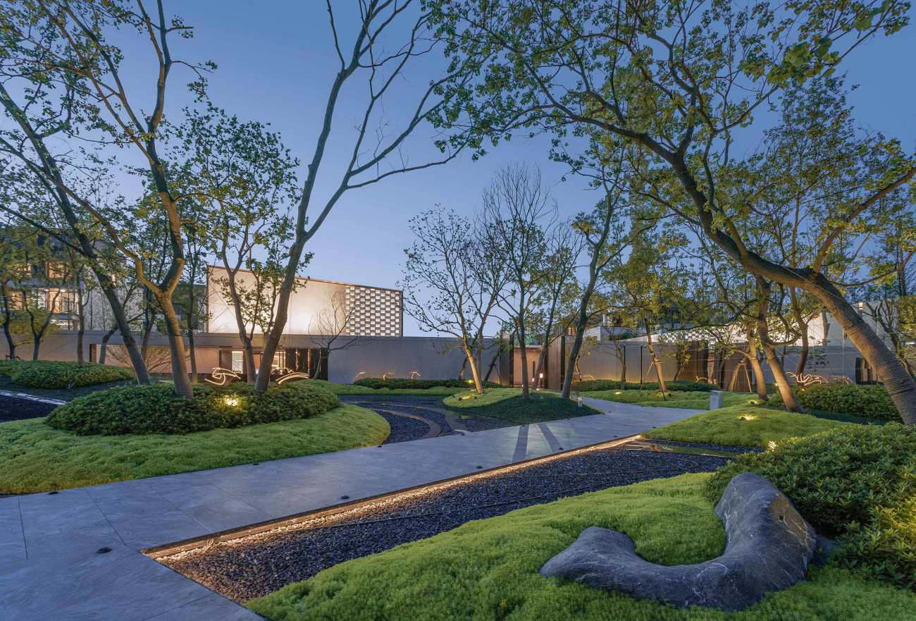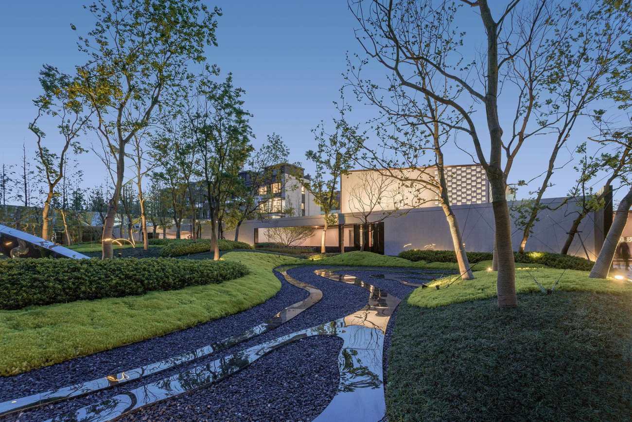 一进空间以“林”为主题,设计之初就一直在水杉和乌桕之中徘徊,一个效果明确,落地效果容易把控,一个气质飘逸,但是落地难度不小,选苗和搭配都是非常难以控制。最后还是选择了更适合风华调性的乌桕林作为造林的核心树种。选苗的时候,摈弃了常规的挺拔、饱满的审美体系,以自然、飘逸、有个性的树形为基准,挑选了形态各异的乌桕,然后结合起伏饱满的地形,种上佛甲草、矮麦冬等细腻的地被,去掉中层,尽量模仿自然,营造出现在所呈现出的魔幻般的森林场景。在月洞门正对的空间设置了大尺度的雕塑,整体雕塑造型跟随地形起伏的节奏顺势而为,融入整个大场景中,利用起金属的质感,在森林中脱颖而出,形成视觉上的焦点,体现项目的艺术价值感。场地中定制的黑钛镜面不锈钢以水溪的形态穿梭在大面的砾石中,削弱了大面积砾石所带来的枯燥感同时也为一进森林增添了一份灵动。在整个一进院的两侧都设置了用玻璃镜面建立的围合,通过镜面反射消隐了场地的边界,将林的空间感做了无限延伸,形成了无界之林的效果。整个通行过程树影婆娑,波光灵动,谓之“拾光”。