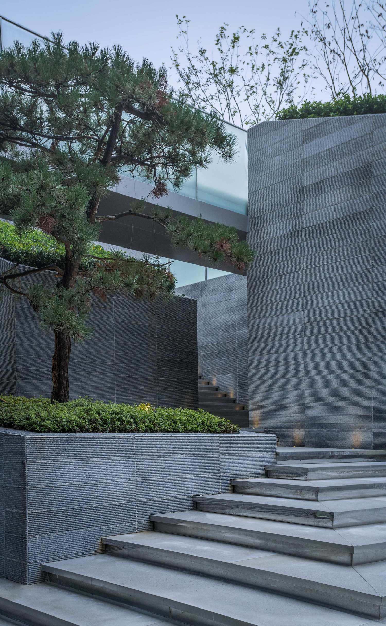 三进空间以“山”为主题,本项目下沉庭院本身的空间尺度非常的好,有足够的余地去做一下不一样的处理。设计之初发现地下一层在面向下沉庭院的空间正好是个品茶室,所以萌发了山下茶茗,陋室观山的想法,用了超大尺度的山形花池搭配苍劲有力的造型松营造出峭壁苍松美妙场景,同时将上山之路隐于其中,上面搭建悬桥与之相连,串起整条动线。厚重苍劲的山、空灵飘渺的桥,亦实亦虚,相得益彰,无论从室内、室外、山下、桥上都能有不一样的体会感受,横看成岭侧成峰,远近高低各不同,谓之“见山”。