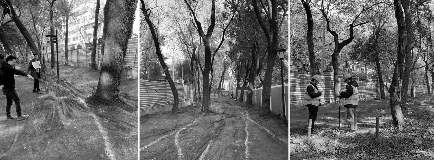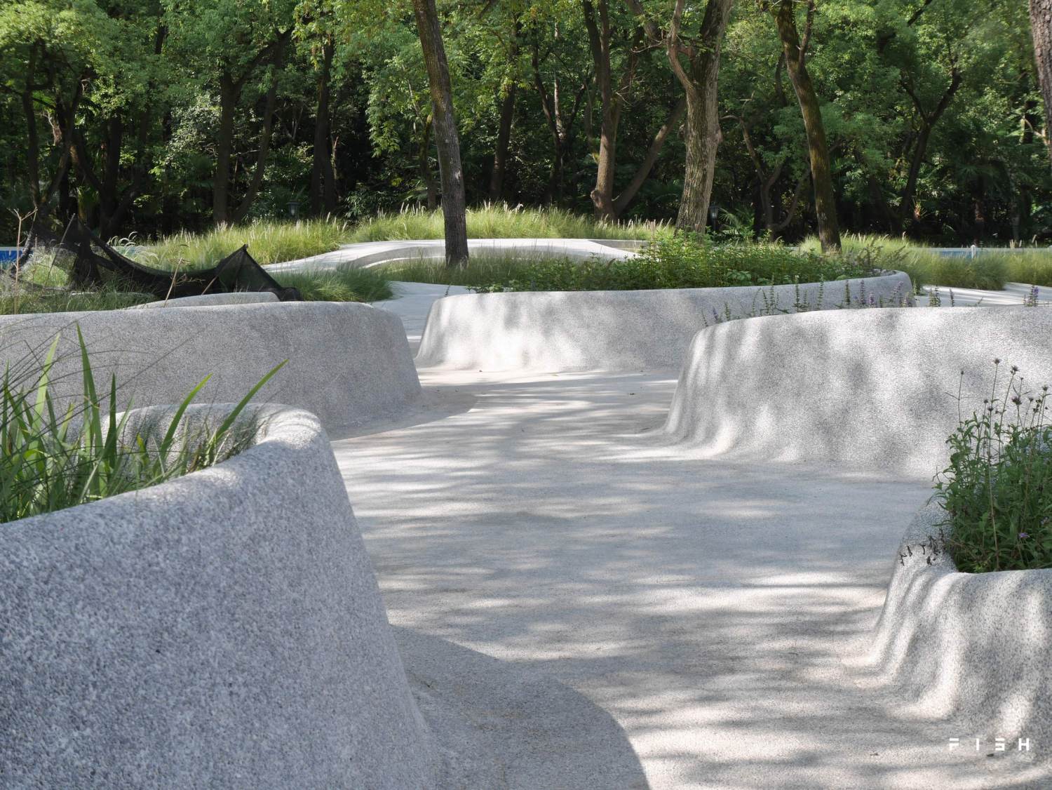 实际落地过程更像是让自然做设计:仔细调研现场大树的点位、树木的长势方向、相互之间的错位关系后,用弯曲的线形规避所有大树的树根。通过反复多次的现场与设计图纸的修正,最终才能呈现出诗意流畅的步道线形。