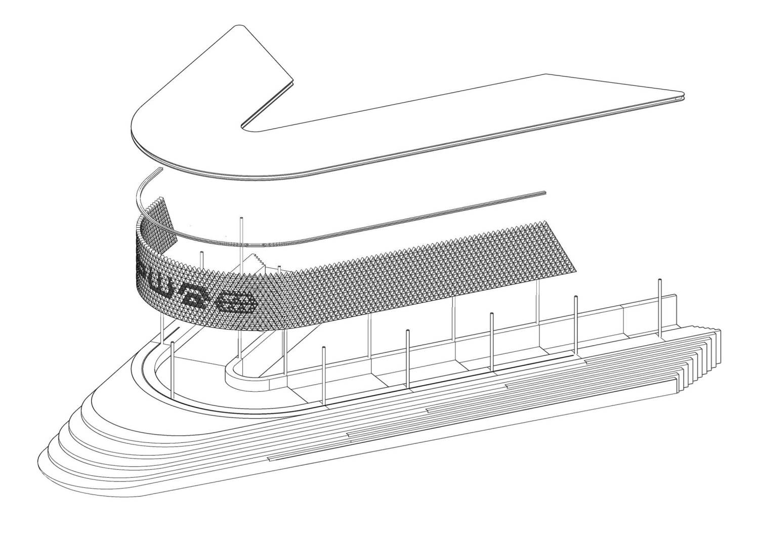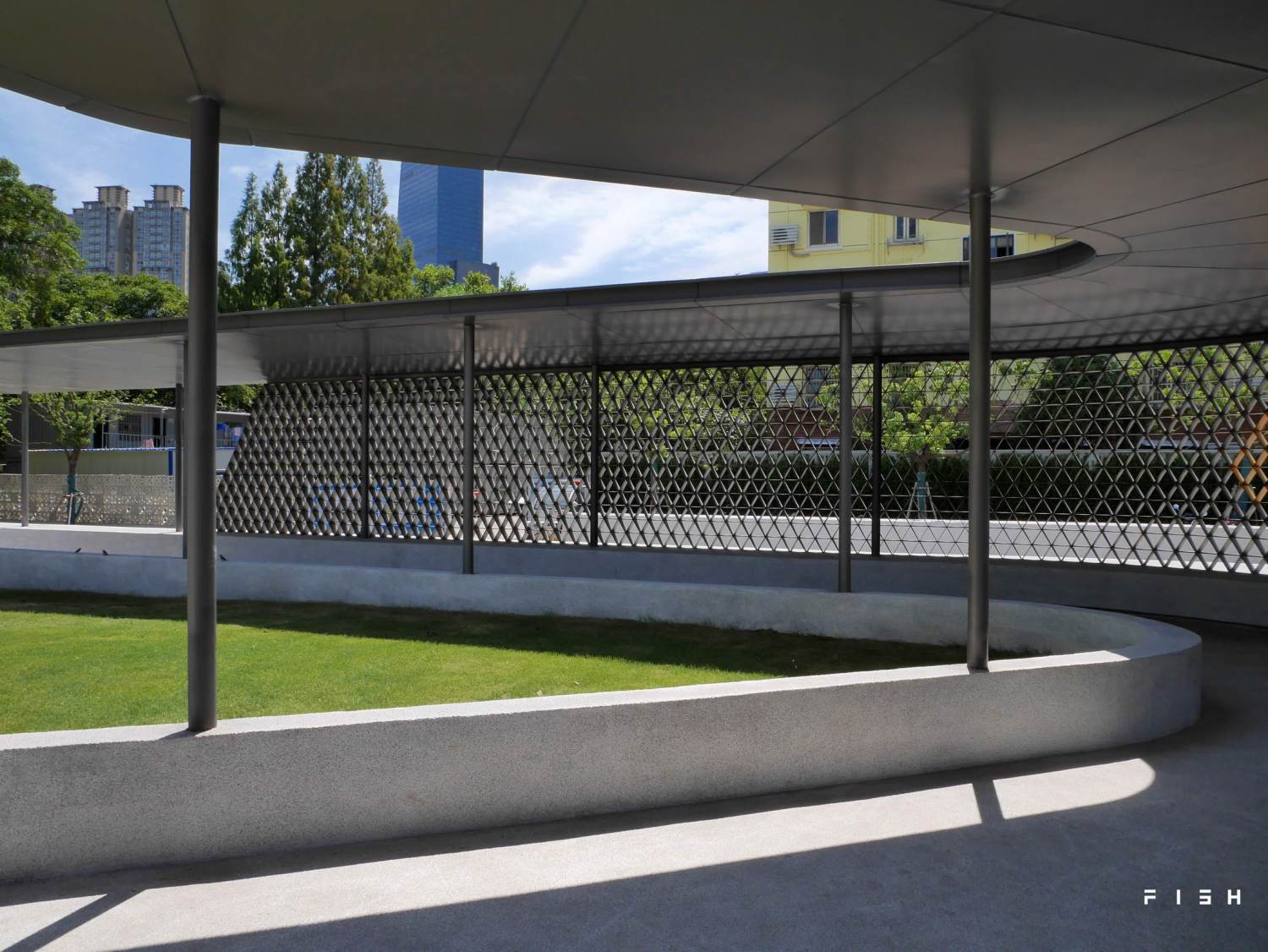通透的三角形格栅结构使廊架内外的环境交织起来,是内部使用者和外部观赏者都能获得参与感的拓展型口袋空间。对内,简洁的座椅使人停留;对外,弧形柔和的语言给人们留下亲切的第一印象,抽象的鹅黄色Logo形成有点戏剧性的外部效果。