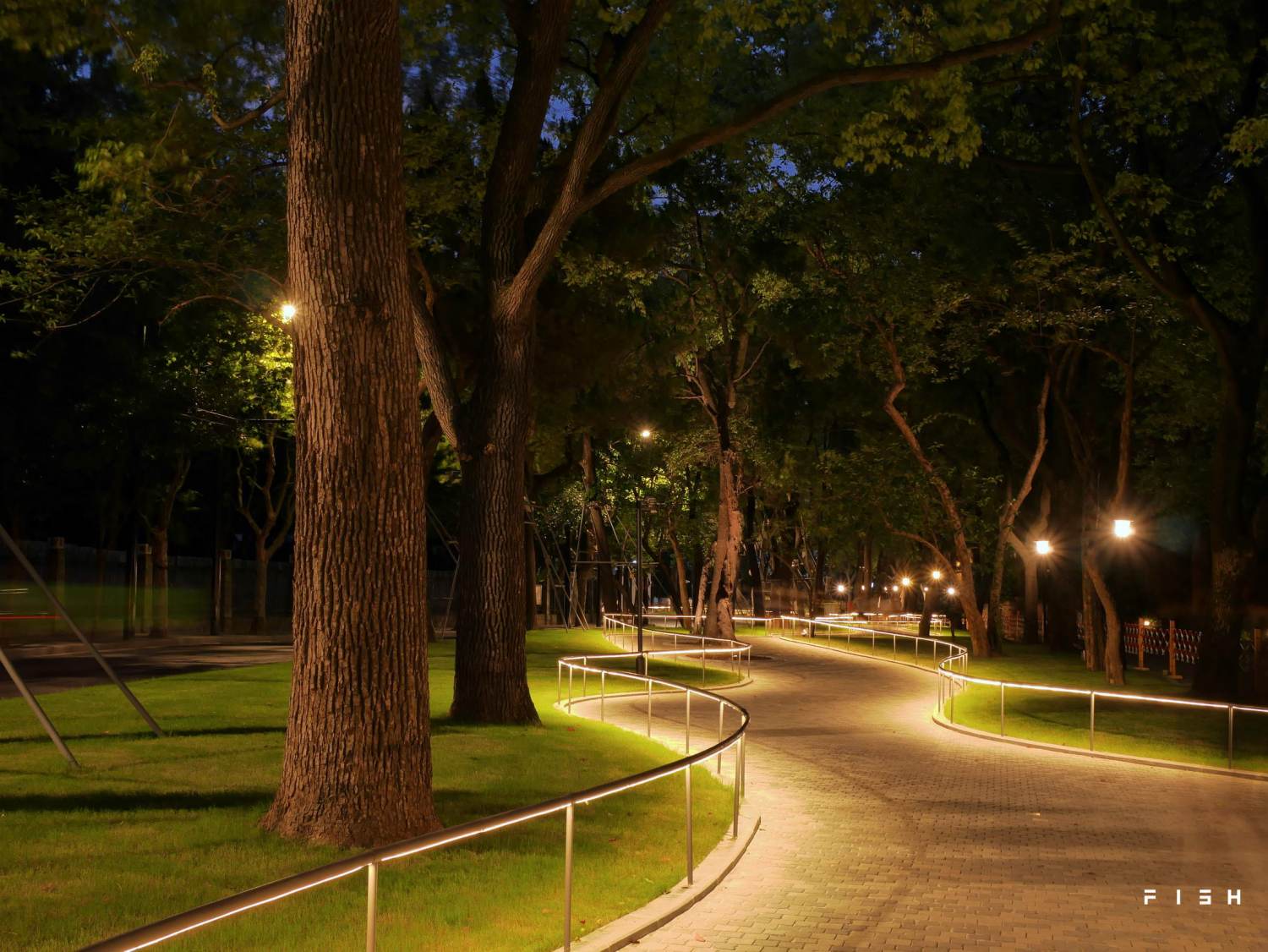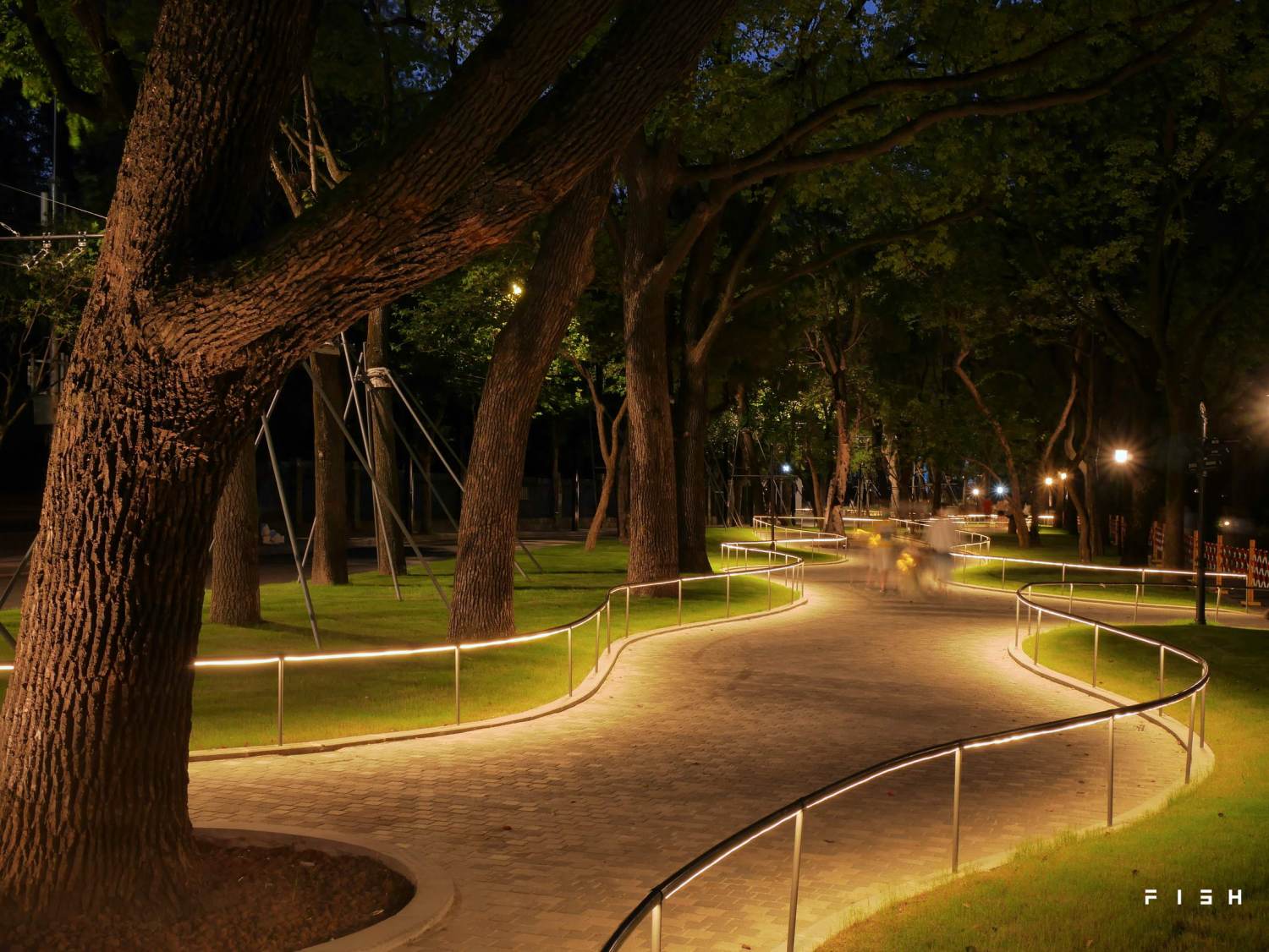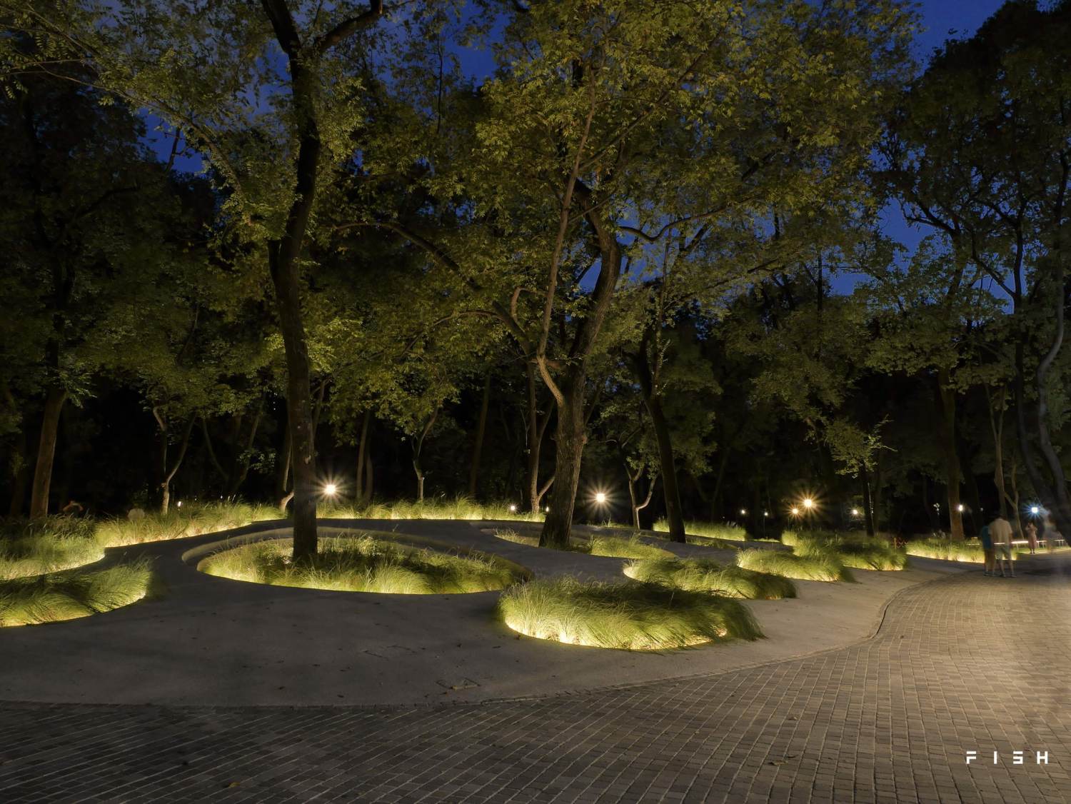林荫道的地面在反复研究后决定采用多种颜色混拼的方砖花岗岩来铺设,白水泥勾缝后显得复古又时尚。为了强化步道弯曲起伏的空间特色,我们在道路两侧设置蜿蜒连续的矮栏杆,华灯初上,两条柔和的光带穿行林间,形成一道靓丽的风景线。