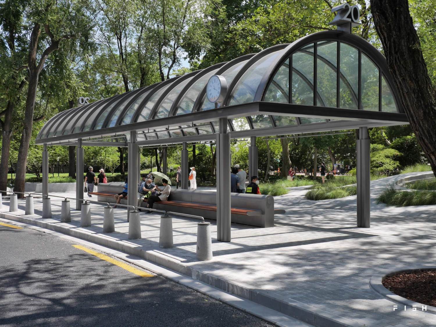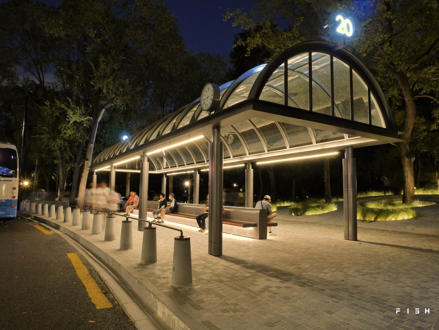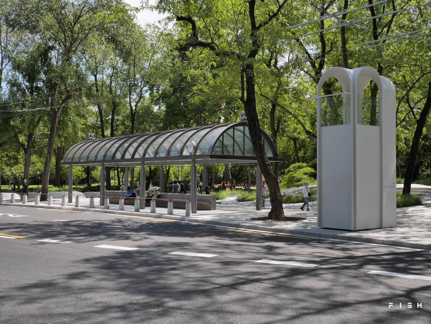 2号门围墙外是20路公交电车的始发站,围墙打开后,我们面临的另一个挑战是如何将公交车站与开放广场完美整合起来。在对英式公交设施、建筑进行深入研究后,我们决定为20路电车设计一处独特的候车空间。
