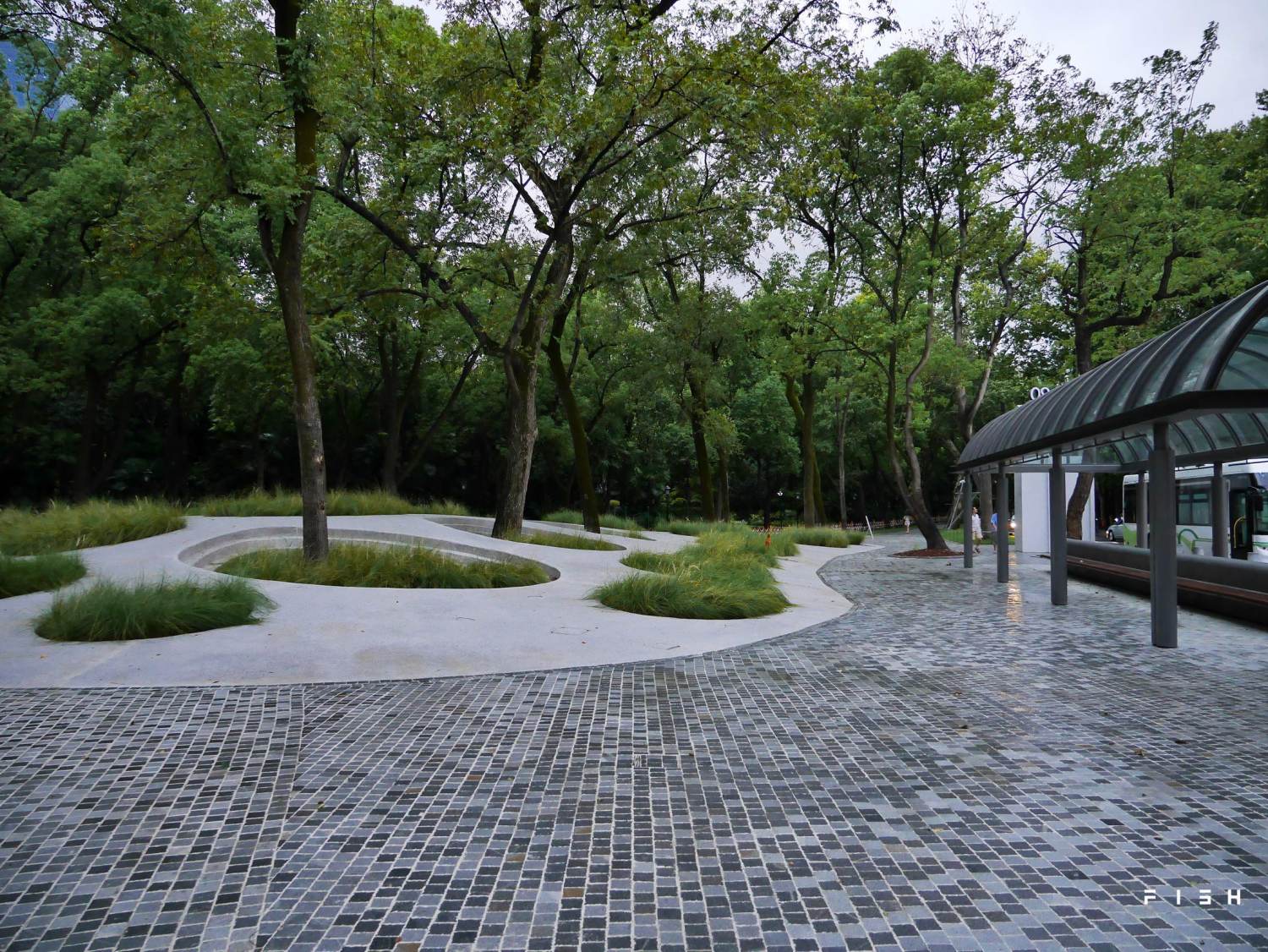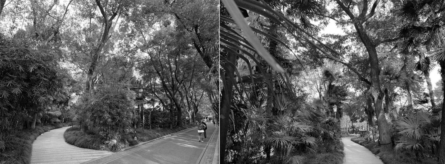 围墙打开后我们将人行道迁移到公园内部,通过移除中层植物,铺设全新的石材铺地,从而打造属于百年公园区段独特的慢行景观。