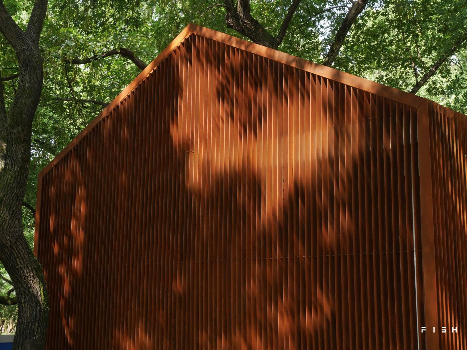 漫步道沿线的公厕面貌陈旧,内部设施老化,是我们这次重点改造的建筑之一。通过“穿衣戴帽”的方式,在原建筑的外轮廓上包裹一层新的表皮,用耐候钢格栅作为主导材质,形成了一种密集而持续的韵律,在光影的作用下塑造出强烈而独特的质感。竖向格栅与人视线行进的方向成直角关系,在行进的过程中建筑外观呈现出完全不同的面貌,为市民带来更多元的视觉感受。