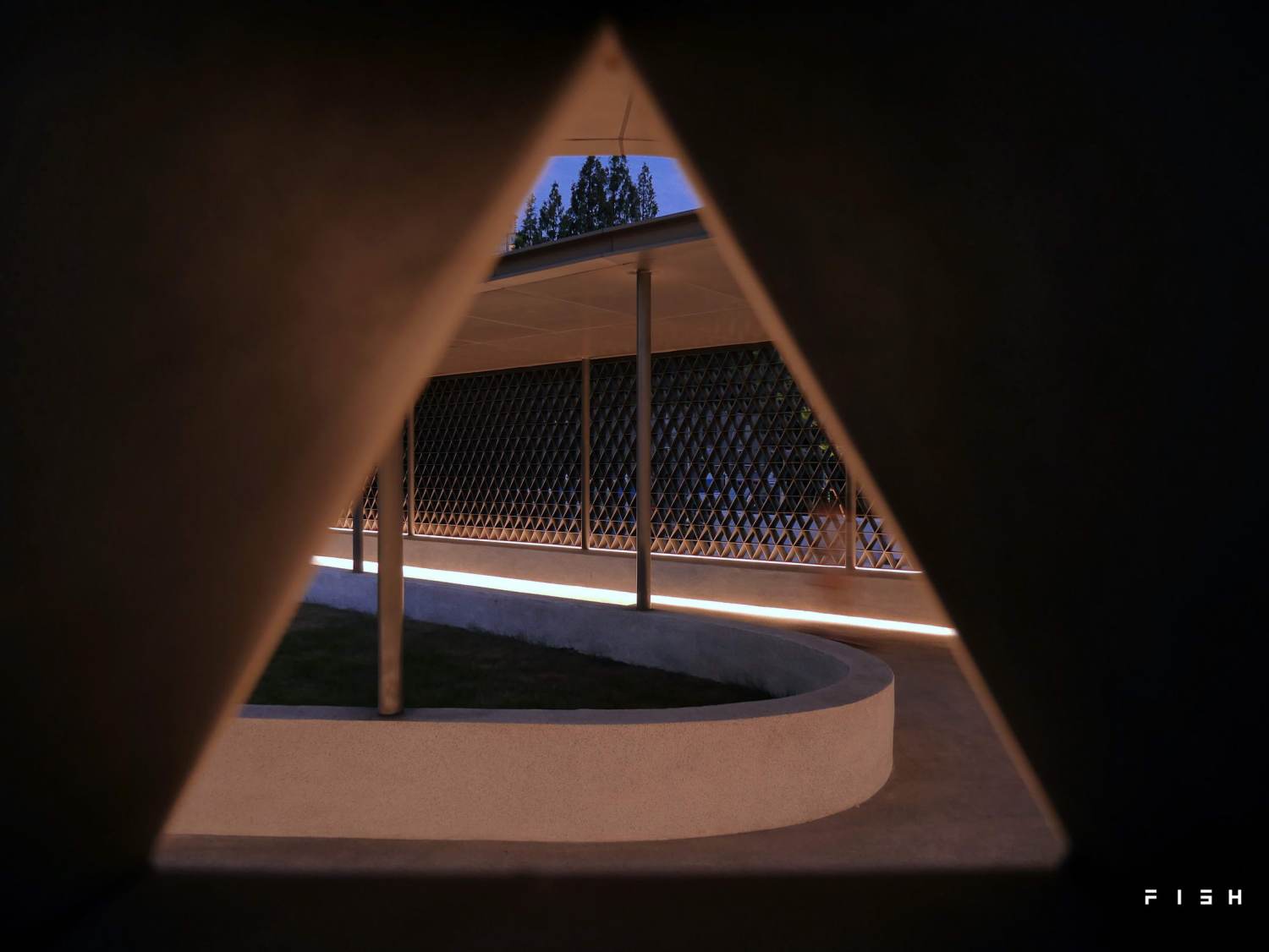 廊架的设计通过简单的弧线彰显几何的美感,以极简风格,结合通透且有秩序的三角形格栅所打造。仿佛就是命中注定的那样,廊架与梧桐古树呈现出了完美的对望关系,坐在廊架里可以静静地欣赏着这棵古树的新生,聆听百年前的古树讲述今天的故事。