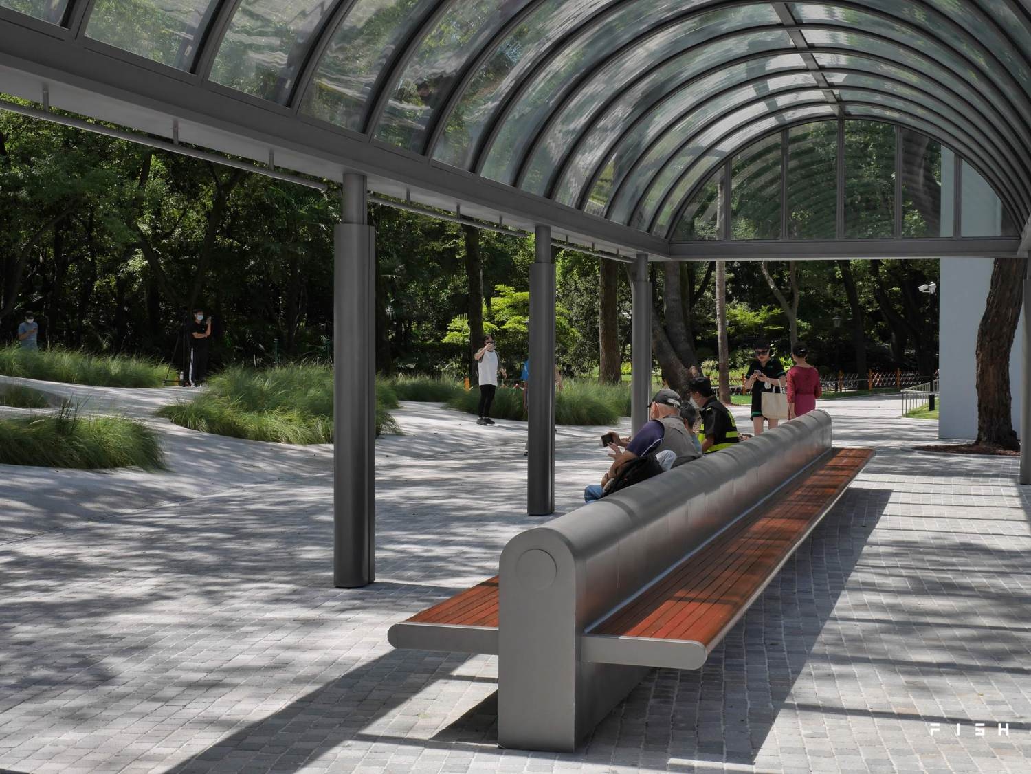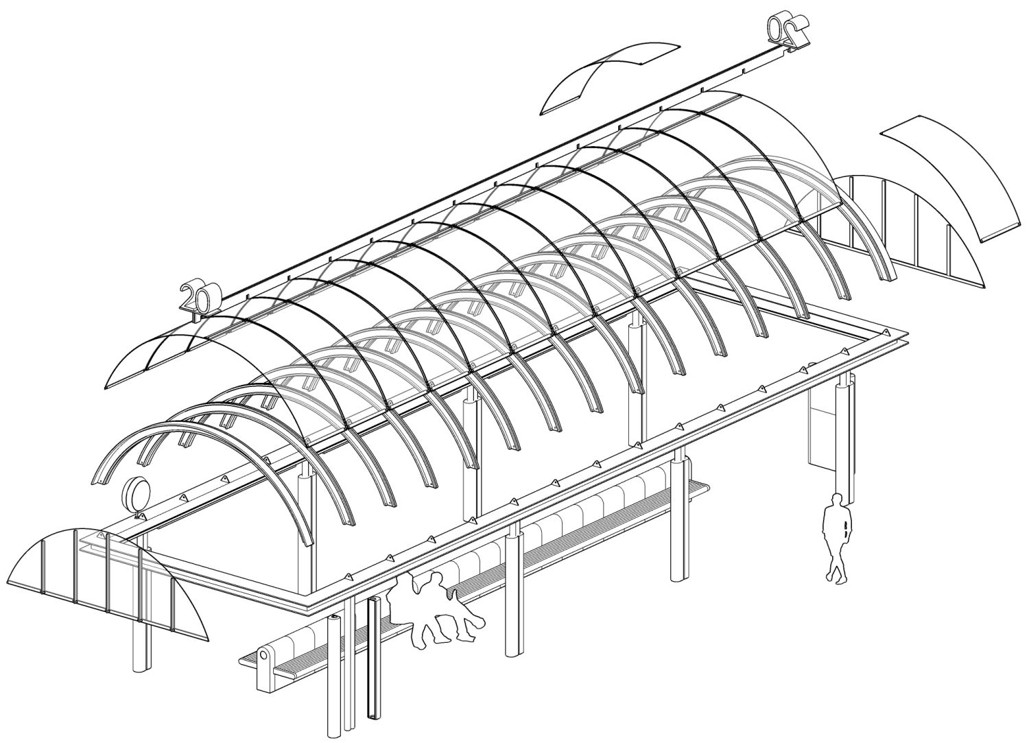 通过连续的拱券与立柱的组合形成一座能够遮风避雨的候车亭,这种结构形式保证了廊架跨度中间可以取消横梁和立柱,为廊架下面提供充足的休闲等候空间。