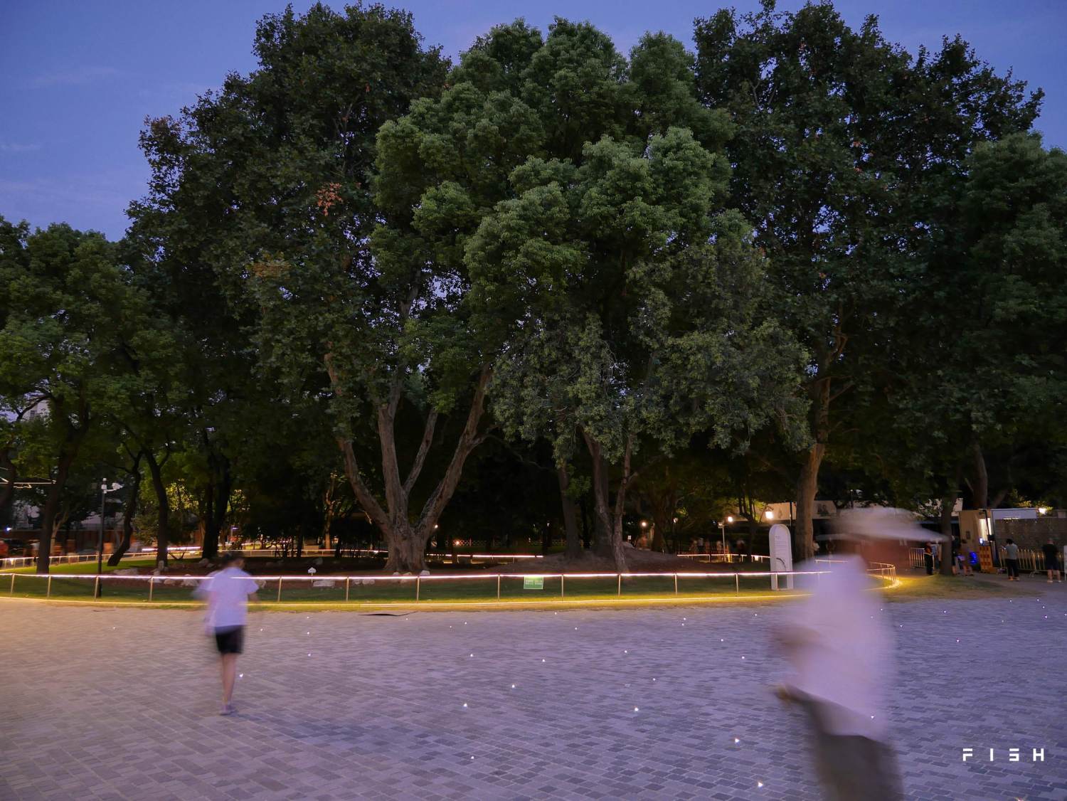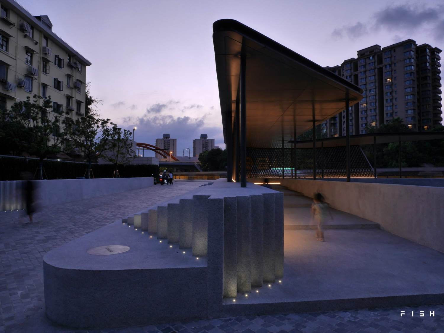 抬高的地坪在解决场地高差问题的同时增强场所感,这种有趣的内外视线关系丰富了空间层次。廊架的颜色我们选择了类似于钢板原色的冷色调,整体呈现出一个有沉淀,有厚度的氛围。不仅和周边环境和铺装融为一体,也与中山公园深厚的历史积淀相呼应。