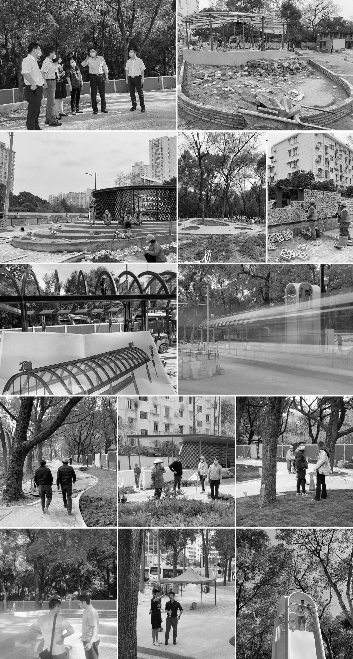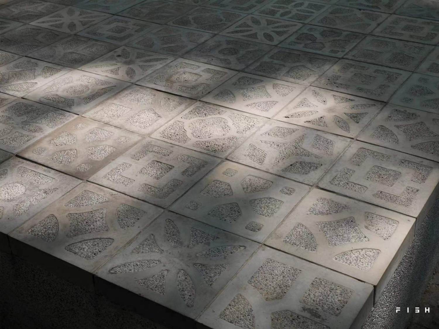 有趣的是,在设计元素的运用上我们还是能希望通过捕捉历史价值的方法留住传统的风格与记忆。这时公园内一个古老廊架上的花砖装饰引起了我们的注意,我们让施工队找了很多类似的花格砖,运用在铺装和景墙上,呈现出来的效果在光影的作用下为场地增加了一丝复古和新意。