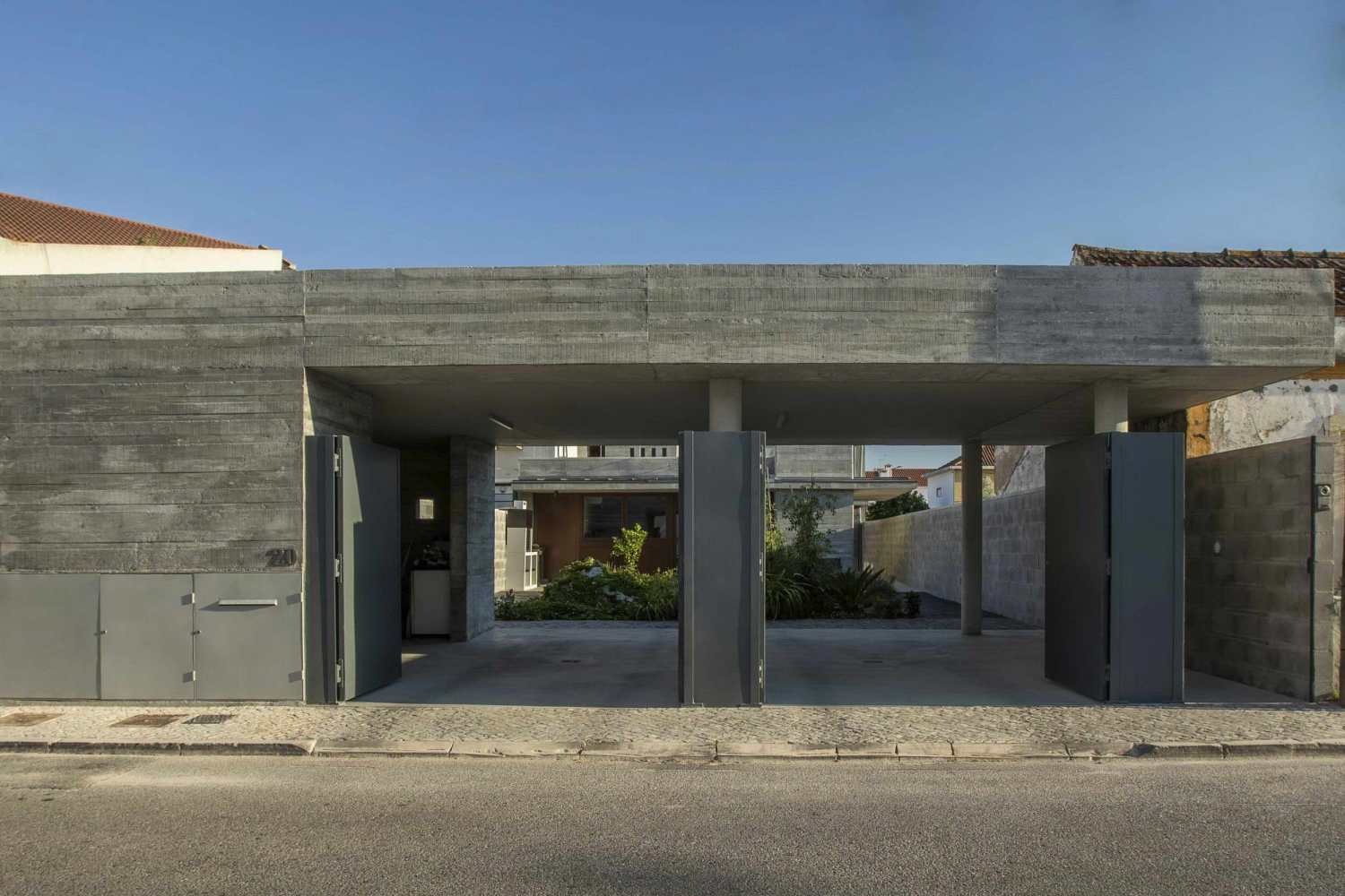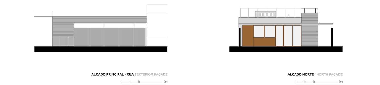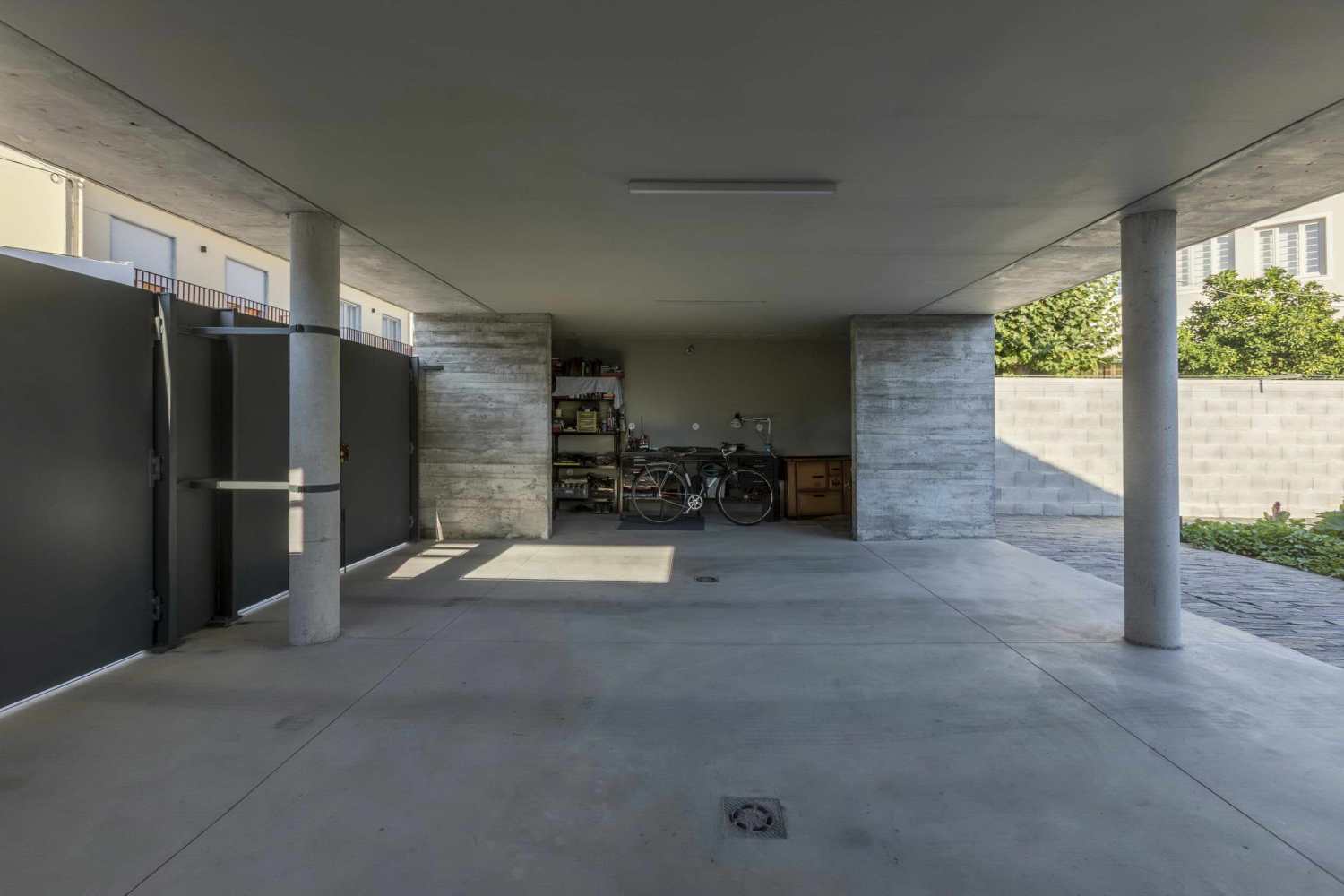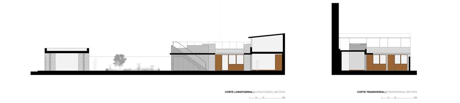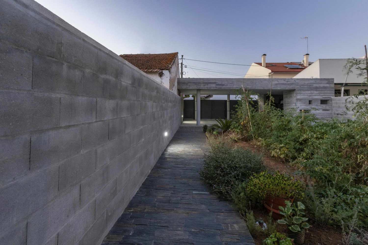 A fourth volume is positioned at the opposite end of the lot, relating directly to the street and configuring a vegetable garden to the interior, which makes the transition between the entrance / garage / workshop and the permanent living area.