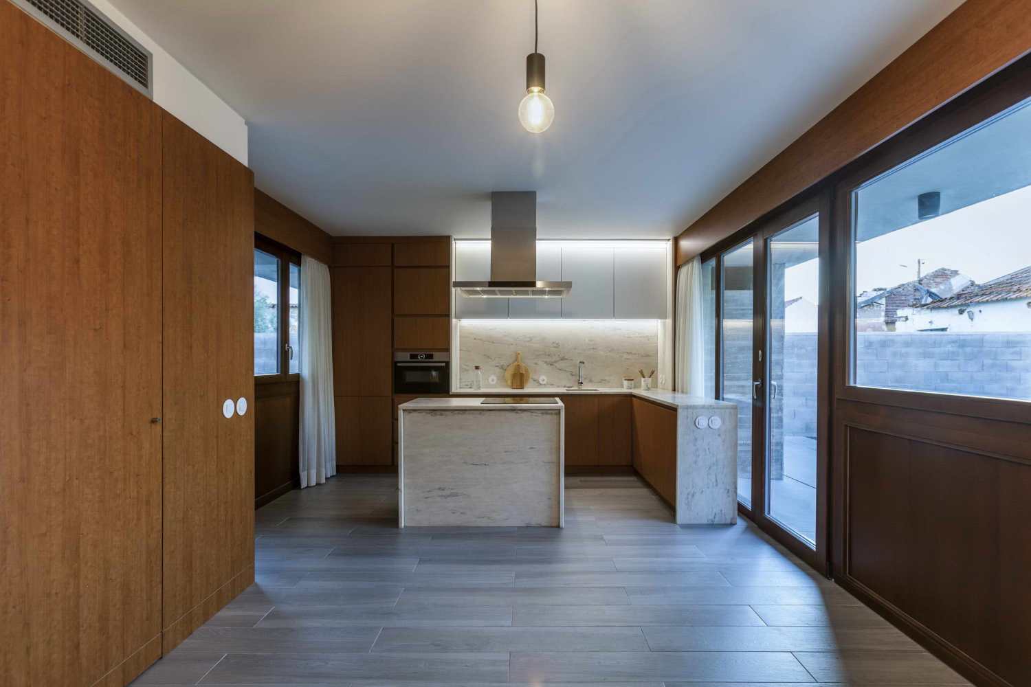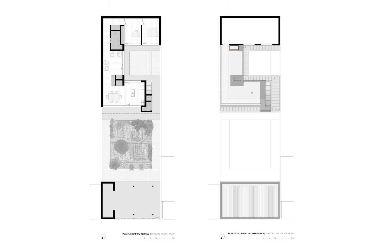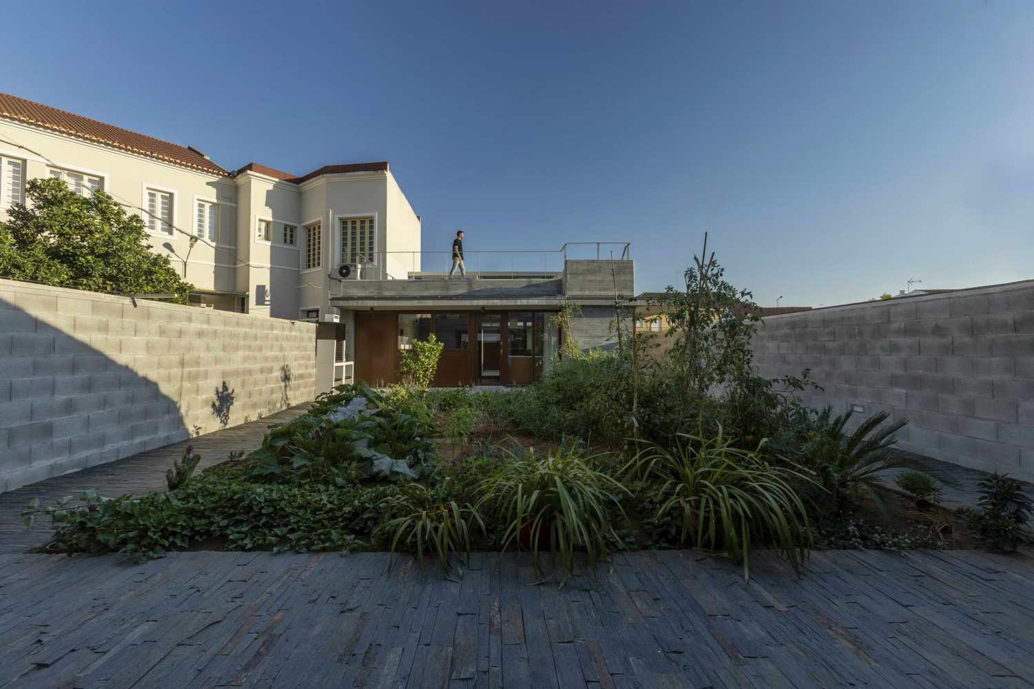 A fourth volume is positioned at the opposite end of the lot, relating directly to the street and configuring a vegetable garden to the interior, which makes the transition between the entrance / garage / workshop and the permanent living area.