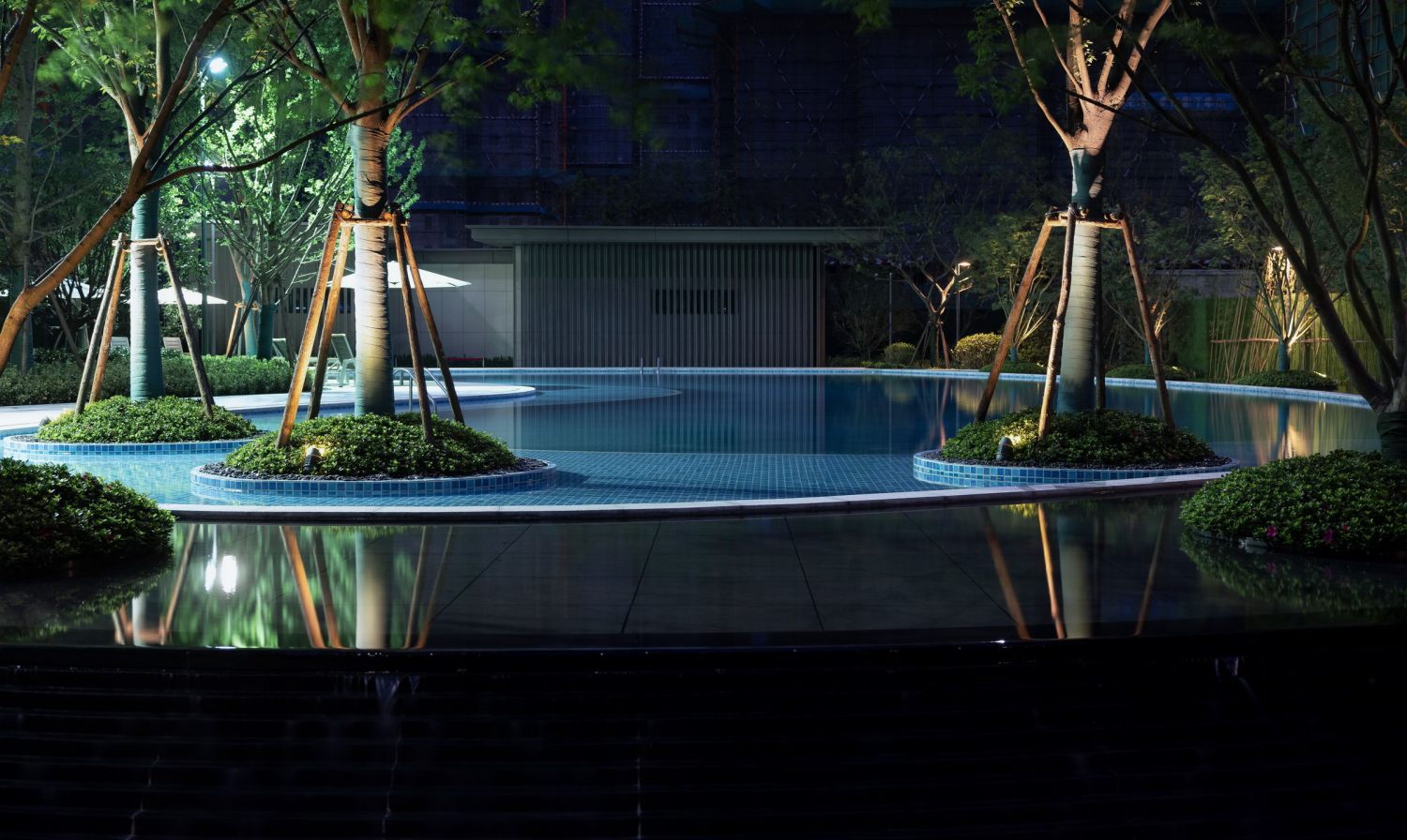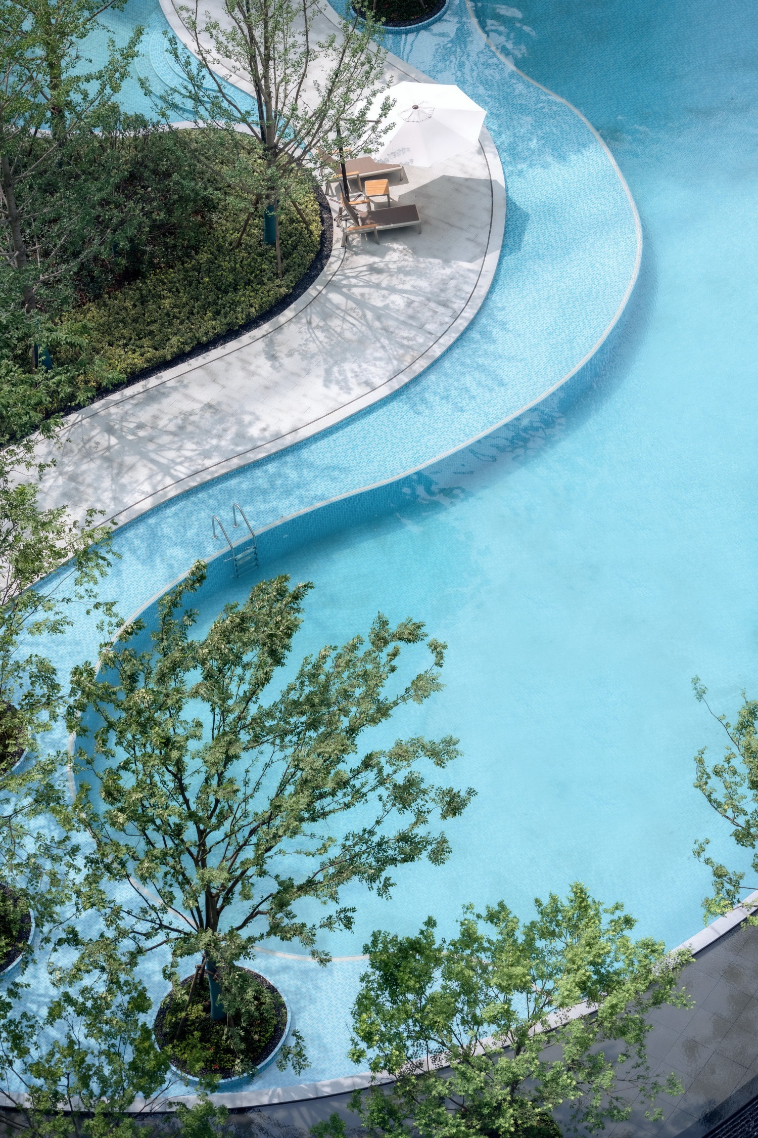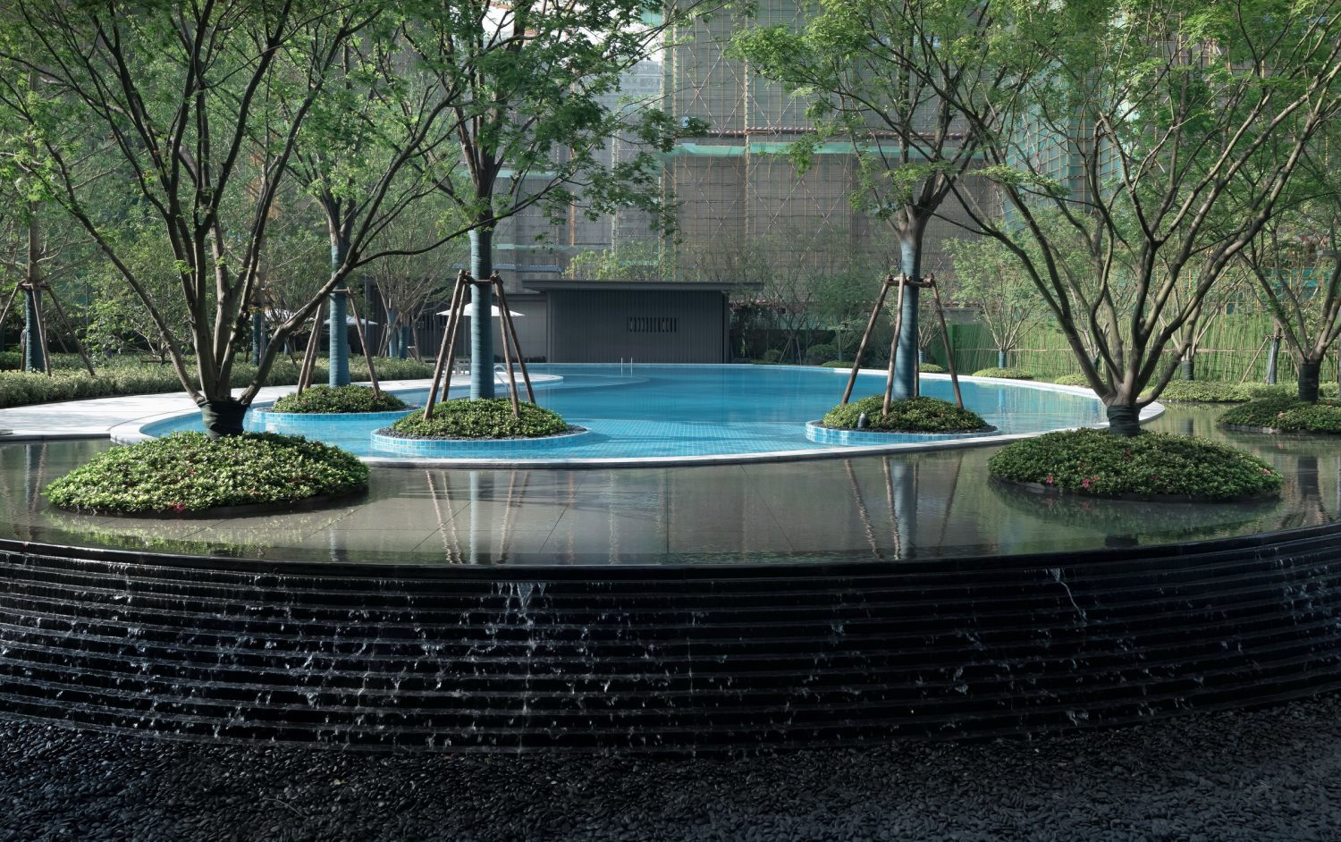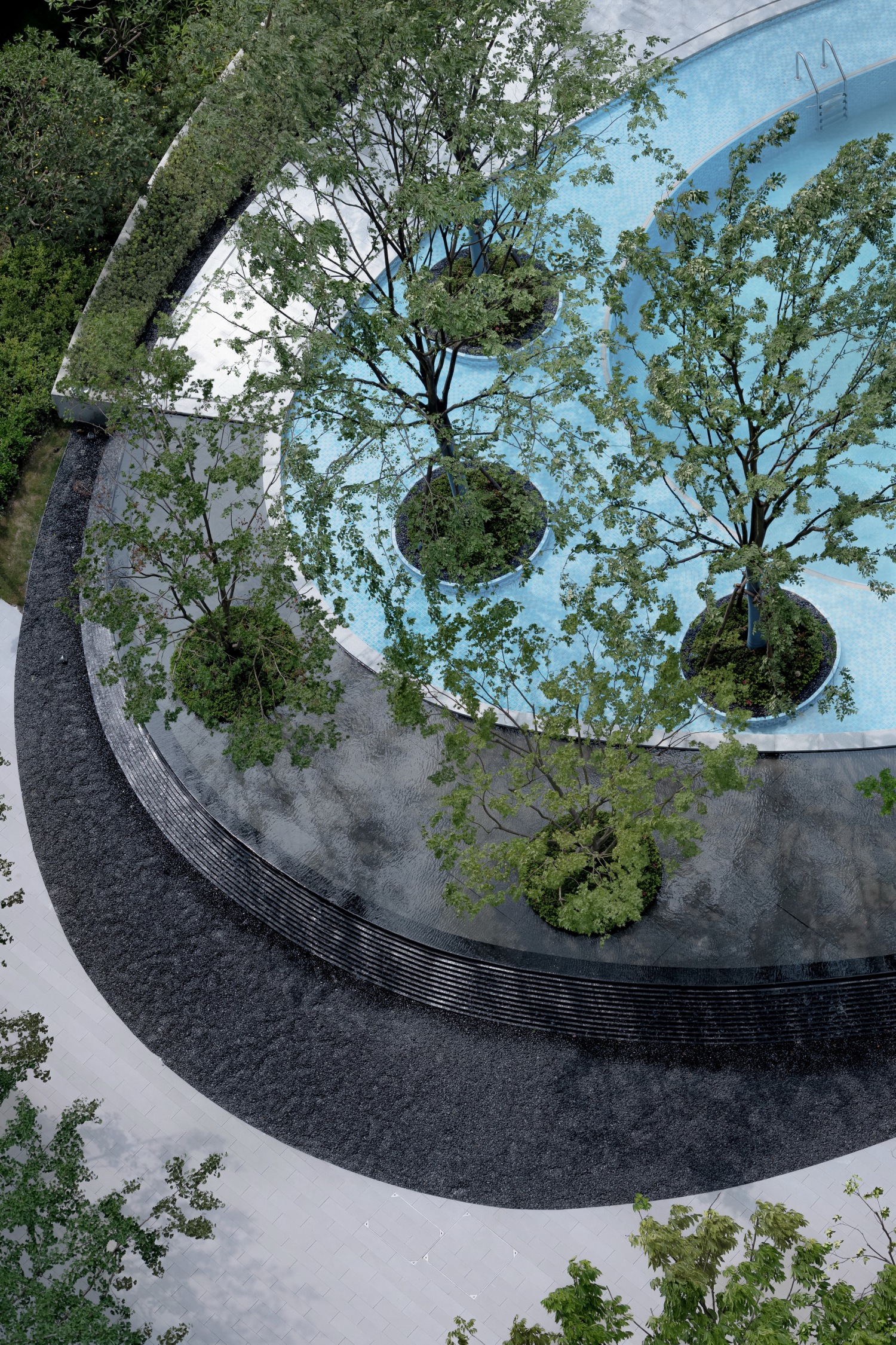 泳池在两个圆弧包裹下呈现“心形”,有美好、关怀、归心的寓意。泳池独立管控,仅一个出入口进出;内部分成人池和儿童池,成人池边界有多层级消耗高差,更加安全,西南方向有阵列树池装点,软性围合,对内保证泳池的无边性,也使空间私密、轻松,对外有自然形成的潺潺叠水,趣味涌动;儿童池紧邻成人池,面积较小,深度较浅,成人便于看护。