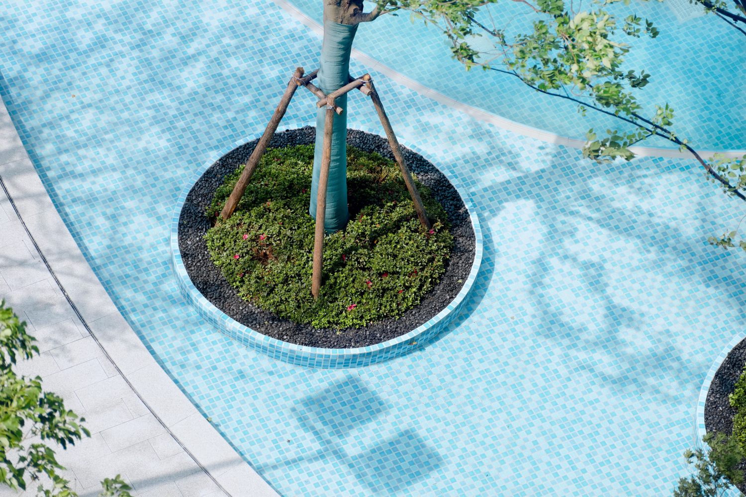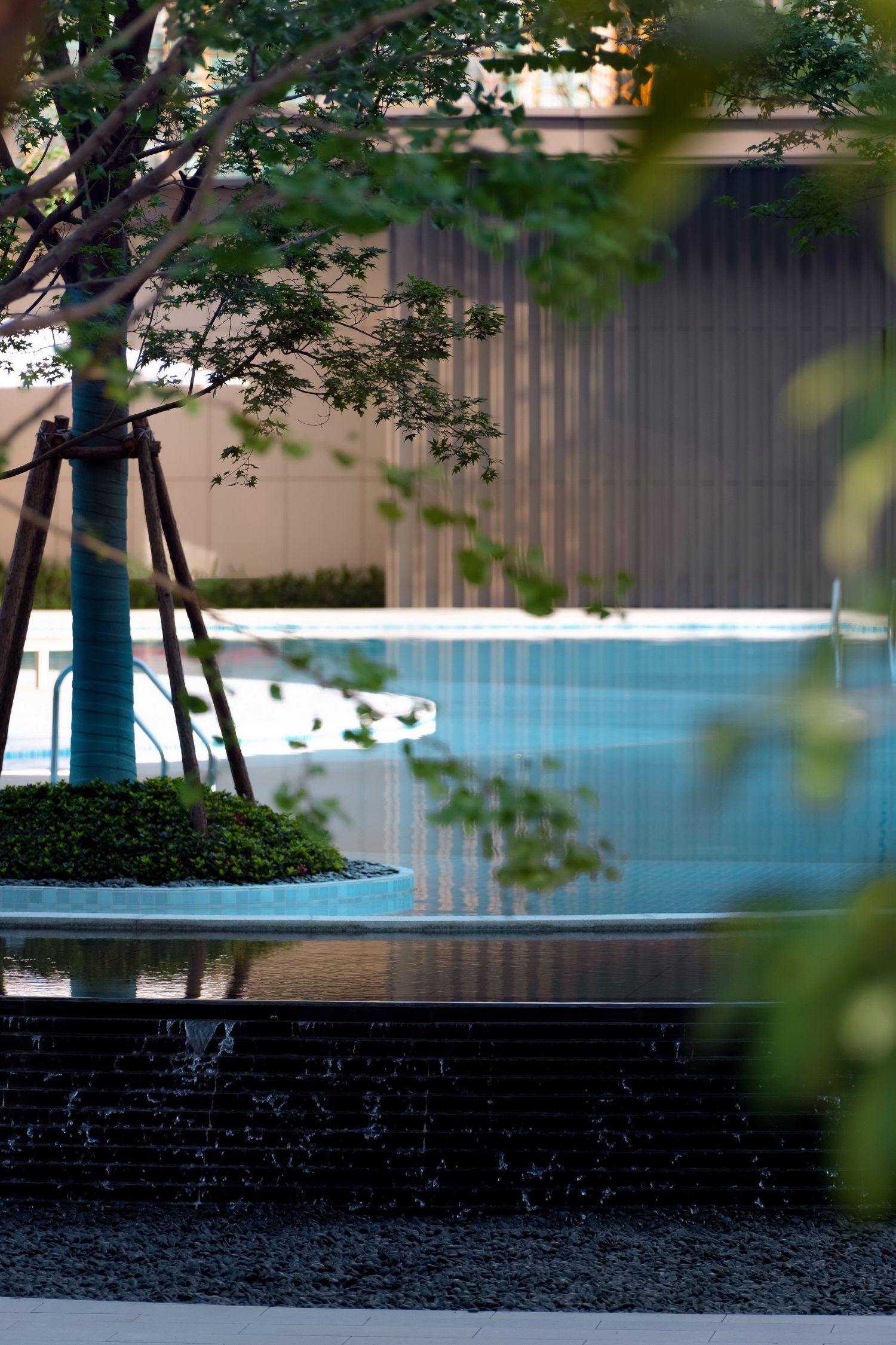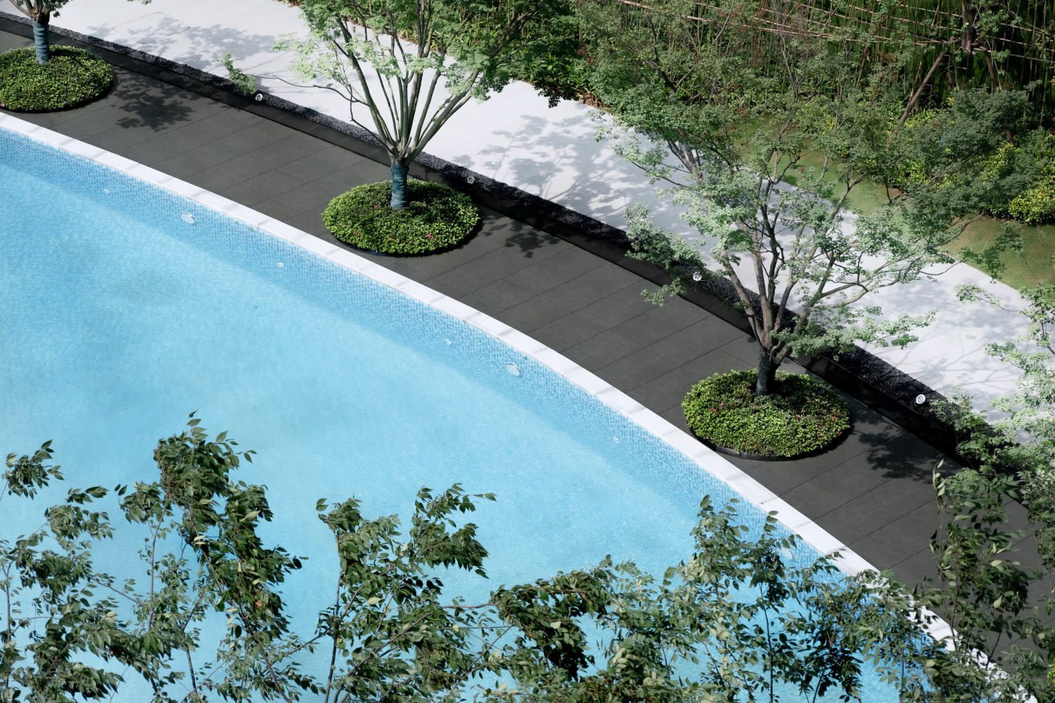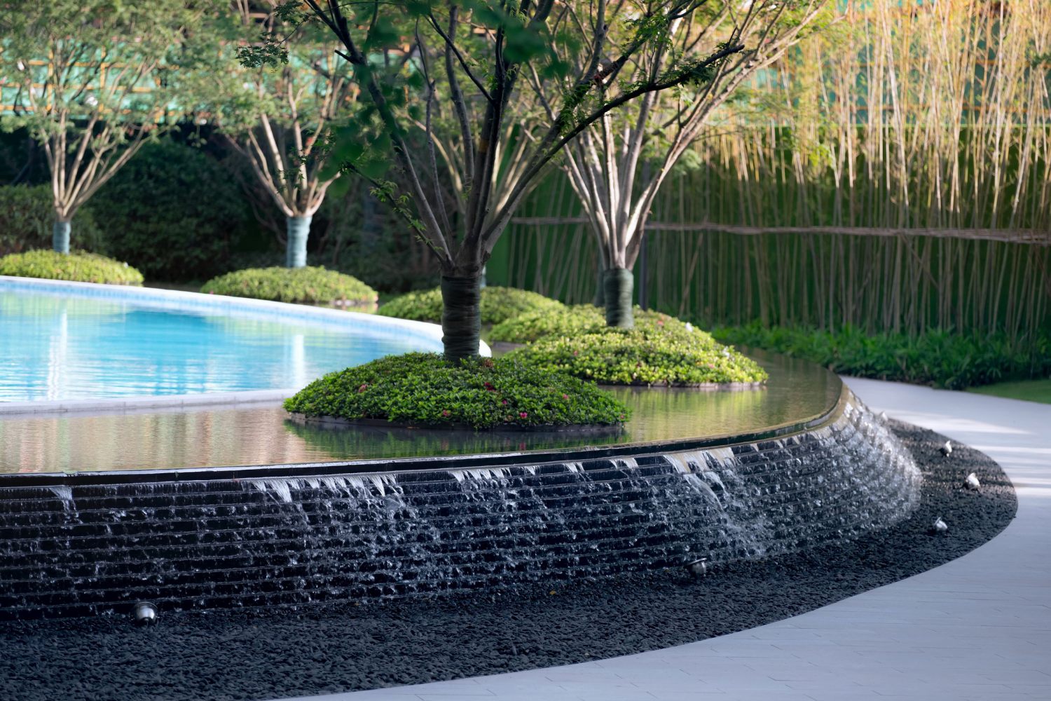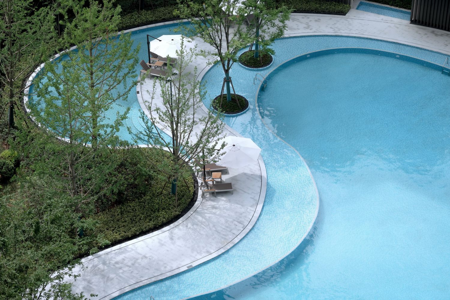 泳池在两个圆弧包裹下呈现“心形”,有美好、关怀、归心的寓意。泳池独立管控,仅一个出入口进出;内部分成人池和儿童池,成人池边界有多层级消耗高差,更加安全,西南方向有阵列树池装点,软性围合,对内保证泳池的无边性,也使空间私密、轻松,对外有自然形成的潺潺叠水,趣味涌动;儿童池紧邻成人池,面积较小,深度较浅,成人便于看护。