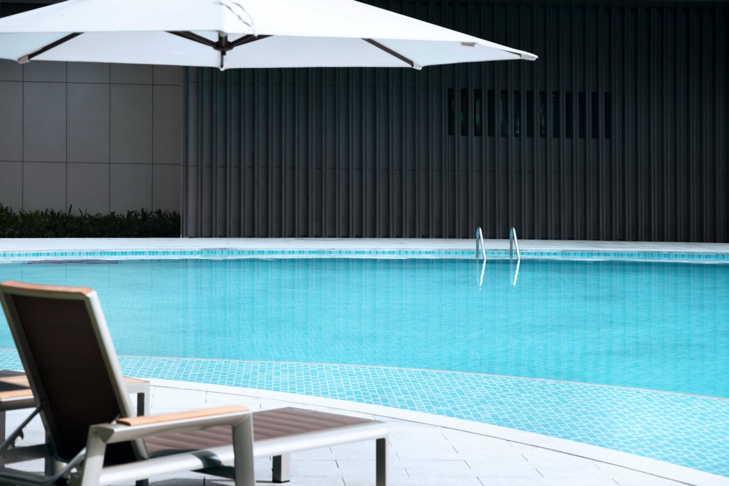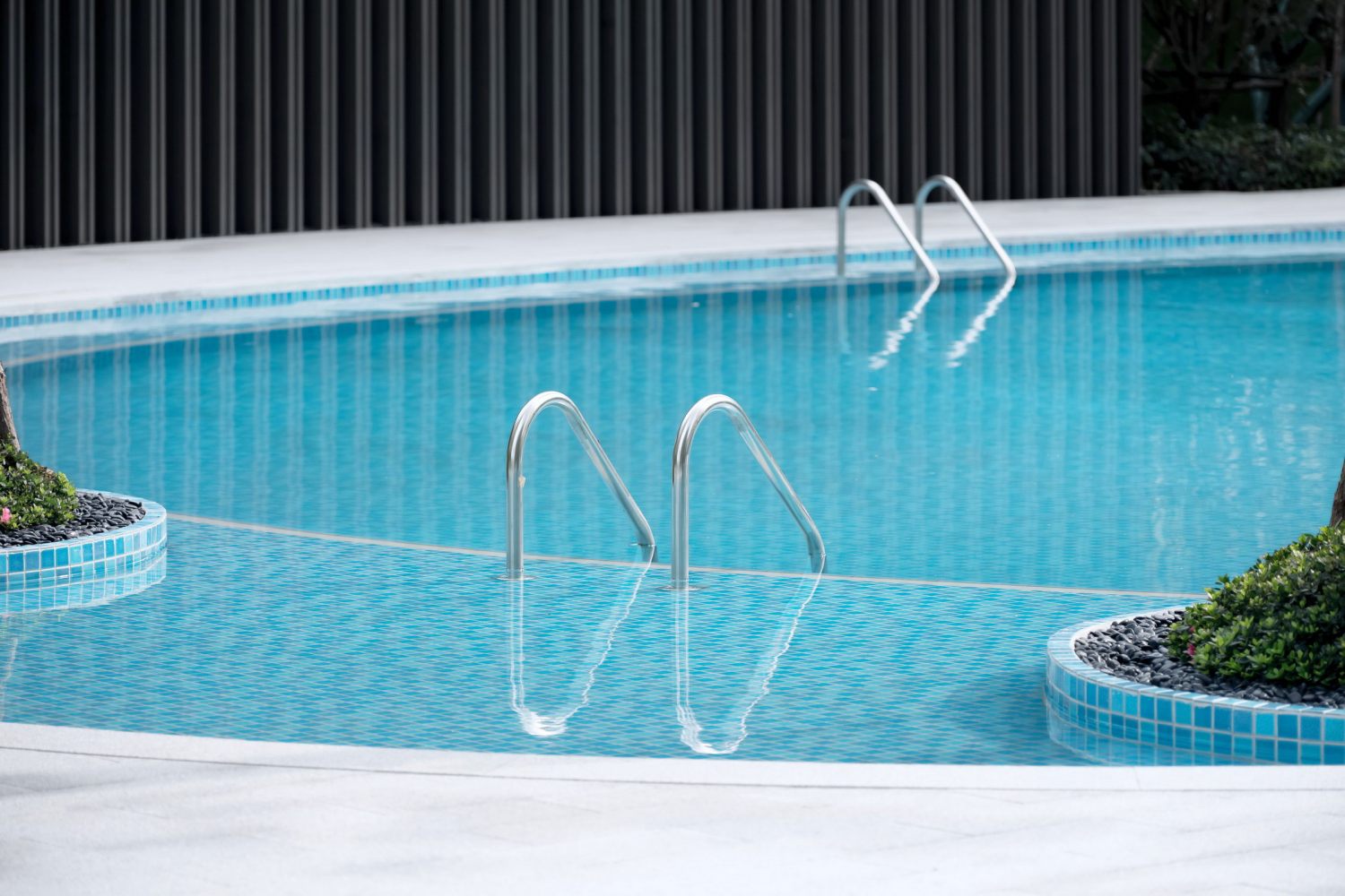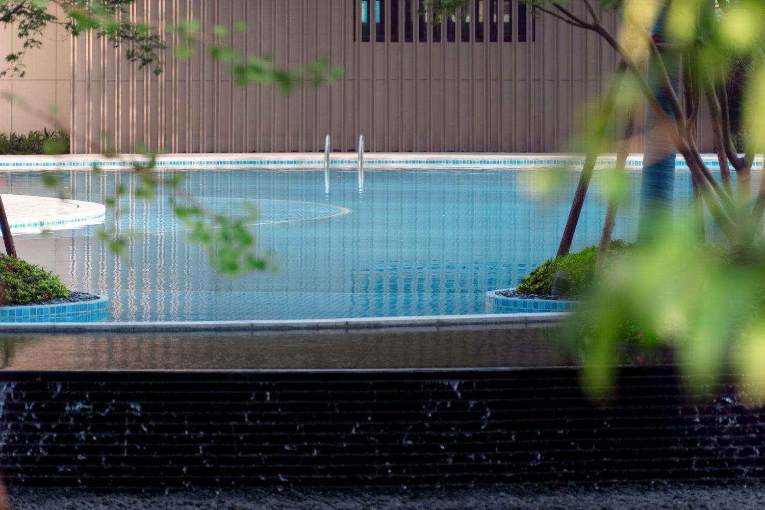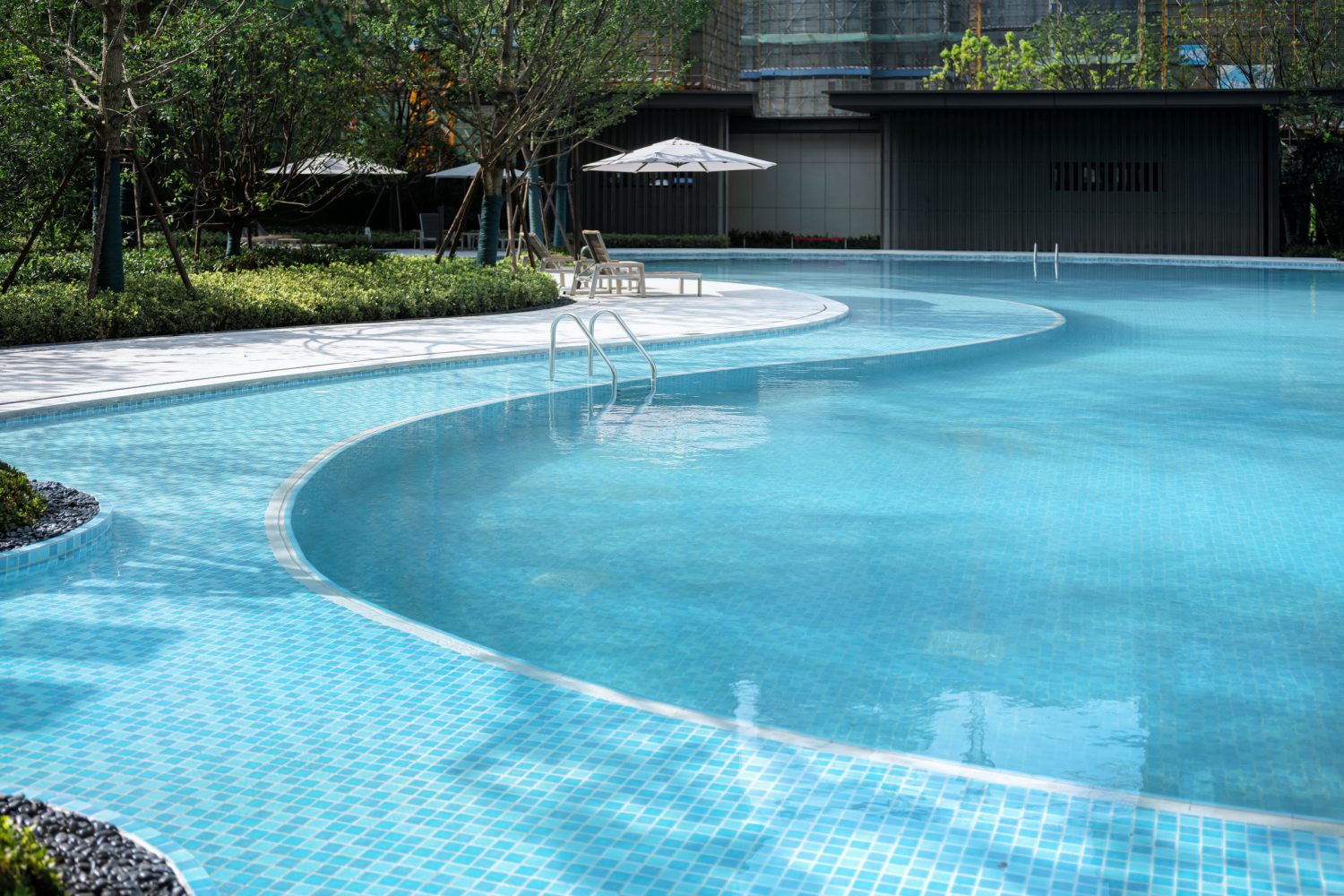 泳池在两个圆弧包裹下呈现“心形”,有美好、关怀、归心的寓意。泳池独立管控,仅一个出入口进出;内部分成人池和儿童池,成人池边界有多层级消耗高差,更加安全,西南方向有阵列树池装点,软性围合,对内保证泳池的无边性,也使空间私密、轻松,对外有自然形成的潺潺叠水,趣味涌动;儿童池紧邻成人池,面积较小,深度较浅,成人便于看护。