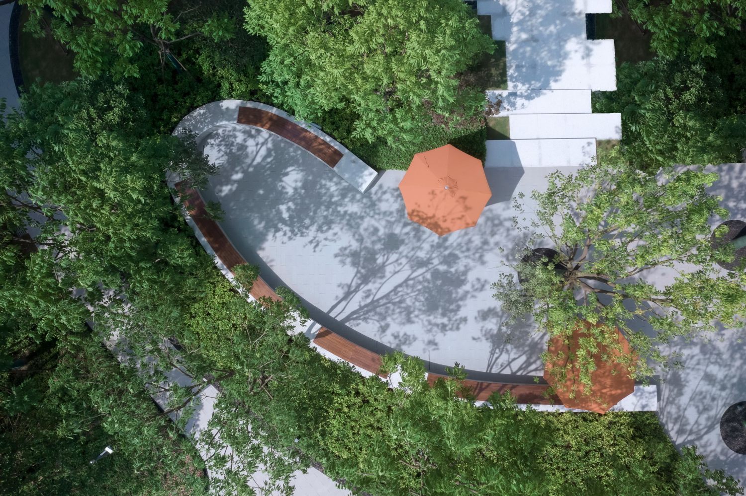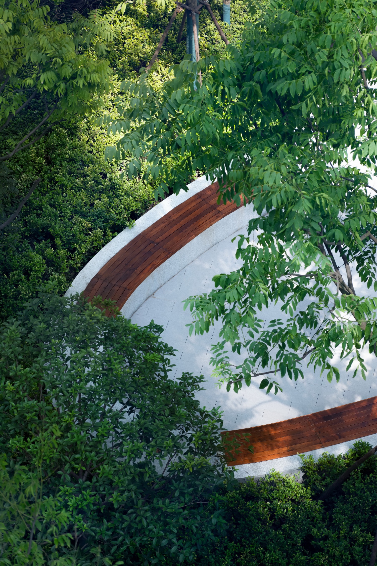 林下会客厅位于主入口轴线与南北轴线交汇处。周围由草坡微地形围合,地势整体抬起,被满目的绿意包裹,听蝉鸣风动。沉浸于社区绿色森林中,乔木与座椅点缀其间,让人霎那静下心来,侃侃而谈,树木掩映中尽是动人的欢声笑语。是居民小憩、聚会的好去处。