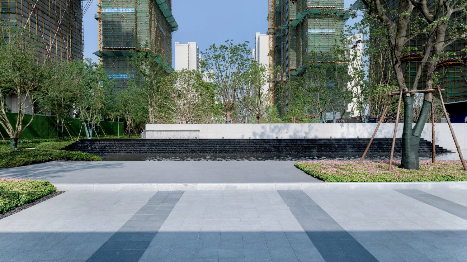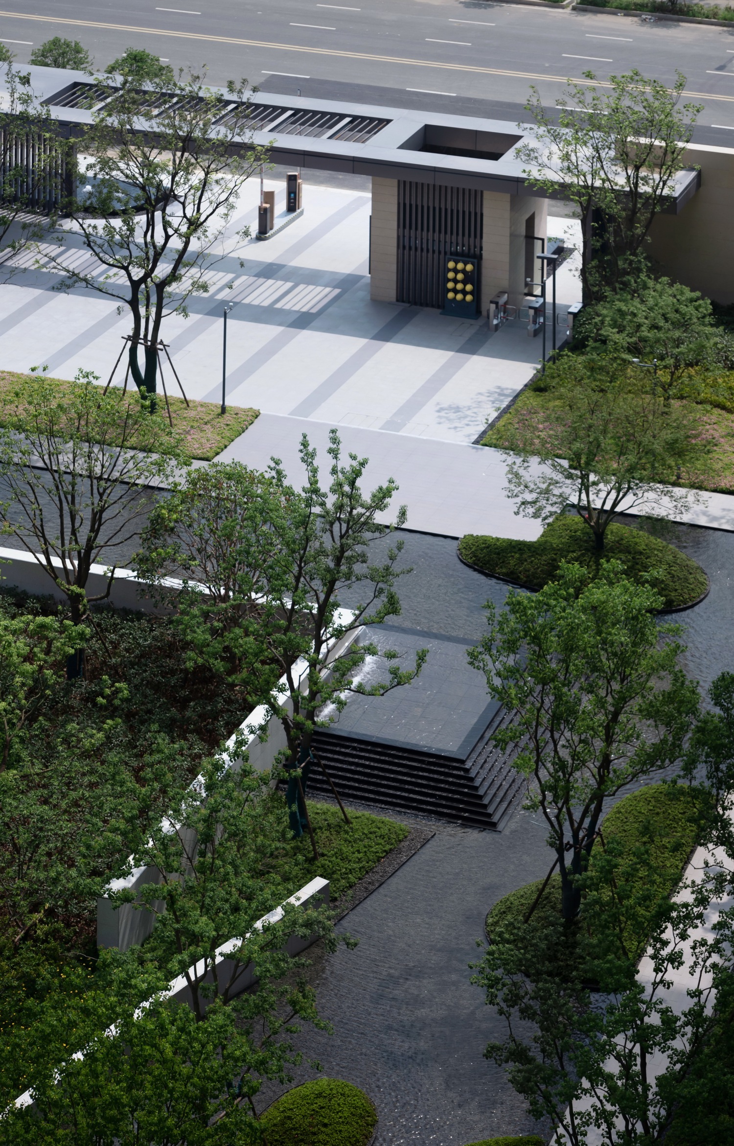 入口两侧高低错落的墙体,增加空间的序列性与层次感,加强城市立面的视觉焦点;正入口用新鲜的层级乔灌木作为“照壁”,控制视线,营造绿意盎然的生态社区;两侧水景增强归家动线仪式感。伴水而归,循序渐进,在行进过程中,逐渐提升私属感与温馨感。