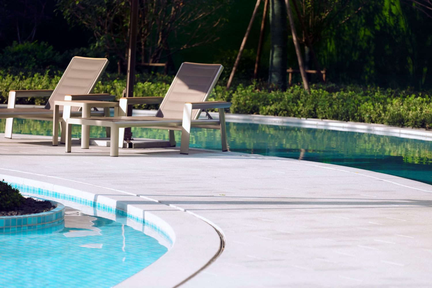南北、东西双轴交互式景观,双轴既要灵动,又需沉稳,主次要变幻,动静需结合。因此景观方提出了“横平竖曲”的想法,意为南北向公共区域,打造鲜活自由的生活轴线,东西向打造快速、私属的归家轴线。由此,轻松的的曲线环抱泳池,稳重的平直动线接入其中。