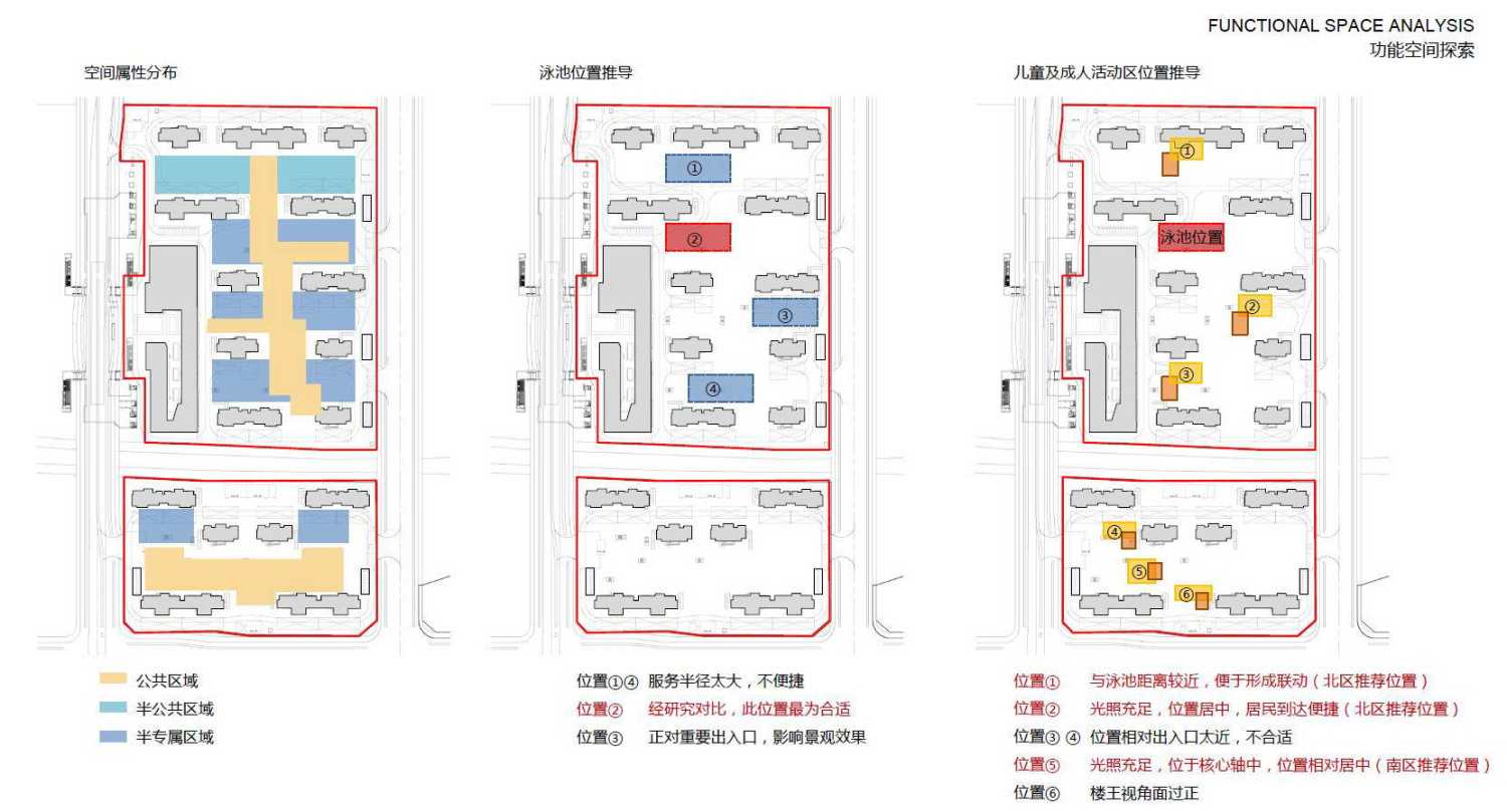 泳池位于项目核心区,泳池的位置推敲是本设计最大的难点之一。设计之初,泳池位置的摆放被提出了多种可能性及考量。