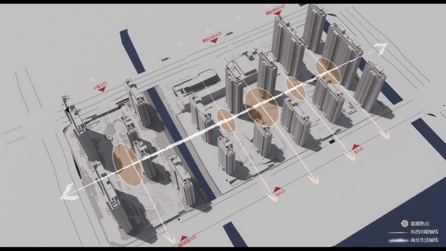 园区建筑为均布式布局,为了充分利用景观资源,项目东侧主要以17层高层为主,形成一个南北地块高层组团内部,并均匀划分宅间空间。并根据光照情况,每栋建筑都配有一个空间可观的南向花园空间,与南北轴横向空间几成等比。设计由此一改传统式单轴统筹景观,演变为十字双轴交互景观。南北、东西轴线相交处自然而然形成为景观焦点。