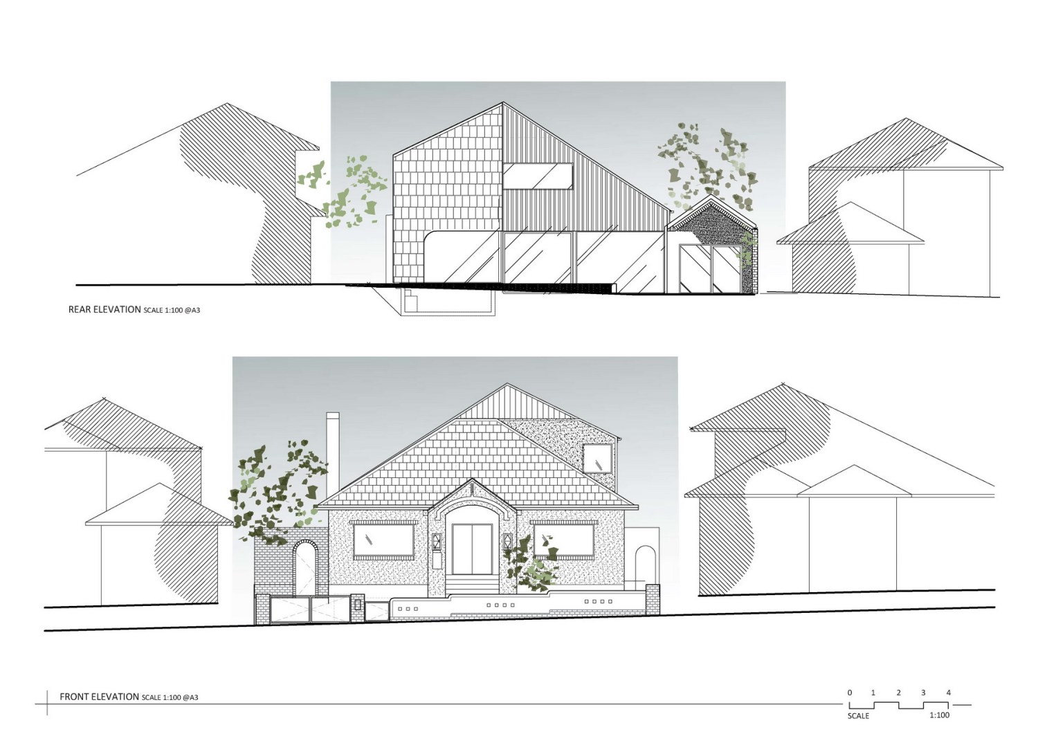 Through the careful retention of the existing floor plan, roofing tiles, gable forms, small brick garage, simple decorative timber work and textured renders typify the homes in this historic estate, and forms the language for this modern adaptation.