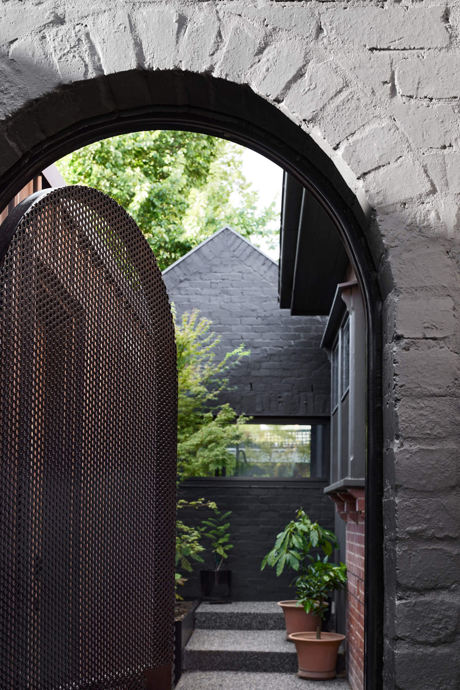 A distinctly modern addition is created at the rear of the house, providing open living spaces for the family. The geometry of the roofline as well as the ceramic glazed materiality are a reference to the sloping tile roof of the original building. The classic arch detailing around the entry door is mirrored in a modern counterpart where the glazed opening is framed by and arched cut-out.