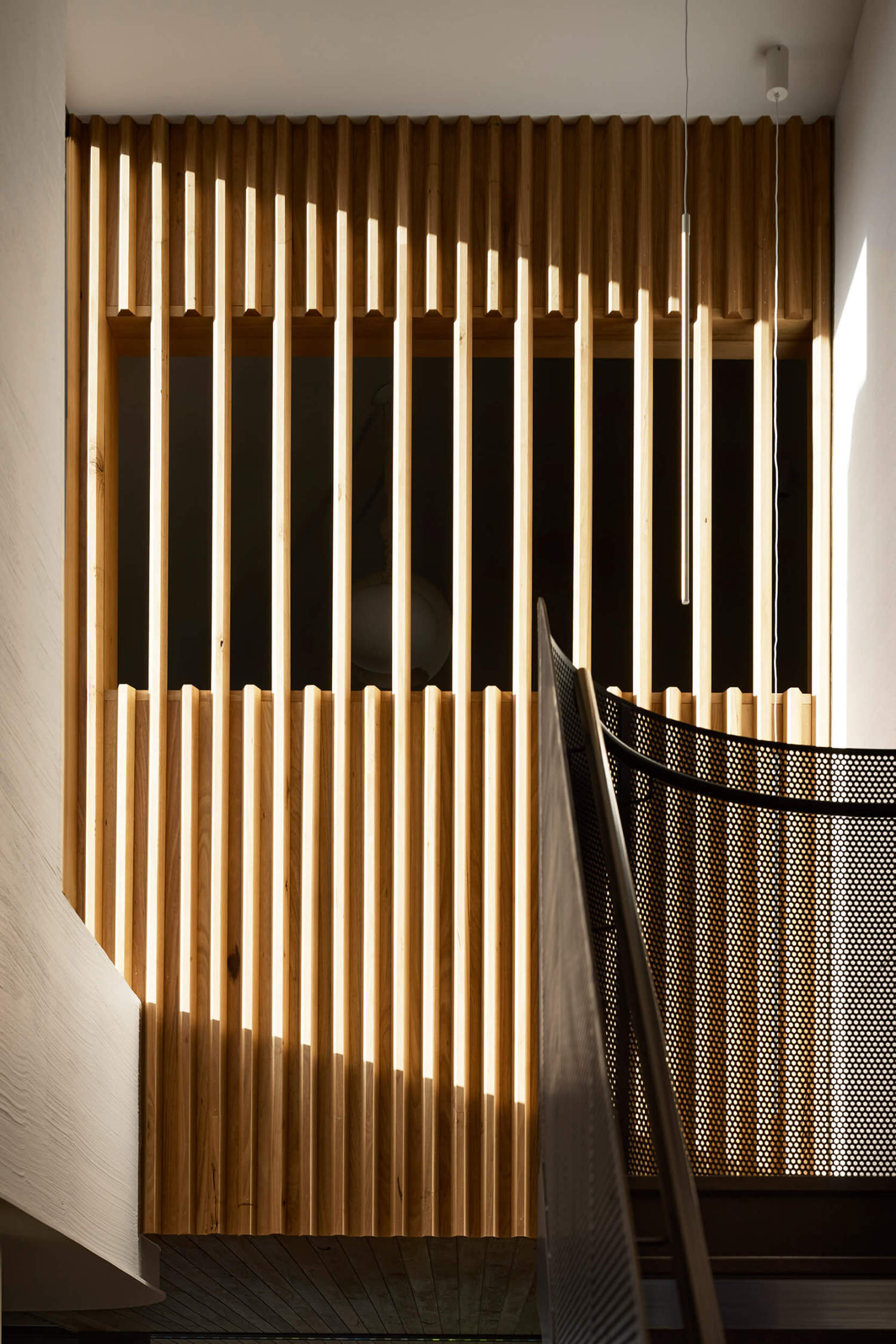 To meet the brief for 'light filled, whilst retaining warmth and texture', a top lit, double height entry void was carved from the home's centre, with raked plaster and timber screens filtering light.