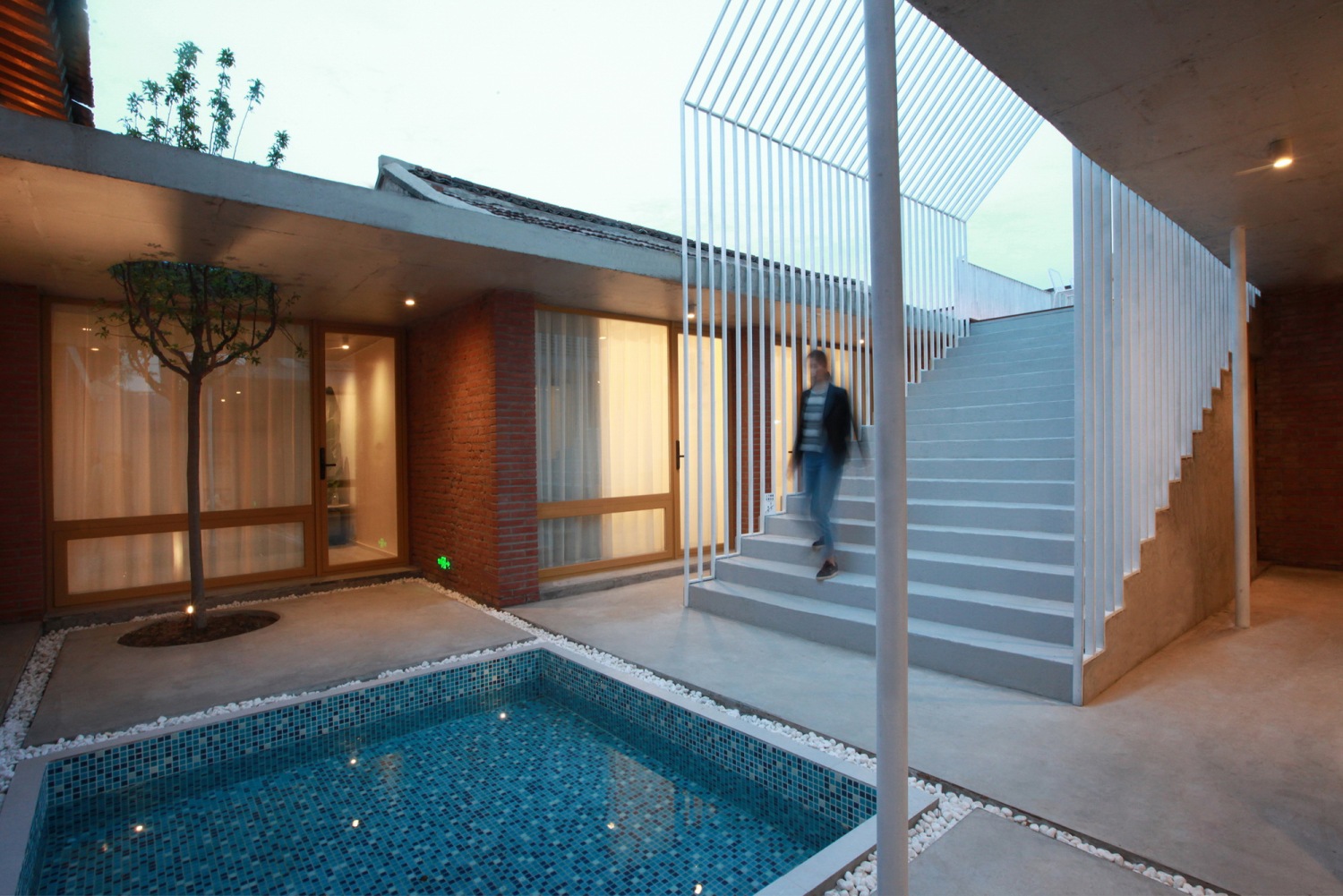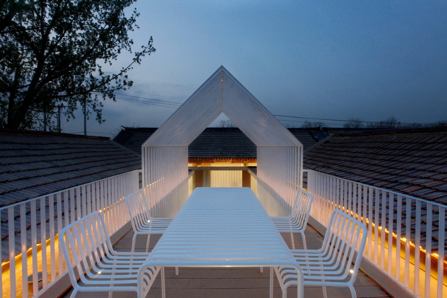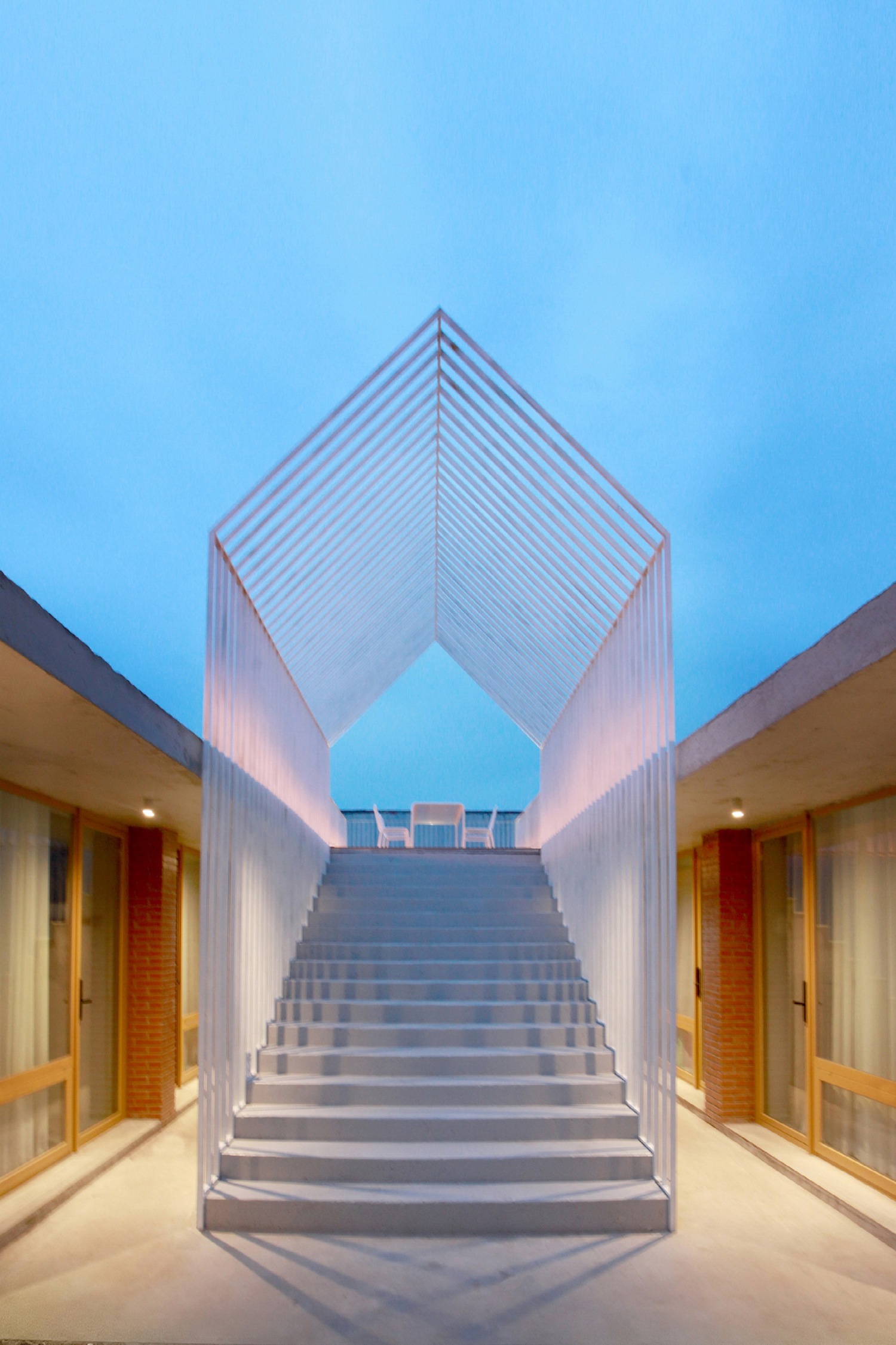在东西厢房之间的院落预制直达屋顶的楼梯,采用现代化的构筑物营造灰空间以此激活传统建筑形式,三角形构筑物的造型与硬山屋顶形成呼应,直达的楼梯将有限的院落空间延伸至无限的天空。楼梯下方空间与公区联通做下沉休闲空间,提升使用性能。楼梯与正房之间做浅水池,可减少院落积水的可能,同时满足不同的娱乐需求。