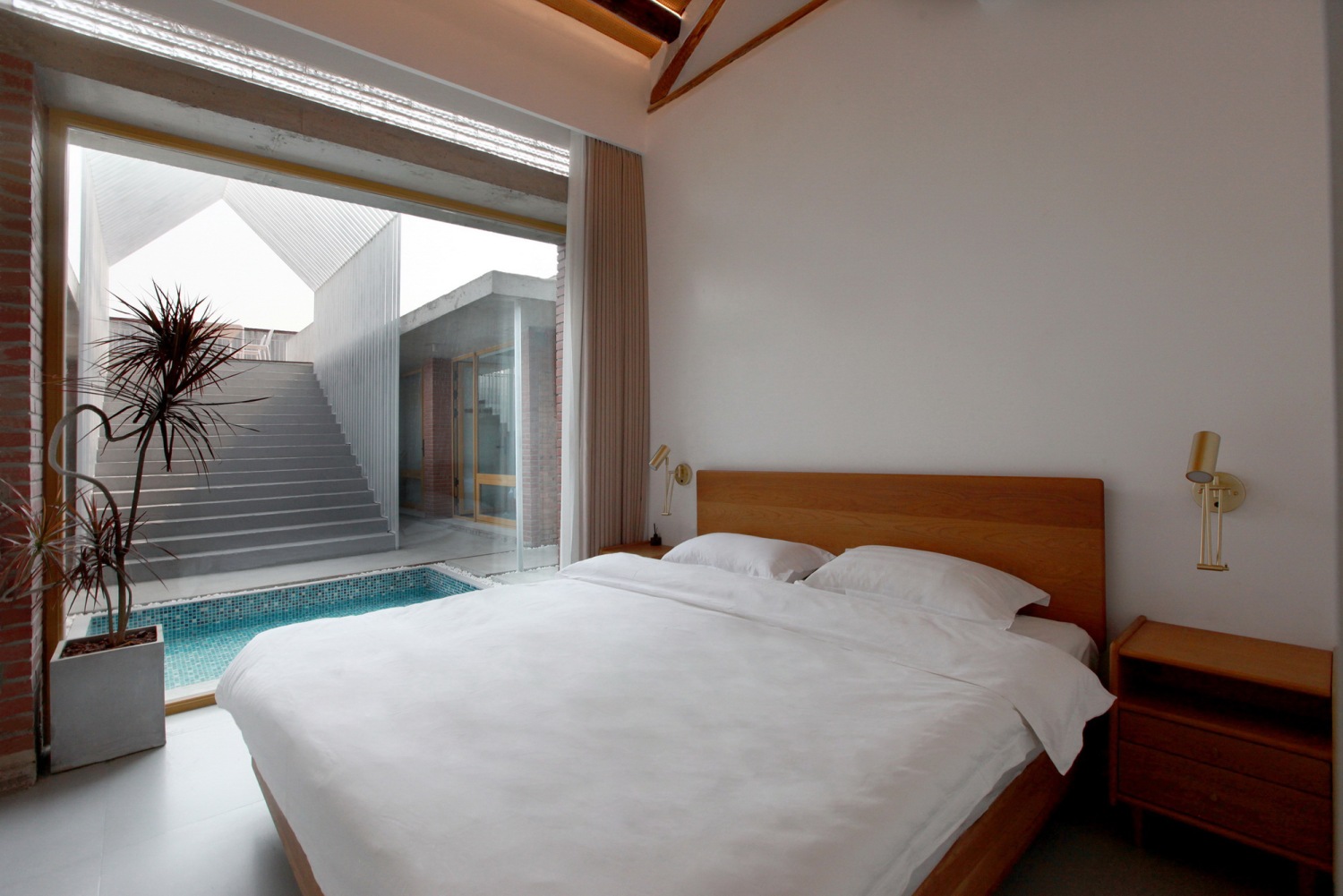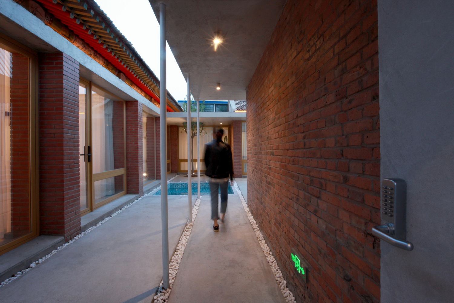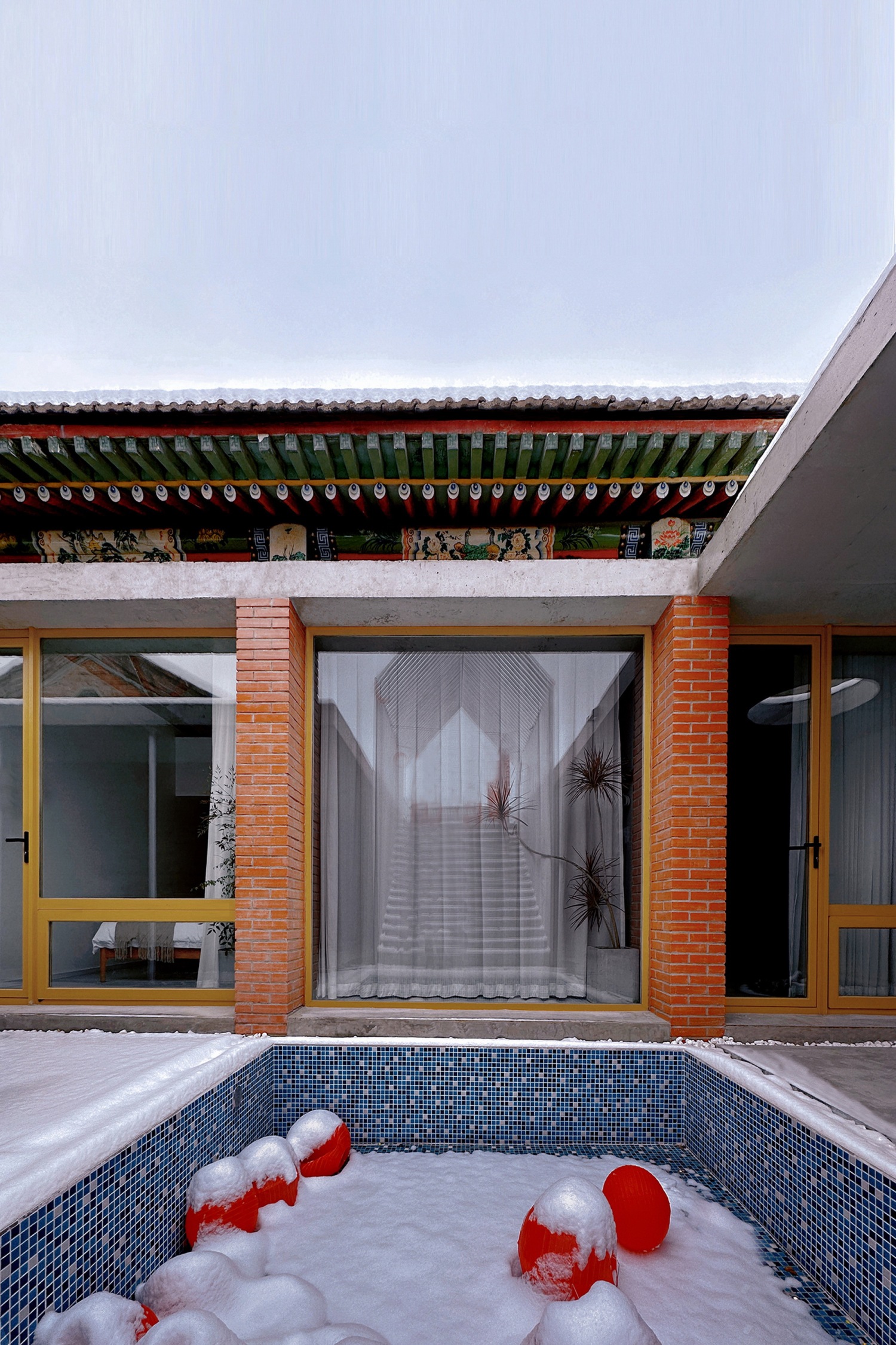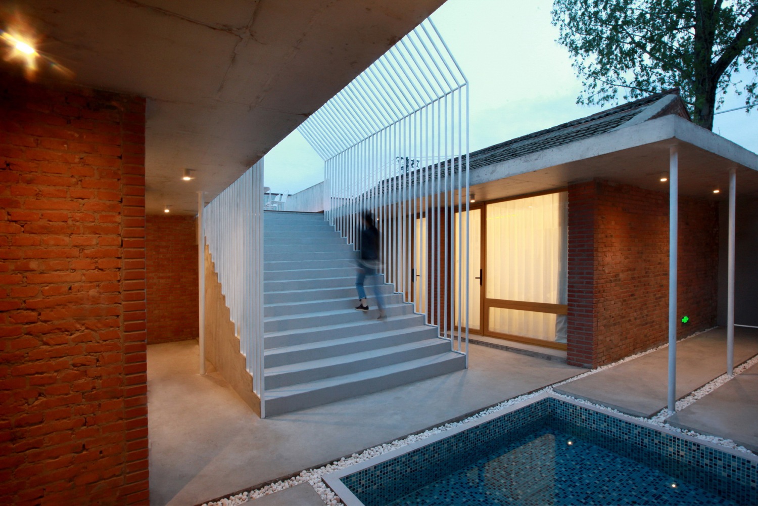 在东西厢房之间的院落预制直达屋顶的楼梯,采用现代化的构筑物营造灰空间以此激活传统建筑形式,三角形构筑物的造型与硬山屋顶形成呼应,直达的楼梯将有限的院落空间延伸至无限的天空。楼梯下方空间与公区联通做下沉休闲空间,提升使用性能。楼梯与正房之间做浅水池,可减少院落积水的可能,同时满足不同的娱乐需求。