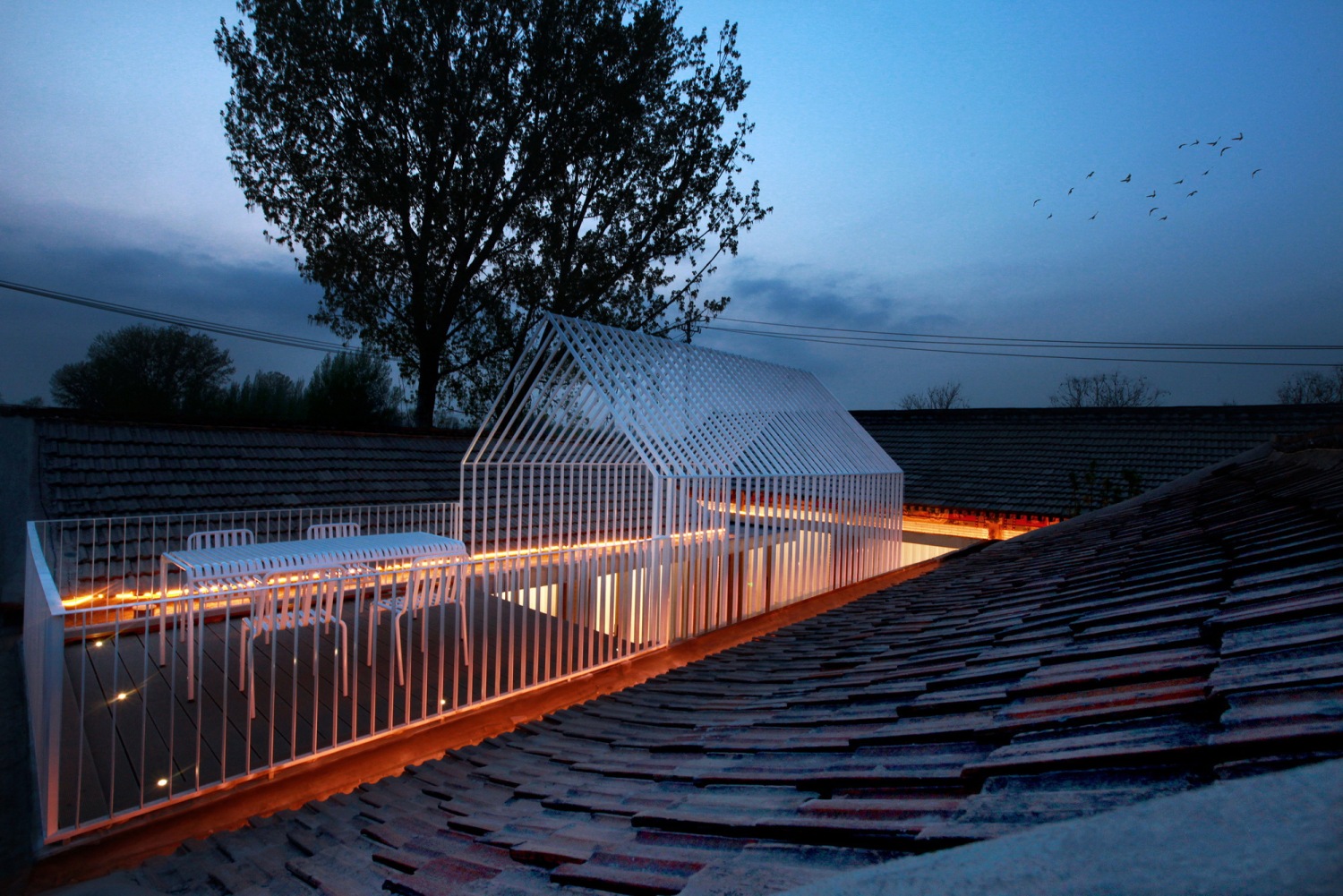 Prefabricate staircases that lead directly to the roof in the courtyard between the east and west wing rooms, and use modern structures to create a gray space to activate traditional architectural forms, The triangular structure is shaped in response to the Chinese gabled roof, and the direct staircase extends the limited courtyard space to the infinite sky.The space below the stairs is connected to the public area to create a sunken leisure space, improving its usability. Creating a shallow pool between the staircase and the main room can reduce the possibility of water accumulation in the courtyard and meet different entertainment needs.