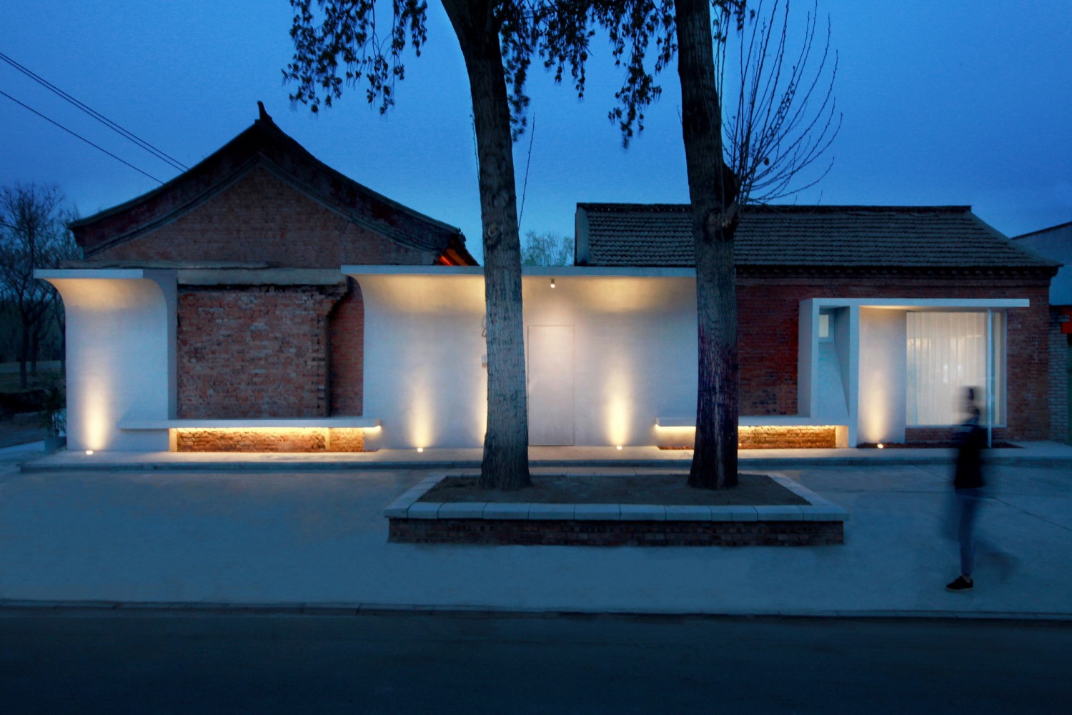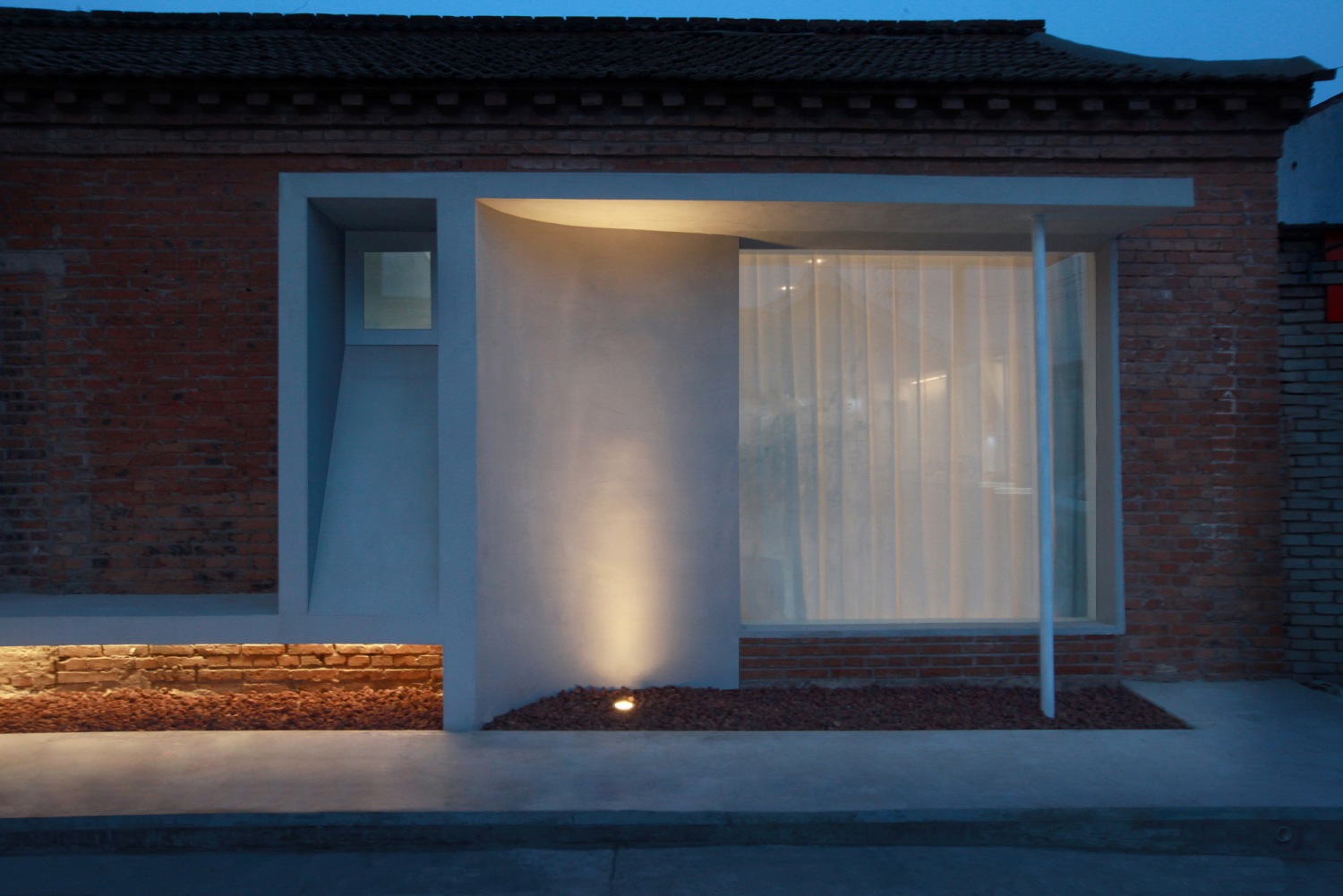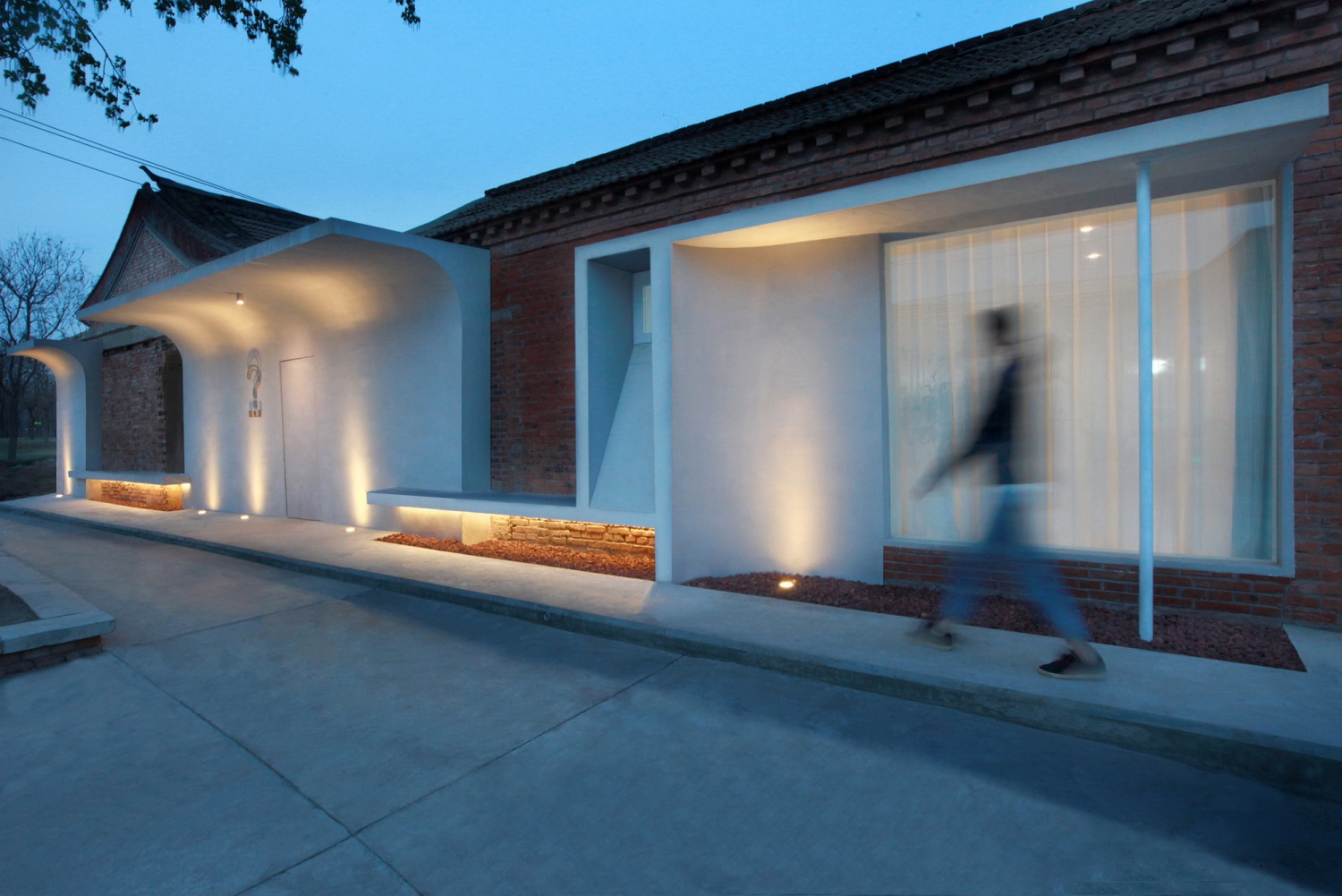 我们希望构筑一个让居者舒适的空间,根植于本土,融于自然。作为建筑记忆的一部分,建筑沿街立面保留了拆除建筑的红砖山墙,同时采用上弧墙体模拟传统建筑的屋檐形制,浅灰色预制混凝土墙面与保留的原红砖墙形成对比,纯粹而又不突兀。为了兼顾场地整体布局及村落交通流线,将主入口隐形化,弱化入口形象对建筑立面的影响。
