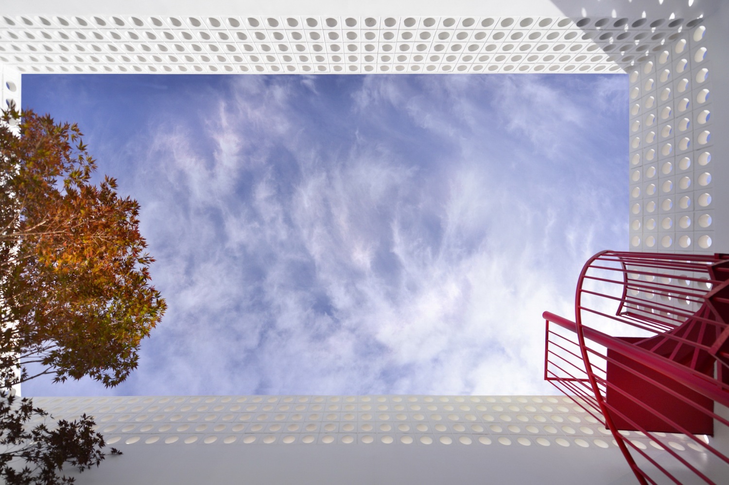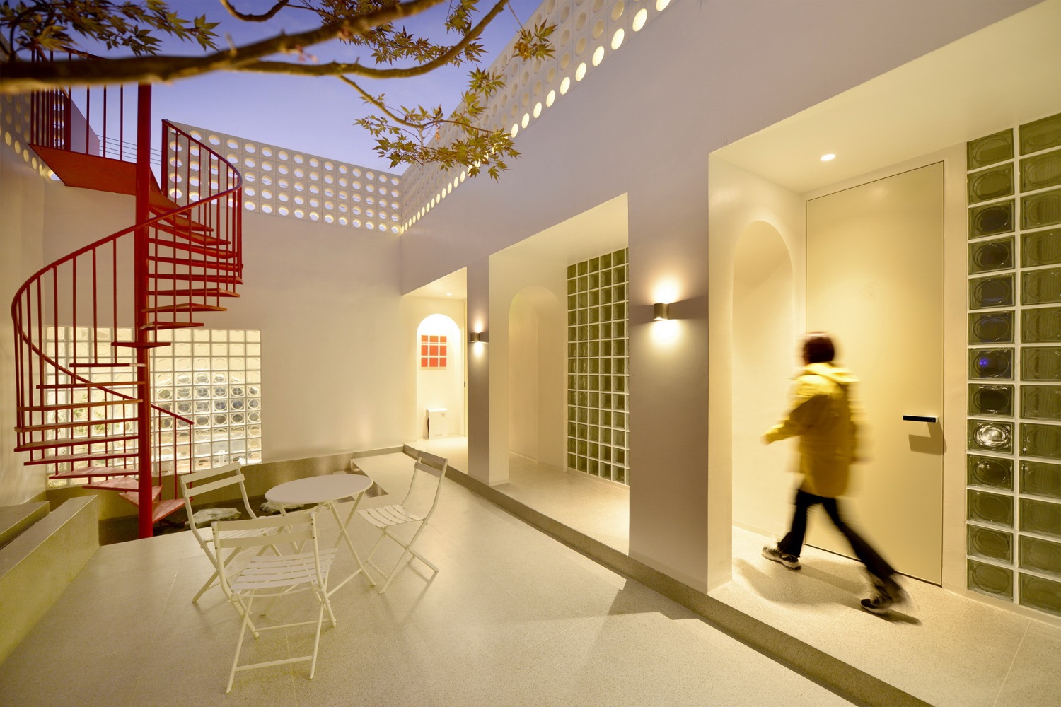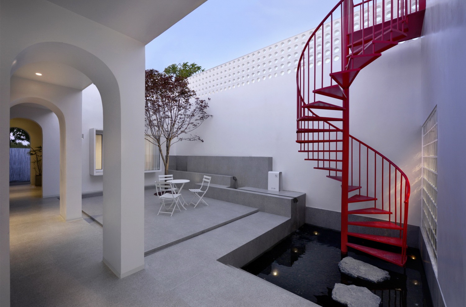 Passing through the public area and entering the courtyard, the entire building embraces the courtyard in a circular manner: a sunken observation fish pond, a circulating water landscape, a rotating staircase that leads directly to the roof platform, and the swaying red maple trees are completely surrounded by the building. The inner courtyard is isolated from the outside world, far away from the hustle and bustle of the city. The elevated parapet wall enhances the centripetal nature of the enclosed space and creates a unique sense of belonging.